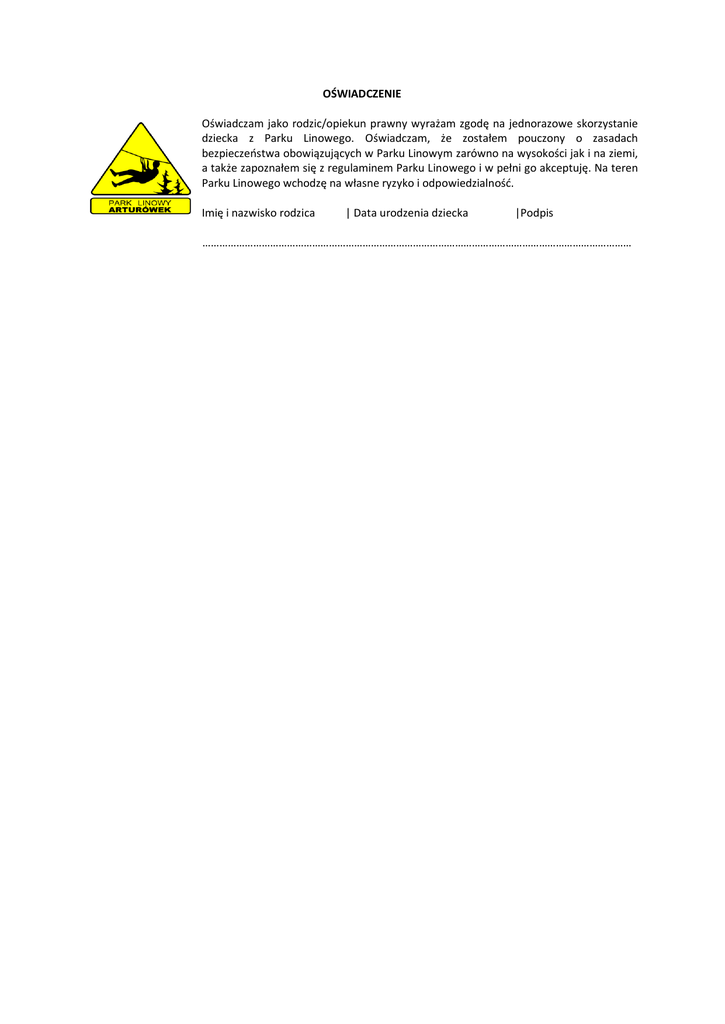 OŚWIADCZENIE Oświadczam jako rodzic/opiekun prawny wyrażam zgodę na jednorazowe skorzystanie dziecka z Parku Linowego. Oświadczam, że zostałem pouczony o zasadach bezpieczeostwa obowiązujących w Parku Linowym zarówno na wysokości jak i na ziemi, a także zapoznałem się z regulaminem Parku Linowego i w pełni go akceptuję. Na teren Parku Linowego wchodzę na własne ryzyko i odpowiedzialnośd. Imię i nazwisko rodzica | Data urodzenia dziecka |Podpis ………………………………………………………………………………………………………………………………………