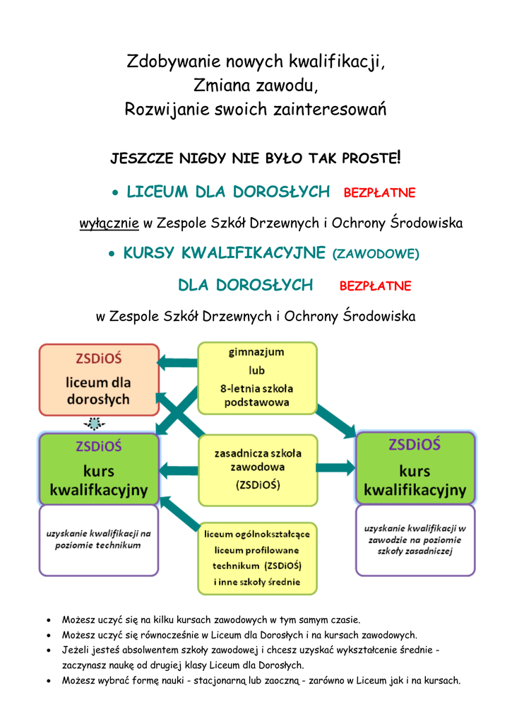 Zdobywanie nowych kwalifikacji, Zmiana zawodu, Rozwijanie swoich zainteresowań JESZCZE NIGDY NIE BYŁO TAK PROSTE! LICEUM DLA DOROSŁYCH BEZPŁATNE wyłącznie w Zespole Szkół Drzewnych i Ochrony Środowiska KURSY KWALIFIKACYJNE DLA DOROSŁYCH (ZAWODOWE) BEZPŁATNE w Zespole Szkół Drzewnych i Ochrony Środowiska Możesz uczyć się na kilku kursach zawodowych w tym samym czasie. Możesz uczyć się równocześnie w Liceum dla Dorosłych i na kursach zawodowych. Jeżeli jesteś absolwentem szkoły zawodowej i chcesz uzyskać wykształcenie średnie zaczynasz naukę od drugiej klasy Liceum dla Dorosłych. Możesz wybrać formę nauki - stacjonarną lub zaoczną - zarówno w Liceum jak i na kursach. ZESPÓŁ SZKÓŁ DRZEWNYCH I OCHRONY ŚRODOWISKA Kursy kwalifikacyjne: OZN. NAZWA KWALIFIKACJI MIN. LICZBA GODZ.* KWALIFIKACJA W ZAWODZIE Dodatkowe kwalifikacje Dodatkowe kwalifikacje TECHNIK TECHNOLOGII DREWNA STOLARZ A.50 - - SPRZEDAWCA - TECHNIK HANDLOWIEC TECHNIK KSIĘGARSTWA A.22 A.50 - technik technologii drewna A.22 -technik handlowiec A.21 - technik księgarstwa A.21 - technik księgarstwa A.21 A.22 -technik handlowiec TECHNIK USŁUG FRYZJERSKICH FRYZJER A.23 - - A.23 - technik usług fryzjerskich TECHNIK USŁUG FRYZJERSKICH TECHNIK LOGISTYKI A.19 - A.31 A.32 - forma stacjonarna** /forma zaoczna*** A.13 A.18 A.19 WYTWARZANIE WYROBÓW STOLARSKICH PROWADZENIE SPRZEDAŻY WYKONYWANIE ZABIEGÓW FRYZJERSKICH 800/520 700/455 800/520 A.23 PROJEKTOWANIE FRYZUR 250/163 A.30 ORGANZACJA I MONITOROWANIE PRZEPŁYWU ZASOBÓW INFORMACJI W PROCESACH PRODUKCJI, DYSTRYBUCJI I MAGAZYNOWANIA 420/273 umożliwiające uzyskanie dyplomu w danym zawodzie umożliwiające uzyskanie dyplomu w innym zawodzie A.31 ZARZĄDZANIE ŚRODKAMI TECHNICZNYMI PODCZAS RELIZACJI PROCESÓW TRANSPORTOWYCH ORGANIZACJA I MONITOROWANIE PRZEPŁYWU ZASOBÓW I INFORMACJI W JEDNOSTCE ORGANIZACYJNEJ ORGANIZACJA I PROWADZENIE PROCESÓW PRZETWARZANIA DREWNA 310/202 TECHNIK LOGISTYKI 250/163 TECHNIK LOGISTYK 250/163 R.7 OCENA STANU ŚRODOWISKA 500/325 R.8 PLANOWANIE I REALIZACJA ZADAŃ ZWIĄZANYCH Z OCHRONĄ ŚRODOWISKA PRODUKCJA WYROBÓW SPOŻYWCZYCH Z WYKORZYSTANIEM MASZYN I URZĄDZEŃ 650/423 TECHNIK TECHNOLOGII DREWNA TECHNIK OCHRONY ŚRODOWISKA TECHNIK OCHRONY ŚRODOWISKA TECHNIK TECHNOLOGII ŻYWNOŚCI OPERATOR MASZYN I URZADZEŃ PRZEMYSŁU SPOŻYWCZEGO A.32 A.50 T.2 T.3 T.4 T.5 PRODUKCJA WYROBÓW PIEKARSKICH PRODUKCJA WYROBÓW CUKIERNICZYCH PRODUKCJA PRZETWORÓW MIĘSNYCH I TŁUSZCZOWYCH 650/423 650/423 650/423 650/423 A.30 A.32 A.30 A.31 A.13 - R.8 - R.7 - T.16 - - T.17 - technik przetwórstwa mleczarskiego T.16 - technik technologii żywności TECHNIK PRZETWÓRSTWA MLECZARSKIEGO TECHNIK TECHNOLOGII ŻYWNOŚCI PIEKARZ T.17 - T.2 T.16 - TECHNIK TECHNOLOGII ŻYWNOŚCI CUKIERNIK T.2 T.16 TECHNIK T.2 - - T.16 - technik technologii żywności - T.16 - technik technologii żywności T.6 SPORZĄDZANIE POTRAW I NAPOJÓW 700/455 T.15 ORGANIZACJA ŻYWIENIA I USŁUG GASTRONOMICZNYCH 300/195 T.16 ORGANIZACJA I NADZOROWANIE PRODUKCJI WYROBÓW SPOŻYWCZYCH 170/111 TECHNOLOGII ŻYWNOŚCI WĘDLINIARZ T.16 TECHNIK ŻYWIENIA I USŁUG GASTRONOMICZNYCH KUCHARZ T.15 - T.15 -technik żywienia i usług gastronomicznych TECHNIK ŻYWIENIA I USŁUG GASTRONOMICZNYCH TECHNIK TECHNOLOGII ŻYWNOŚCI T.6 - - T.2 T.4 T.16 - technik technologii żywności T.3 lub lub T.5 lub - *W zależności od posiadanego wykształcenia i wybranej kwalifikacji liczba godzin dla uczestników kursów na poziomie zasadniczej szkoły zawodowej może zmniejszyć się o ok. 60% (jeżeli uczestnik kursu okaże zaświadczenie o odpowiedniej liczbie godzin przepracowanych w danym zawodzie). Dla wszystkich kursów liczba godzin może zwiększyć się o godziny niezbędne do realizacji tzw. efektów kształcenia wspólnych dla wszystkich zawodów (np. bhp) i właściwych dla danej grupy zawodów (np. język obcy zawodowy) lub praktyki zawodowe. ** zajęcia trzy razy w tygodniu ***zajęcia co dwa tygodnie (dwa dni co dwa tygodnie np. piątek-sobota, sobota-niedziela) KURSY SĄ BEZPŁATNE Kursy są uruchamiane w każdym czasie - liczba słuchaczy niezbędnych do uruchomienia kursu wynosi 20 Zapisy w sekretariacie szkoły od 1 czerwca 2013r.