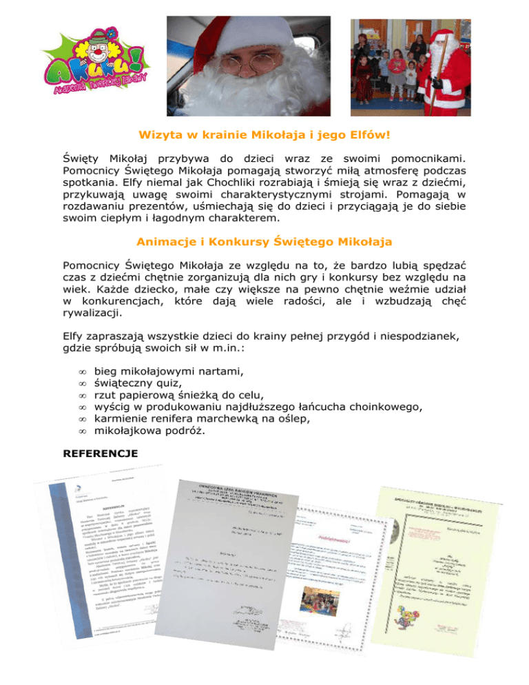 Wizyta w krainie Mikołaja i jego Elfów! Święty Mikołaj przybywa do dzieci wraz ze swoimi pomocnikami. Pomocnicy Świętego Mikołaja pomagają stworzyć miłą atmosferę podczas spotkania. Elfy niemal jak Chochliki rozrabiają i śmieją się wraz z dziećmi, przykuwają uwagę swoimi charakterystycznymi strojami. Pomagają w rozdawaniu prezentów, uśmiechają się do dzieci i przyciągają je do siebie swoim ciepłym i łagodnym charakterem. Animacje i Konkursy Świętego Mikołaja Pomocnicy Świętego Mikołaja ze względu na to, że bardzo lubią spędzać czas z dziećmi chętnie zorganizują dla nich gry i konkursy bez względu na wiek. Każde dziecko, małe czy większe na pewno chętnie weźmie udział w konkurencjach, które dają wiele radości, ale i wzbudzają chęć rywalizacji. Elfy zapraszają wszystkie dzieci do krainy pełnej przygód i niespodzianek, gdzie spróbują swoich sił w m.in.: • • • • • • bieg mikołajowymi nartami, świąteczny quiz, rzut papierową śnieżką do celu, wyścig w produkowaniu najdłuższego łańcucha choinkowego, karmienie renifera marchewką na oślep, mikołajkowa podróż. REFERENCJE Animatorzy z Akademii Twórczej Zabawy „A Ku Ku” to świetny pomysł na: dni miasta, pikniki rodzinne, wizyty w przedszkolu, mikołajki, dożynki, bale karnawałowe, festyny, otwarcia sklepów. CENNIK FORMA SPOTKANIA INTERAKTYWNY PROGRAM CZAS WYSTĘPU 90-120 minutowe spotkanie SKŁAD ZESPOŁU 3 osoby (Mikołaj + dwóch wesolutkich elfów) RODZAJ SPOTKANIA Interaktywny program, angażujemy dzieci oraz dorosłych, akcja, reakcja, interakcja Drobne upominki – zapewnia organizator (torba, plecak, gadżety etc). INNE KOSZTY DOJAZDU ARTYSTÓW Bez dodatkowych opłat CENA 3 000 zł brutto lub 2 000 zł brutto* *2000 zł brutto dotyczy klientów, którzy dokonali rezerwacji spotkania do końca października Kontakt www.klaunnatelefon.pl, [email protected], tel. 503 055 499