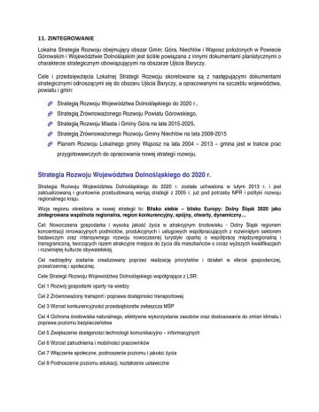 11. ZINTEGROWANIE Lokalna Strategia Rozwoju obejmujący obszar Gmin: Góra, Niechlów i Wąsosz połoŜonych w Powiecie Górowskim i Województwie Dolnośląskim jest ściśle powiązana z innymi dokumentami planistycznymi o charakterze strategicznym obowiązującymi na obszarze Ujścia Baryczy. Cele i przedsięwzięcia Lokalnej Strategii Rozwoju skorelowane są z następującymi dokumentami strategicznymi odnoszącymi się do obszaru Ujścia Baryczy, a opracowanymi na szczeblu województwa, powiatu i gmin: Strategią Rozwoju Województwa Dolnośląskiego do 2020 r., Strategią ZrównowaŜonego Rozwoju Powiatu Górowskiego, Strategią Rozwoju Miasta i Gminy Góra na lata 2015-2025, Strategią ZrównowaŜonego Rozwoju Gminy Niechlów na lata 2009-2015 Planem Rozwoju Lokalnego gminy Wąsosz na lata 2004 – 2013 – gmina jest w trakcie prac przygotowawczych do opracowania nowej strategii rozwoju. Strategia Rozwoju Województwa Dolnośląskiego do 2020 r. Strategia Rozwoju Województwa Dolnośląskiego do 2020 r. została uchwalona w lutym 2013 r. i jest zaktualizowaną i gruntownie przebudowaną wersją strategii z 2005 r. juŜ pod potrzeby NPR i polityki rozwoju regionalnego kraju. Wizja regionu określona w nowej strategii to: Blisko siebie – blisko Europy: Dolny Śląsk 2020 jako zintegrowana wspólnota regionalna, region konkurencyjny, spójny, otwarty, dynamiczny… Cel: Nowoczesna gospodarka i wysoka jakość Ŝycia w atrakcyjnym środowisku - Dolny Śląsk regionem koncentracji innowacyjnych podmiotów, produkcyjnych i usługowych współpracujących z rozwiniętym sektorem badawczym oraz intensywnego rozwoju nowoczesnej turystyki opartej o współpracę międzyregionalną i transgraniczną, tworzących razem atrakcyjne miejsce do Ŝycia dla mieszkańców o coraz wyŜszych kwalifikacjach i rozwiniętej kulturze obywatelskiej. Cel nadrzędny zostanie zrealizowany poprzez realizację priorytetów i działań w sferze gospodarczej, przestrzennej i społecznej. Cele Strategii Rozwoju Województwa Dolnośląskiego współgrające z LSR: Cel 1 Rozwój gospodarki oparty na wiedzy Cel 2 ZrównowaŜony transport i poprawa dostępności transportowej Cel 3 Wzrost konkurencyjności przedsiębiorstw zwłaszcza MŚP Cel 4 Ochrona środowiska naturalnego, efektywne wykorzystanie zasobów oraz dostosowanie do zmian klimatu i poprawa poziomu bezpieczeństwa Cel 5 Zwiększenie dostępności technologii komunikacyjno – informacyjnych Cel 6 Wzrost zatrudnienia i mobilności pracowników Cel 7 Włączenie społeczne, podnoszenie poziomu i jakości Ŝycia Cel 8 Podnoszenie poziomu edukacji, kształcenie ustawiczne Program Rozwoju Turystyki dla Województwa Dolnośląskiego został opracowany w 2009r. WdraŜanie załoŜeń przyjętych w programie ma przyczynić się do rozwoju turystyki w województwie dolnośląskim i wzrostu jego konkurencyjności oraz wykorzystania dostępnych regionalnych środków finansowych. Przedsięwzięcia zapisane w LSR współgrają z moŜliwościami finansowania działań inwestycyjnych w dziedzinach wyŜej wymienionych. Oznacza to, Ŝe działania realizowane na podstawie wspólnych przepisów EFIS mogą uzyskać efekt synergii z działaniami finansowanymi w zakresie wniosków składanych przez jednostki samorządu terytorialnego i inne uprawnione podmioty. Strategia ZrównowaŜonego Rozwoju Powiatu Górowskiego Strategia opracowana została w 2000 roku. Zgodnie z jej treścią: Misją powiatu jest optymalne zaspokojenie zbiorowych potrzeb jego mieszkańców przez wykonywanie zadań publicznych nie zastrzeŜonych ustawowo dla samorządu wojewódzkiego oraz samorządów gminnych a takŜe dla administracji rządowej i innych organów Państwa, z poszanowaniem środowiska i racjonalnym wykorzystaniem jego zasobów. Celem nadrzędnym rozwoju powiatu Góra jest wysoka jakość Ŝycia jego mieszkańców. Cel nadrzędny osiągnięty ma być dzięki realizacji celów głównych oraz celów szczegółowych, w które LSR wpisuje się w następujących zakresach: • Cel główny – Ochrona i kształtowanie środowiska przyrodniczego i kulturowego - cel szczegółowy - odnowa środowiska kulturowego i zagospodarowane obiekty zabytkowe • Cel główny – ZrównowaŜony rozwój społeczny - cel szczegółowy – rozwój kultury i integracji społeczności lokalnej; wyrównany poziom startu Ŝyciowego dla młodzieŜy z miast i wsi • Cel główny – ZrównowaŜony - cel szczegółowy - wysokie preferencje dla rozwoju małych i średnich przedsiębiorstw; atrakcyjne zagospodarowanie turystyczne powiatu • Cel główny – Ład w zarządzaniu - cel szczegółowy – wysoka aktywność organizacji pozarządowych; pełna integracja powiatu z województwem dolnośląskim Strategia Rozwoju Miasta i Gminy Góra na lata 2015-2025 Wizja: Gmina Góra miejscem przyjaznym do Ŝycia i prowadzenia działalności gospodarczej dla mieszkańców i przedsiębiorców LSR skorelowana jest ze strategia rozwoju miasta i gminy Góra poprzez spójność z następującymi celami strategicznymi: • Cel strategiczny - Aktywizacja gospodarcza i wzrost konkurencyjności Gminy Cel operacyjny 1 – poprawa warunków prowadzenia działalności gospodarczej w gminie; Cel operacyjny 2 – podniesienie atrakcyjności turystycznej gminy Góra • Cel strategiczny - Rozwój zasobów ludzkich oraz poprawa potencjału społecznego gminy Góra Cel operacyjny 1 – pobudzanie aktywności społeczności lokalnej w działaniach na rzecz rozwoju gminy Cel operacyjny 2 – poprawa jakości kształcenia dzieci, młodzieŜy i dorosłych w gminie Góra Cel operacyjny 3 – rozwój infrastruktury społecznej • Cel strategiczny – Modernizacja i rozbudowa infrastruktury komunalnej gminy Góra Cel operacyjny 3 – poprawa jakości środowiska naturalnego w gminie Plan Rozwoju Lokalnego Gminy Wąsosz W Gminie Wąsosz trwają obecnie prace nad przystąpieniem do opracowania nowego dokumentu strategicznego dotyczącego kierunk