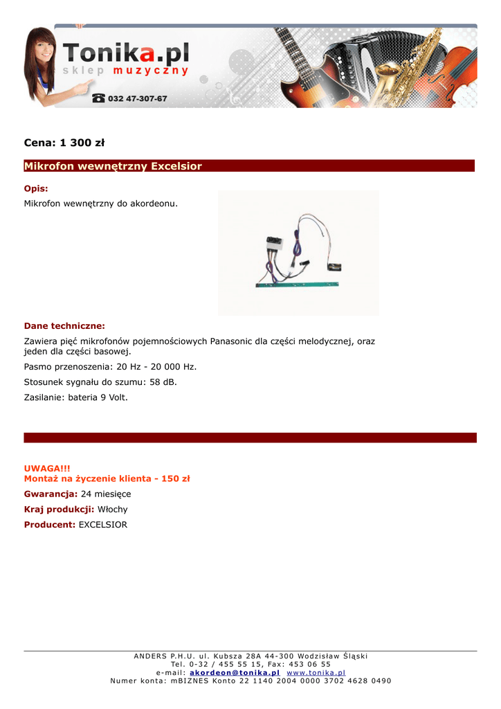 Cena: 1 300 zł Mikrofon wewnętrzny Excelsior Opis: Mikrofon wewnętrzny do akordeonu. Dane techniczne: Zawiera pięć mikrofonów pojemnościowych Panasonic dla części melodycznej, oraz jeden dla części basowej. Pasmo przenoszenia: 20 Hz - 20 000 Hz. Stosunek sygnału do szumu: 58 dB. Zasilanie: bateria 9 Volt. UWAGA!!! Montaż na życzenie klienta - 150 zł Gwarancja: 24 miesięce Kraj produkcji: Włochy Producent: EXCELSIOR A N D E R S P. H . U . u l . Ku b s z a 2 8 A 4 4 - 3 0 0 Wo d z i s ł a w Ś l ą s k i Te l . 0 - 3 2 / 4 5 5 5 5 1 5 , Fa x : 4 5 3 0 6 5 5 e - m a i l : a k o r d e o n @ t o n i k a . p l w w w. t o n i k a . p l N u m e r k o n t a : m B I Z N E S Ko n t o 2 2 1 1 4 0 2 0 0 4 0 0 0 0 3 7 0 2 4 6 2 8 0 4 9 0