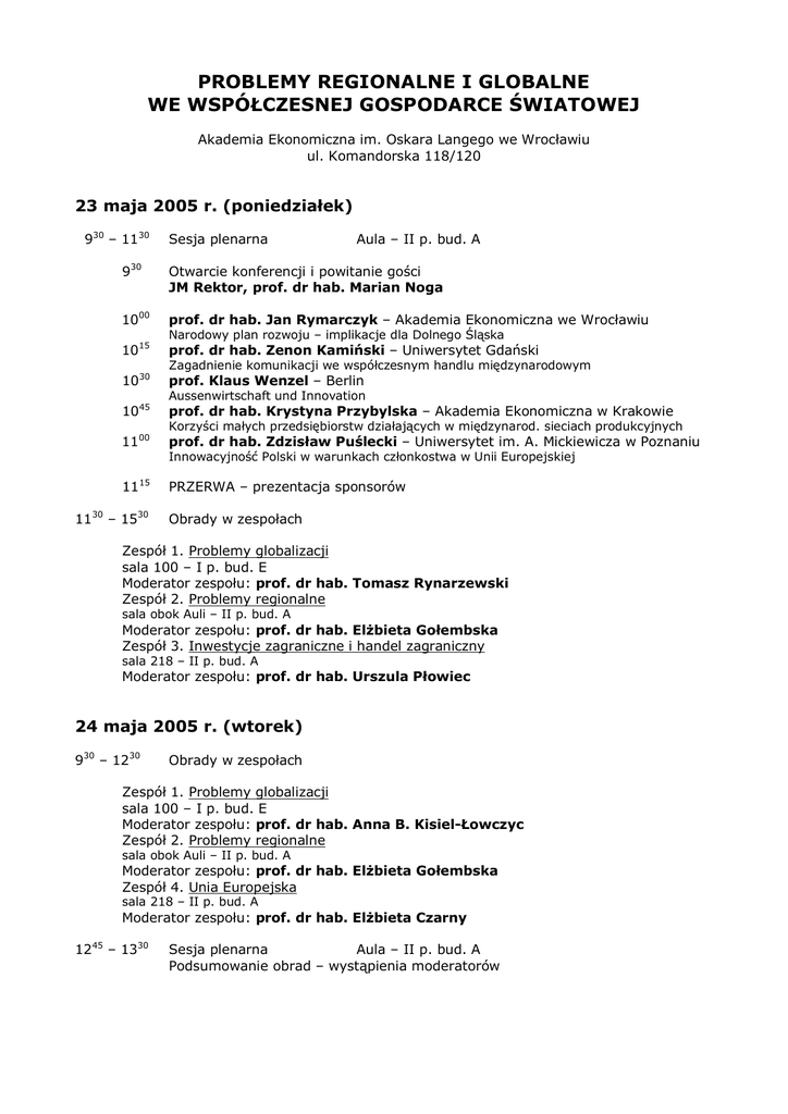 PROBLEMY REGIONALNE I GLOBALNE WE WSPÓŁCZESNEJ GOSPODARCE ŚWIATOWEJ Akademia Ekonomiczna im. Oskara Langego we Wrocławiu ul. Komandorska 118/120 23 maja 2005 r. (poniedziałek) 930 – 1130 Sesja plenarna Aula – II p. bud. A 930 Otwarcie konferencji i powitanie gości JM Rektor, prof. dr hab. Marian Noga 1000 prof. dr hab. Jan Rymarczyk – Akademia Ekonomiczna we Wrocławiu Narodowy plan rozwoju – implikacje dla Dolnego Śląska 1015 prof. dr hab. Zenon Kamiński – Uniwersytet Gdański Zagadnienie komunikacji we współczesnym handlu międzynarodowym 1030 prof. Klaus Wenzel – Berlin Aussenwirtschaft und Innovation 1045 prof. dr hab. Krystyna Przybylska – Akademia Ekonomiczna w Krakowie Korzyści małych przedsiębiorstw działających w międzynarod. sieciach produkcyjnych 1100 prof. dr hab. Zdzisław Puślecki – Uniwersytet im. A. Mickiewicza w Poznaniu Innowacyjność Polski w warunkach członkostwa w Unii Europejskiej 1115 1130 – 1530 PRZERWA – prezentacja sponsorów Obrady w zespołach Zespół 1. Problemy globalizacji sala 100 – I p. bud. E Moderator zespołu: prof. dr hab. Tomasz Rynarzewski Zespół 2. Problemy regionalne sala obok Auli – II p. bud. A Moderator zespołu: prof. dr hab. Elżbieta Gołembska Zespół 3. Inwestycje zagraniczne i handel zagraniczny sala 218 – II p. bud. A Moderator zespołu: prof. dr hab. Urszula Płowiec 24 maja 2005 r. (wtorek) 930 – 1230 Obrady w zespołach Zespół 1. Problemy globalizacji sala 100 – I p. bud. E Moderator zespołu: prof. dr hab. Anna B. Kisiel-Łowczyc Zespół 2. Problemy regionalne sala obok Auli – II p. bud. A Moderator zespołu: prof. dr hab. Elżbieta Gołembska Zespół 4. Unia Europejska sala 218 – II p. bud. A Moderator zespołu: prof. dr hab. Elżbieta Czarny 1245 – 1330 Sesja plenarna Aula – II p. bud. A Podsumowanie obrad – wystąpienia moderatorów Zespół 1. Problemy globalizacji 1. 2. 3. 4. 5. 6. 7. 8. 9. 10. 11. 12. 13. 14. 15. 16. 17. 18. 19. 20. 21. 22. 23. 24. 25. 26. 27. 28. 29. 30. 31. 32. 33. Mgr Katarzyna Bałandynowicz-Panfil, Uniw. Gdański, Problemy zarządzania personelem w społeczeństwach starzejących się Dr Jarosław Brach, AE Wrocław, Produkcja ciężarówek na początku XXI wieku: Chiny i Indie – największe wyzwania Dr Benedykt Bryłka, WSH, Podatki międzynarodowe na rynkach krajowym i zagranicznych Mgr Iwona Bujnowicz, Uniw. Łódzki, Rozwój nowych technologii a system finansowy – próba analizy związków pomiędzy systemem finansowym a stopniem wdrażania nowych technologii w wybranych krajach Dipl. jur. Nils Busch-Petersen, Berlin, Lobbyarbeit – Erfondernisse und Moeglichkeiten Mgr Konrad Czernichowski, Uniw. Wrocławski, Rola ruchu Fair Trade (Sprawiedliwego Handlu) w eliminowaniu niekorzystnych konsekwencji globalizacji dla krajów najsłabiej rozwiniętych Prof. Michał Dobroczyński, Uniw. Warszawski, Chiny jako nowy czynnik w globalnym układzie sił ekonomiczno-politycznych Dr Małgorzata Janicka, Uniw. Łódzki, Liberalizacja przepływu kapitału w świetle potencjalnych kosztów i korzyści Mgr Teresa Kasperska-Sporek, WSzZMiJO Katowice, Wpływ globalizacji na prognozy rozwoju liczby ludności świata i postulowane rozwiązania Prof. Anna Kisiel-Łowczyc, Uniw. Gdański, Konkurencyjność edukacyjna Krajów Regionu Morza Bałtyckiego (RMB) Dr Agnieszka Konopelko, Polit. Białostocka, Chiny jako globalny konsument Mgr Joanna Matoszko, Polit. Białostocka, Offshoring usług jako element polityki korporacji międzynarodowych Mgr Szymon Mazurek, AE Wrocław, Zjawisko pokusy nadużycia i jego rola podczas kryzysu azjatyckiego 1997 roku Mgr Bartosz Michalski, mgr Przemysław Witkowski, Uniw. Wrocławski, Polityczno-gospodarcze oblicza alterglobalizmu Dr Elżbieta Mirecka, AE Wrocław, Globalizacja finansowa a szara strefa finansowa Dr Wioletta Niemiec, Uniw. Wrocławski, Międzynarodowe reguły dotyczące przepływów kapitałów – Porozumienie TRIMS Mgr Urszula Opacka, Uniw. Gdański, Poczucie niepewności w miejscu pracy – przyczyny i konsekwencje dla organizacji Dr Agnieszka Piasecka-Głuszak, AE Wrocław, Procesy fuzji i przejęć w gospodarce światowej od końca XIX wieku do 2004 roku Mgr Andrzej Polus, Uniw. Wrocławski, Wspólnota Narodów na przełomie XX i XXI wieku. Rola Commonwealthu podczas negocjacji prowadzonych w ramach WTO Prof. Krystyna Przybylska, AE Kraków, Korzyści małych przedsiębiorstw działających w międzynarodowych sieciach produkcyjnych Prof. Jerzy Rymarczyk, AE Wrocław, Liberalizacja handlu usługami. Czy GATS spełnia nadzieje? Prof. Tomasz Rynarzewski, AE Poznań, Protekcjonizm w teorii handlu międzynarodowego i praktyce współczesnej gospodarki światowej Mgr Aleksandra Ruchniewicz, Uniw. Gdański, Obligacje na międzynarodowym rynku kapitałowym – wybrane zagadnienia Prof. Dorota Simpson, Uniw. Gdański, Zarządzanie wiedzą w korporacjach transnarodowych – przypadek Hewlett-Packard Dr Przemysław Skulski, AE Wrocław, Międzynarodowe otoczenie marketingowe przedsiębiorstwa Dr Beata Stępień, AE Poznań, Analiza form ekspansji międzynarodowej przedsiębiorstw z perspektywy teorii kosztów transakcyjnych Dr Aneta Stosik, mgr Piotr Głowicki, AWF Wrocław, Etyka biznesu w gospodarce globalnej Dr Adam Szymaniak, UAM, Offshoring w Azji Południowej i Wschodniej. Atrakcyjność inwestycyjna regionu Dr Maciej Szymczak, AE Poznań, Globalne uwarunkowania ewolucji łańcuchów dostaw Dr Magdalena Śliwińska, AE Poznań, Przedsiębiorstwa wielonarodowe jako główni aktorzy gospodarki globalnej Mgr Joanna Urbanek, Uniw. Wrocławski, Przegląd definicji oraz koncepcji dotyczących specyfiki przedsiębiorstw międzynarodowych Prof. Klaus Wenzel, Berlin, Aussenwirtschaft und Innovation Prof. Katarzyna Żukrowska, SGH, Determinanty i współzależności rozwoju regionalnego i globalnego na początku XXI wieku Zespół 2. Problemy regionalne 1. 2. 3. 4. 5. 6. 7. 8. 9. 10. 11. 12. 13. 14. 15. 16. 17. 18.