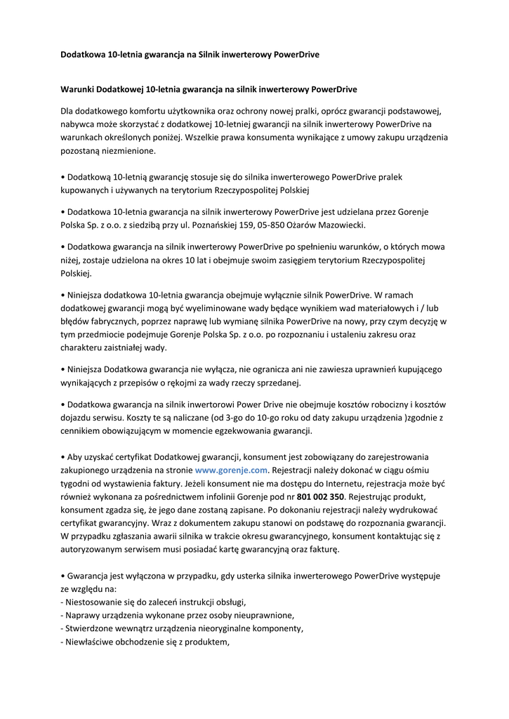 Dodatkowa 10-letnia gwarancja na Silnik inwerterowy PowerDrive Warunki Dodatkowej 10-letnia gwarancja na silnik inwerterowy PowerDrive Dla dodatkowego komfortu użytkownika oraz ochrony nowej pralki, oprócz gwarancji podstawowej, nabywca może skorzystać z dodatkowej 10-letniej gwarancji na silnik inwerterowy PowerDrive na warunkach określonych poniżej. Wszelkie prawa konsumenta wynikające z umowy zakupu urządzenia pozostaną niezmienione. • Dodatkową 10-letnią gwarancję stosuje się do silnika inwerterowego PowerDrive pralek kupowanych i używanych na terytorium Rzeczypospolitej Polskiej • Dodatkowa 10-letnia gwarancja na silnik inwerterowy PowerDrive jest udzielana przez Gorenje Polska Sp. z o.o. z siedzibą przy ul. Poznańskiej 159, 05-850 Ożarów Mazowiecki. • Dodatkowa gwarancja na silnik inwerterowy PowerDrive po spełnieniu warunków, o których mowa niżej, zostaje udzielona na okres 10 lat i obejmuje swoim zasięgiem terytorium Rzeczypospolitej Polskiej. • Niniejsza dodatkowa 10-letnia gwarancja obejmuje wyłącznie silnik PowerDrive. W ramach dodatkowej gwarancji mogą być wyeliminowane wady będące wynikiem wad materiałowych i / lub błędów fabrycznych, poprzez naprawę lub wymianę silnika PowerDrive na nowy, przy czym decyzję w tym przedmiocie podejmuje Gorenje Polska Sp. z o.o. po rozpoznaniu i ustaleniu zakresu oraz charakteru zaistniałej wady. • Niniejsza Dodatkowa gwarancja nie wyłącza, nie ogranicza ani nie zawiesza uprawnień kupującego wynikających z przepisów o rękojmi za wady rzeczy sprzedanej. • Dodatkowa gwarancja na silnik inwertorowi Power Drive nie obejmuje kosztów robocizny i kosztów dojazdu serwisu. Koszty te są naliczane (od 3-go do 10-go roku od daty zakupu urządzenia )zgodnie z cennikiem obowiązującym w momencie egzekwowania gwarancji. • Aby uzyskać certyfikat Dodatkowej gwarancji, konsument jest zobowiązany do zarejestrowania zakupionego urządzenia na stronie www.gorenje.com. Rejestracji należy dokonać w ciągu ośmiu tygodni od wystawienia faktury. Jeżeli konsument nie ma dostępu do Internetu, rejestracja może być również wykonana za pośrednictwem infolinii Gorenje pod nr 801 002 350. Rejestrując produkt, konsument zgadza się, że jego dane zostaną zapisane. Po dokonaniu rejestracji należy wydrukować certyfikat gwarancyjny. Wraz z dokumentem zakupu stanowi on podstawę do rozpoznania gwarancji. W przypadku zgłaszania awarii silnika w trakcie okresu gwarancyjnego, konsument kontaktując się z autoryzowanym serwisem musi posiadać kartę gwarancyjną oraz fakturę. • Gwarancja jest wyłączona w przypadku, gdy usterka silnika inwerterowego PowerDrive występuje ze względu na: - Niestosowanie się do zaleceń instrukcji obsługi, - Naprawy urządzenia wykonane przez osoby nieuprawnione, - Stwierdzone wewnątrz urządzenia nieoryginalne komponenty, - Niewłaściwe obchodzenie się z produktem, - Szkody spowodowane przez uderzenia mechaniczne z winy nabywcy lub osoby trzeciej, - Siłę wyższą (powódź, uderzenie pioruna, pożar itp.), - Korzystanie z urządzenia w celach biznesowych i zarobkowych. • Po zakończeniu naprawy lub wymianie silnika inwerterowego PowerDrive, części które zostały wymienione stają się własnością Gorenje Polska Sp. z o.o. • Naprawa serwisowa wykonana na podstawie niniejszej dodatkowej gwarancji nie przedłuża i nie odnawia gwarancji oraz nie wprowadza żadnych zmian w odniesieniu do ogólnego okresu gwarancyjnego, obowiązującego dla urządzenia jako całości. Gorenje Polska Sp. z o.o. Poznańska 159 05-850 Ożarów Mazowiecki