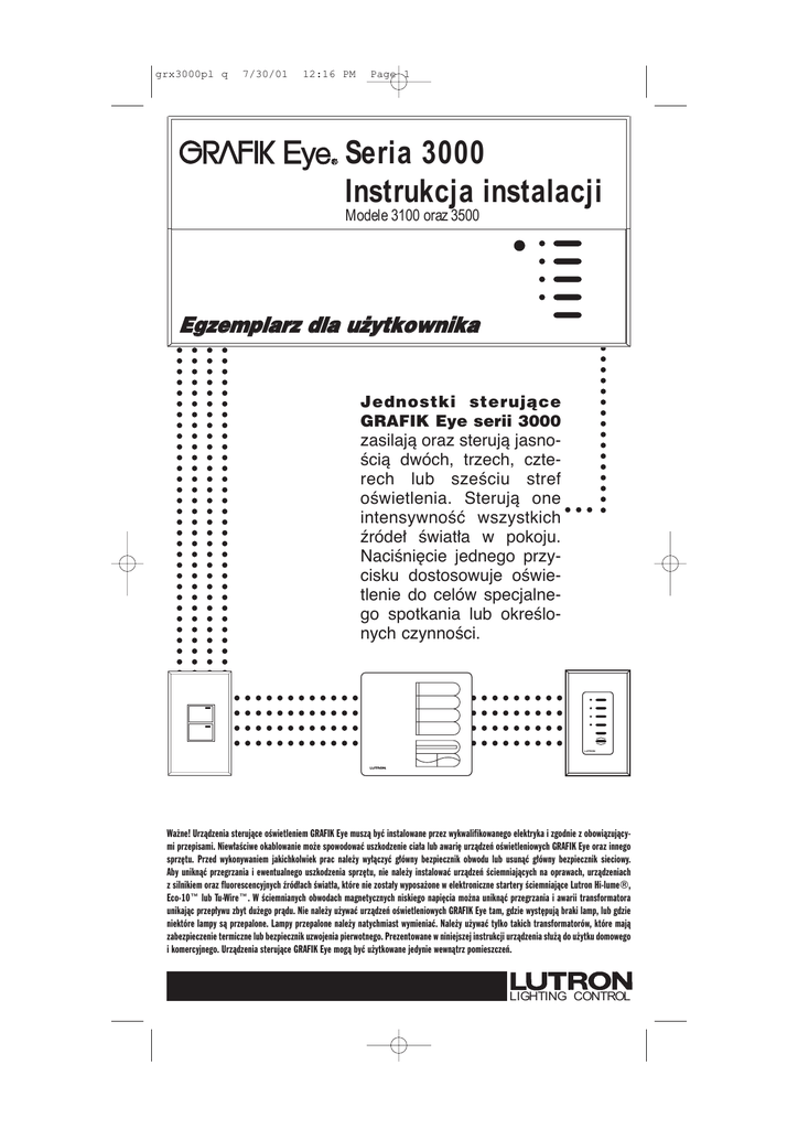 grx3000pl q 7/30/01 12:16 PM Page 1 Seria 3000 Instrukcja instalacji Modele 3100 oraz 3500 LUTRON Egzemplarz dla u˝ytkownika Jednostki sterujàce GRAFIK Eye serii 3000 zasilajà oraz sterujà jasnoÊcià dwóch, trzech, czterech lub szeÊciu stref oÊwietlenia. Sterujà one intensywnoÊç wszystkich êróde∏ Êwiat∏a w pokoju. NaciÊni´cie jednego przycisku dostosowuje oÊwietlenie do celów specjalnego spotkania lub okreÊlonych czynnoÊci. LUTRON Wa˝ne! Urzàdzenia sterujàce oÊwietleniem GRAFIK Eye muszà byç instalowane przez wykwalifikowanego elektryka i zgodnie z obowiàzujàcymi przepisami. Niew∏aÊciwe okablowanie mo˝e spowodowaç uszkodzenie cia∏a lub awari´ urzàdzeƒ oÊwietleniowych GRAFIK Eye oraz innego sprz´tu. Przed wykonywaniem jakichkolwiek prac nale˝y wy∏àczyç g∏ówny bezpiecznik obwodu lub usunàç g∏ówny bezpiecznik sieciowy. Aby uniknàç przegrzania i ewentualnego uszkodzenia sprz´tu, nie nale˝y instalowaç urzàdzeƒ Êciemniajàcych na oprawach, urzàdzeniach z silnikiem oraz fluorescencyjnych êród∏ach Êwiat∏a, które nie zosta∏y wyposa˝one w elektroniczne startery Êciemniajàce Lutron Hi-lume®, Eco-10™ lub Tu-Wire™. W Êciemnianych obwodach magnetycznych niskiego napi´cia mo˝na uniknàç przegrzania i awarii transformatora unikajàc przep∏ywu zbyt du˝ego pràdu. Nie nale˝y u˝ywaç urzàdzeƒ oÊwietleniowych GRAFIK Eye tam, gdzie wyst´pujà braki lamp, lub gdzie niektóre lampy sà przepalone. Lampy przepalone nale˝y natychmiast wymieniaç. Nale˝y u˝ywaç tylko takich transformatorów, które majà zabezpieczenie termiczne lub bezpiecznik uzwojenia pierwotnego. Prezentowane w niniejszej instrukcji urzàdzenia s∏u˝à do u˝ytku domowego i komercyjnego. Urzàdzenia sterujàce GRAFIK Eye mogà byç u˝ytkowane jedynie wewnàtrz pomieszczeƒ. LIGHTING CONTROL grx3000pl q 7/30/01 12:16 PM Page 2 . . . na stronie: Je˝eli masz: to przeczytaj . . . Tylko jednostk´ sterujàcà? Etap 1: Instalacja jednostek sterujàcych serii 3000 3 Jak okablowaç i zamontowaç jednostki sterujàce GRAFIK Eye serii 3000. Etap 2: Instalacja kontrolerów naÊciennych 4 Ustawiania adresów prze∏àczników DIP, okablowanie, i monta˝ Wykonaj Etap 1 oraz Etap 3 Równie˝ panel naÊcienny? Etap 3: Ustawianie jednostek sterujàcych 6 Identyfikacja typów obwodów sterowanych oraz ustawianie scen oÊwietlenia Pytania na temat okablowania Problemy? Etap 4: Ustawianie komunikacji systemu Przypisywanie kontrolerów naÊciennych do odpowiednich jednostek sterujàcych 10 Za∏àcznik A: Wi´cej na temat okablowania klasy 2/PELV 12 Za∏àcznik B: Na co zwróciç uwag´ przy monta˝u 14 Za∏àcznik C: Wzmacniacze mocy, elektroniczne interfejsy niskiego napi´cia oraz interfejsy fluorescencyjnych stateczników Êciemniajàcych 14 Za∏àcznik D: Interfejs startera GRX-TVI 0-10V 15 Za∏àcznik E: Modu∏y Êciemniajàce HP 2.4.6. 17 Za∏àcznik F: Pilot na podczerwieƒ 18 Za∏àcznik G: Post´powanie w przypadku problemów 18 Masz pytania? A mo˝e potrzebujesz pomocy technicznej? Telefoniczna linia pomocy... na ca∏ym Êwiecie! • W USA, Kanadzie i na Karaibach 1-800-523-9466 • W Meksyku oraz Ameryce Ârodkowej i Po∏udniowej 1-610-282-3800 • W Japonii 03-5405-7333 • W Hongkongu 2104-7733 • W Wielkiej Brytanii 0800-282-107 • W Europie 44-171-702-0657 • W innych miejscach Êwiata 1-610-282-3800 • Adres Internetowy: www.lutron.com • Poczta elektroniczna: [email protected] Gwarancja Lutron gwarantuje, ˝e ka˝dy nowy wyrób b´dzie wolny od wad materia∏owych i wykonawstwa, oraz ˝e b´dzie dzia∏a∏ w warunkach normalnego u˝ytkowania i obs∏ugi. Gwarancja niniejsza obowiàzuje jedynie na okres jednego roku od daty zakupu. Obowiàzki Lutronu wynikajàce z niniejszej gwarancji ograniczajà si´ do usuni´cia wady lub wymiany wadliwego elementu i pozostajà w mocy pod warunkiem, ˝e wadliwy element zostanie przys∏any do firmy Lutron na koszt nadawcy w terminie do 12 miesi´cy od daty zakupu. Gwarancja niniejsza nie obejmuje skutków niew∏aÊciwego obchodzenia si´ z urzàdzeniami, niew∏aÊciwego u˝ytkowania, a tak˝e niepoprawnego okablowania lub instalacji. W ˝adnym z tych przypadków Lutron ani jakikolwiek sprzedawca nie ponosi odpowiedzialnoÊci za jakàkolwiek strat´ lub szkod´ (w tym skutki lub uszkodzenia szczególne) wynikajàcà z niew∏aÊciwego u˝ytkowania wyrobu przez nabywc´ lub inne osoby; nabywca przyjmuje to do wiadomoÊci i nie wystàpi wobec Lutronu z roszczeniem w odniesieniu do takich strat. Podj´to wszelkie wysi∏ki w celu zapewnienia zgodnoÊci informacji katalogowych ze stanem aktualnym. Jednak˝e przed okreÊleniem danych technicznych lub zakupem wyrobu od firmy Lutron nale˝y sprawdziç i potwierdziç dost´pnoÊç wyrobu, dok∏adne dane techniczne i przydatnoÊç do zamierzonego zastosowania. Produkt mo˝e byç chroniony jednym lub wi´cej ni˝ jednym z nast´pujàcych patentów USA: 4,797,599; 4,803,380; 4,825,075; 4,893,062; 5,030,893; 5,191,265; 5,430,356; 5,463,286; 5,530,322; 5,808,417; DES 308,647; DES 310,349; DES 311,170; DES 311,371; DES 311,382; DES 311,485; DES 311,678; DES 313,738; DES 335,867; DES 344,264; DES 370,663; DES 378,814 lub odpowiednimi patentami zagranicznymi. Trwa post´powanie patentowe USA i zagraniczne. Lutron, GRAFIK Eye oraz Hi-lume to zastrze˝one znaki handlowe; Hi-Power, Eco-10, LIAISON, Designer oraz Tu-Wire i Architrave to znaki handlowe firmy Lutron Electronics Co., Inc. ® Standardy bezpieczeƒstwa wymienione powy˝ej odnoszà si´ do jednego lub wi´cej produktów linii GRAFIK Eye. Szczegó∏owe informacje mo˝na uzyskaç u producenta. LUTRON - Systemy Wysokiej JakoÊci, zarejestrowane w ISO 9001. Strona 2 grx3000pl q 7/30/01 12:16 PM Page 3 ETAP 1: Instalacja jednostek sterujàcych Grafik Eye 3000 Rozdzia∏ niniejszy objaÊnia, w jaki sposób nale˝y instalowaç jednostki sterujàce i sprawdzaç, czy prawid∏owo wspó∏pracujà z wszystk