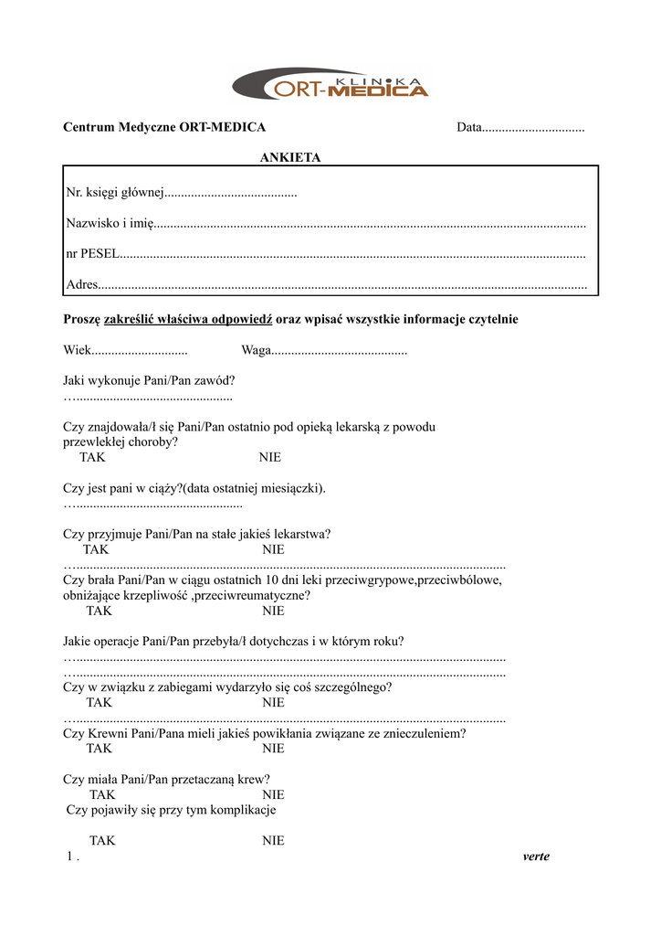 ● Do szpitala proszę zabrać :wyniki badań ,ankietę,zdjęcia rtg,kapcie i szlafrok..