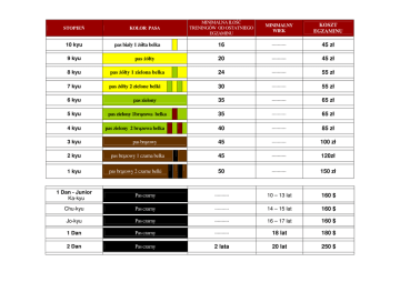 STOPIEŃ 10 kyu 9 kyu KOLOR PASA pas biały 1 żółta belka pas żółty MINIMALNA ILOŚĆ TRENINGÓW OD OSTATNIEGO EGZAMINU MINIMALNY WIEK KOSZT EGZAMINU 16 ---------- 45 zł 20 ---------- 45 zł 8 kyu pas żółty 1 zielona belka 24 ---------- 55 zł 7 kyu pas żółty 2 zielone belki 30 ---------- 55 zł 35 ---------- 65 zł 35 ---------- 65 zł 40 ---------- 85 zł 45 ---------- 100 zł 45 ---------- 120zł 50 ---------- 150 zł 6 kyu 5 kyu 4 kyu 3 kyu 2 kyu 1 kyu pas zielony pas zielony 1brązowa belka pas zielony 2 brązowa belka pas brązowy pas brązowy 1 czarna belka pas brązowy 2 czarne belki 1 Dan - Junior Ka-kyu Pas czarny ---------- 10 – 13 lat 160 $ Chu-kyu Pas czarny ---------- 14 – 15 lat 160 $ Jo-kyu Pas czarny ---------- 16 – 17 lat 160 $ 1 Dan Pas czarny ---------- 18 lat 180 $ 2 Dan Pas czarny 2 lata 20 lat 250 $
