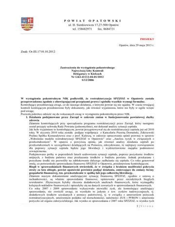P O W I A T O P A T O W S K I ul. H. Sienkiewicza 17,27-500 Opatów tel. 158682971 fax. 8684721 PROJEKT Opatów, dnia 29 maja 2013 r. Znak: Or.III.1710.10.2012 Zastrzeżenia do wystąpienia pokontrolnego Najwyższej Izby Kontroli Delegatury w Kielcach Nr LKI-41112-04-01/2012 S/12/2006 W wystąpieniu pokontrolnym NIK podkreślił, że restrukturyzacja SPZZOZ w Opatowie została przeprowadzona zgodnie z obowiązującymi przepisami prawa i spełniła wszelkie wymogi formalne. Kontrolujący przedstawiają uwagi, co do naszego działania, z którymi powiat się nie zgadza. W czasie trwającej kontroli kontrującym przedstawione były dokumenty, jak również wyjaśnienia, które nie były w ogóle wzięte pod uwagę. Pozwolę pokrótce odnieść się do wskazanych uwag w wystąpieniu pokontrolnym przez NIK. I. Działania podejmowane przez Zarząd w zakresie zmian w funkcjonowaniu powiatowej służby zdrowia Zdaniem kontrolujących przy sporządzaniu programu restrukturyzacji przez Zarząd, który następnie został przyjęty uchwałą Rady Powiatu (jednomyślnie), nie dokonał analizy sytuacji szpitala. Jak było wyjaśniane to kontrolującym, powiat przygotowywał się do restrukturyzacji szpitala już od 2010 roku. W styczniu 2010 roku została podjęta współpraca z Kancelaria Prawną Domański, Zakrzewski Pralina Spółka Komandytowa oraz z prof. Kuleszą, w zakresie opracowania opinii prawnej w sprawie „Wdrożenia modelu restrukturyzacji SPZZOZ w Opatowie” oraz „Analiza ryzyk w związanych z przekształceniem”. W oparciu o powyższą opinię, jak również analizy działania szpitali po przekształceniach w szczególności działających na Pomorzu, zdecydowano, że najlepszy rozwiązaniem dla poprawy sytuacji szpitala będzie jego likwidacji i wydzierżawienie majątku podmiotowi zewnętrznemu. Podejmowano próby w poprzednich latach uzdrowienia sytuacji szpitala, poprzez pozyskanie środków unijnych, z budżetu państwa oraz przekazania środków z budżetu powiatu. Jednak przekazane i pozyskane środki nie pozwoliły na zablokowanie dalszego zadłużania się szpitala. Co roku generował stratę, co potwierdzały sprawozdania finansowe SPZZOZ w Opatowie, przedstawione kontrolującym. Biegli w sprawozdaniach finansowych stwierdzili, że w związku z brakiem możliwości pokrycia straty za lata ubiegłe, powiat opatowski powinien podjąć działania, zmierzające do zmiany formy gospodarki finansowej, tzn. przekształcenie w spółkę lub jego całkowitą likwidację. Zdaniem naszym dokumentami analizującymi sytuację finansową SPZZOZ, zgodnie z ustawą o rachunkowości, są właśnie sprawozdania finansowe, opiniowane przez niezależnych biegłych rewidentów. Zbytecznym byłoby zlecenia dodatkowych analizach finansowych, które wymagałby kolejnych nakładów finansowych i opierałyby się na danych zawartych w sprawozdaniach finansowych. Co roku 2007 i 2009 sprawozdanie wykazywało niewielki zysk, ale kontrolujący analizujący sprawozdania, nie zwrócili uwagi, że wynikało to jedynie z tzw. zysków nadzwyczajnych, tj. dodatkowych środków uzyskanych z pomocy państwowej, tj. w związku z umorzeniem pożyczek restrukturyzacyjnych, umorzeniem podatku od nieruchomości, należności ZUS i PFRON i umorzenia pożyczki od organu założycielskiego. Jak wynika ze sprawozdania z 2007 roku SPZZOZ, w wyniku tych 1|Strona zysków nadzwyczajnych, wykazał zysk w wysokości 3.907.657 zł, przy czy już w następnym roku 2008, gdy nie otrzymał pomocy z budżetu państwa, wygenerował już stratę w wysokości 627.485 zł. Podobnie było w roku 2009, gdzie zysk w wysokości 115.016 zł, wynikał, również z zysku nadzwyczajnego w wysokości 619.577,54 zł (tj. z umorzenia pożyczki ze Skarbu Państwa). Jak wynika również ze sprawozdań finansowych 2007 - 2010 strata z lat ubiegłych powiększała się i na rok 2010 wyniosła 15.326.780 zł. SPZZOZ wykazał by jeszcze większą stratę, gdyby nie dotacje udzielone przez Powiat Opatowski, m.in: 1) 621.489,24 – dofinansowanie udziału własnego w Projekcie WND-RPSW.05.01.00-26-126/08 Wyposażenie Szpitala Powiatowego w Opatowie 2) 125.000 zł - dotacja celowa na dofinansowanie kosztów utrzymania powierzchni niewykończonej inwestycji - części nowego budynku szpitala w związku z koniecznością zapewnienia odpowiedniej temperatury dla znajdującej się w tych pomieszczeniach aparatury i sprzętu medycznego 3) 48.941,00 - Środki na sfinansowanie obsługi inwestycji (zobowiązania) 4) 335.000,00 - Dotacja związana z pokryciem kosztów funkcjonowania Biura Budowy Szpitala do czasu rozliczenia i przekazania inwestycji, w tym koszty mediów w nowym budynku szpitala 5) 96.999,18 - Dotacja celowa na zakup wyposażenia do nowego budynku szpitala ( m.in. zestawy sprzątające, ręczniki, kosze, pojemniki), 6) 340.000,000 - poręczenia kredytu bankowego ( kredyt w BS, zgodnie z uchwałą miał być zaciągnięty na spłatę zobowiązań z tytułu dostaw i usług). W roku 2011, również Powiat Opatowski przekazał środki dla SPZZOZ w Opatowie, m.in. 1) 79.379,70 - dofinansowanie udziału własnego w Projekcie WND-RPSW.05.01.00-26-126/08 Wyposażenie Szpitala Powiatowego w Opatowie; 2) 100.000,00 - dofinansowanie kosztów utrzymania powierzchni niewykończonej inwestycji - części nowego budynku szpitala w związku z koniecznością zapewnienia odpowiedniej temperatury, 3) 140.000,00 - środki przeznaczone na remont dachu na starym budynku szpitala Nadto SPZZOZ w Opatowie, uzyskał w kwietniu 2011 roku, kwotę 500.000,00 zł ze sprzedaży mienia ruchomego na rzecz Świętokrzyskiego Centrum Ratownictwa Medycznego i Transportu Sanitarnego w Kielcach, w wyniku likwidacji oddziału pomocy doraźnej funkcjonującego dotąd przy SPZZOZ. Pomimo przekazanych w/w kwot w 2011 roku przez Powiat Opatowski oraz uzyskania kwoty 500.000 zł ze sprzedaży mienia ruchomego, SPZZOZ w czerwcu 2011 roku, miał stratę bilansową za pierwsze półrocze 