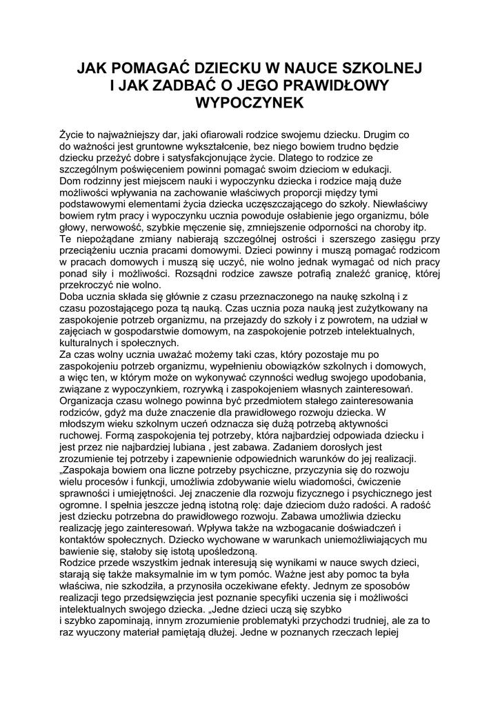 JAK POMAGAĆ DZIECKU W NAUCE SZKOLNEJ I JAK ZADBAĆ O JEGO PRAWIDŁOWY WYPOCZYNEK Życie to najważniejszy dar, jaki ofiarowali rodzice swojemu dziecku. Drugim co do ważności jest gruntowne wykształcenie, bez niego bowiem trudno będzie dziecku przeżyć dobre i satysfakcjonujące życie. Dlatego to rodzice ze szczególnym poświęceniem powinni pomagać swoim dzieciom w edukacji. Dom rodzinny jest miejscem nauki i wypoczynku dziecka i rodzice mają duże możliwości wpływania na zachowanie właściwych proporcji między tymi podstawowymi elementami życia dziecka uczęszczającego do szkoły. Niewłaściwy bowiem rytm pracy i wypoczynku ucznia powoduje osłabienie jego organizmu, bóle głowy, nerwowość, szybkie męczenie się, zmniejszenie odporności na choroby itp. Te niepożądane zmiany nabierają szczególnej ostrości i szerszego zasięgu przy przeciążeniu ucznia pracami domowymi. Dzieci powinny i muszą pomagać rodzicom w pracach domowych i muszą się uczyć, nie wolno jednak wymagać od nich pracy ponad siły i możliwości. Rozsądni rodzice zawsze potrafią znaleźć granicę, której przekroczyć nie wolno. Doba ucznia składa się głównie z czasu przeznaczonego na naukę szkolną i z czasu pozostającego poza tą nauką. Czas ucznia poza nauką jest zużytkowany na zaspokojenie potrzeb organizmu, na przejazdy do szkoły i z powrotem, na udział w zajęciach w gospodarstwie domowym, na zaspokojenie potrzeb intelektualnych, kulturalnych i społecznych. Za czas wolny ucznia uważać możemy taki czas, który pozostaje mu po zaspokojeniu potrzeb organizmu, wypełnieniu obowiązków szkolnych i domowych, a więc ten, w którym może on wykonywać czynności według swojego upodobania, związane z wypoczynkiem, rozrywką i zaspokojeniem własnych zainteresowań. Organizacja czasu wolnego powinna być przedmiotem stałego zainteresowania rodziców, gdyż ma duże znaczenie dla prawidłowego rozwoju dziecka. W młodszym wieku szkolnym uczeń odznacza się dużą potrzebą aktywności ruchowej. Formą zaspokojenia tej potrzeby, która najbardziej odpowiada dziecku i jest przez nie najbardziej lubiana , jest zabawa. Zadaniem dorosłych jest zrozumienie tej potrzeby i zapewnienie odpowiednich warunków do jej realizacji. „Zaspokaja bowiem ona liczne potrzeby psychiczne, przyczynia się do rozwoju wielu procesów i funkcji, umożliwia zdobywanie wielu wiadomości, ćwiczenie sprawności i umiejętności. Jej znaczenie dla rozwoju fizycznego i psychicznego jest ogromne. I spełnia jeszcze jedną istotną rolę: daje dzieciom dużo radości. A radość jest dziecku potrzebna do prawidłowego rozwoju. Zabawa umożliwia dziecku realizację jego zainteresowań. Wpływa także na wzbogacanie doświadczeń i kontaktów społecznych. Dziecko wychowane w warunkach uniemożliwiających mu bawienie się, stałoby się istotą upośledzoną. Rodzice przede wszystkim jednak interesują się wynikami w nauce swych dzieci, starają się także maksymalnie im w tym pomóc. Ważne jest aby pomoc ta była właściwa, nie szkodziła, a przynosiła oczekiwane efekty. Jednym ze sposobów realizacji tego przedsięwzięcia jest poznanie specyfiki uczenia się i możliwości intelektualnych swojego dziecka. „Jedne dzieci uczą się szybko i szybko zapominają, innym zrozumienie problematyki przychodzi trudniej, ale za to raz wyuczony materiał pamiętają dłużej. Jedne w poznanych rzeczach lepiej pamiętają szczegóły działające na zmysł wzroku (kolory, kształty), inne posługują się przede wszystkim słuchem. Jedne wykazują zdolności do zapamiętywania faktów, inne do matematycznej kalkulacji, a jeszcze inne do artystycznej kompozycji. Sukces dziecka w nauce zależy nie tylko od prawidłowego rozwoju umysłowego, ale także od fachowej pomocy i opieki rodziców, od ich kontaktu ze szkołą. Przyjemnie jest być ojcem lub matką inteligentnego dziecka, przyjemnie jest oglądać ciągle przynoszone ze szkoły do domu oceny bardzo dobre, wysłuchiwać na zebraniach i w prywatnych rozmowach z wychowawcą komplementów pod adresem naszych dzieci. Gorzej czujemy się, gdy dziecko nie spisuje się w szkole, tak jak byśmy sobie tego życzyli. Wtedy często unikamy kontaktu ze szkołą, nie chcąc słyszeć niepotrzebnych opinii o dziecku. A przecież dobro dziecka wymaga, aby odpowiednimi warunkami domowymi wyrównać braki w jego zdolnościach, wiedzy i charakterze. Kontakt ze szkołą i porozumiewanie się z nauczycielem mogą tylko dopomóc rodzicom w trudnej pracy wychowawczej. Istnieje wiele sposobów aby pomóc dziecku w nauce w domu. Najczęściej stosowaną formą jest pomoc w odrabianiu prac domowych. „Rodzice powinni przekonać dzieci, że prace zadawane do domu to nie żadna kara wyznaczona przez nauczyciela, ale sposób na lepsze opanowanie danego przedmiotu.”[3] To, bowiem, co dzieci wykonają w domu, spełnia specjalną rolę. Ma na celu przede wszystkim utrwalenie wiadomości i umiejętności zdobytych w szkole oraz zastosowanie ich w praktyce. Nie można wyręczać dzieci w odrabianiu prac domowych, a jedynie tak naprowadzić, aby samodzielnie pracowały. Rodzice, którzy odrabiają za dzieci prace domowe, kierują się fałszywą ambicją i dopuszczają się oszustwa w stosunku do nauczyciela, dając tym samym zły przykład swoim pociechom. Ma to jeszcze inne złe skutki, gdyż dezorientuje nauczyciela co do zaawansowania klasy w danej partii materiału. Nie ulega wątpliwości, że mniej zdolnym dzieciom trzeba pomóc, ale to nie znaczy, że trzeba im szkodzić przez odrabianie za nie lekcji. Musi to być pomoc mądra, przemyślana. Należy również stosować pochwałę i zachętę, gdyż to pobudza małego ucznia do działania i rozwija jego inwencję. To jest najlepsza pomoc i postawa rodziców. Duże znaczenie dla jakości pracy domowej mają warunki zewnętrzne, a przede wszystkim miejsce pracy. Dziecko powinno mieć własny kącik w pokoju, w którym przech