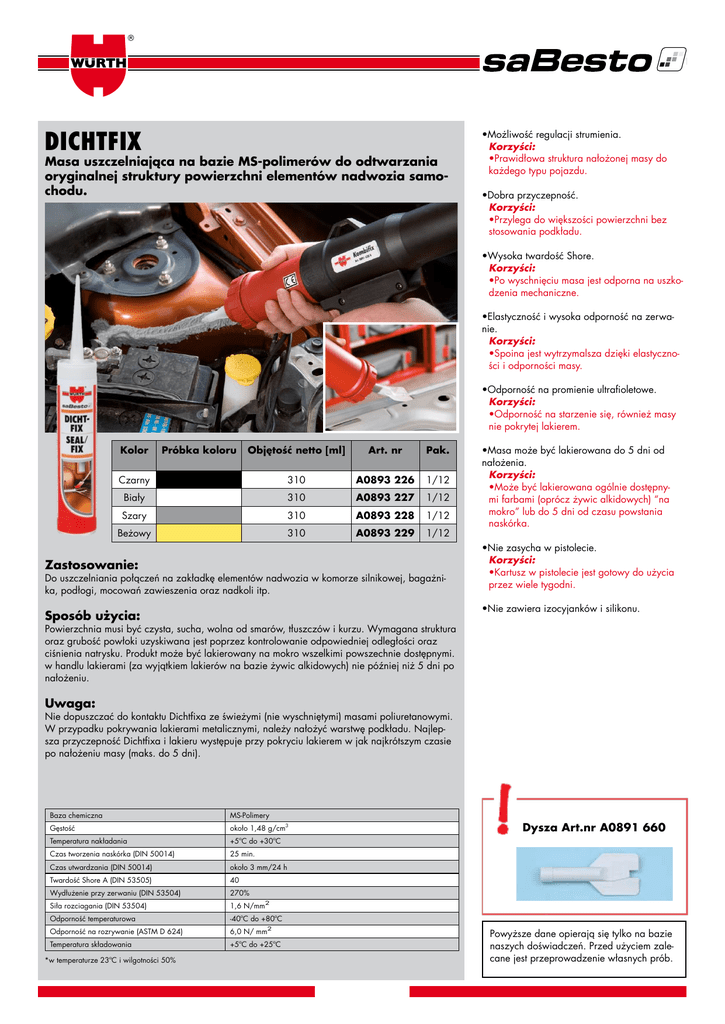 DICHTFIX Masa uszczelniająca na bazie MS-polimerów do odtwarzania oryginalnej struktury powierzchni elementów nadwozia samochodu. •Możliwość regulacji strumienia. Korzyści: •Prawidłowa struktura nałożonej masy do każdego typu pojazdu. •Dobra przyczepność. Korzyści: •Przylega do większości powierzchni bez stosowania podkładu. •Wysoka twardość Shore. Korzyści: •Po wyschnięciu masa jest odporna na uszkodzenia mechaniczne. •Elastyczność i wysoka odporność na zerwanie. Korzyści: •Spoina jest wytrzymalsza dzięki elastyczności i odporności masy. •Odporność na promienie ultrafioletowe. Korzyści: •Odporność na starzenie się, również masy nie pokrytej lakierem. Kolor Próbka koloru Objętość netto [ml] Art. nr Pak. 310 A0893 226 1/12 Czarny Biały 310 A0893 227 1/12 Szary 310 A0893 228 1/12 Beżowy 310 A0893 229 1/12 Zastosowanie: Do uszczelniania połączeń na zakładkę elementów nadwozia w komorze silnikowej, bagażnika, podłogi, mocowań zawieszenia oraz nadkoli itp. •Masa może być lakierowana do 5 dni od nałożenia. Korzyści: •Może być lakierowana ogólnie dostępnymi farbami (oprócz żywic alkidowych) “na mokro” lub do 5 dni od czasu powstania naskórka. •Nie zasycha w pistolecie. Korzyści: •Kartusz w pistolecie jest gotowy do użycia przez wiele tygodni. •Nie zawiera izocyjanków i silikonu. Sposób użycia: Powierzchnia musi być czysta, sucha, wolna od smarów, tłuszczów i kurzu. Wymagana struktura oraz grubość powłoki uzyskiwana jest poprzez kontrolowanie odpowiedniej odległości oraz ciśnienia natrysku. Produkt może być lakierowany na mokro wszelkimi powszechnie dostępnymi. w handlu lakierami (za wyjątkiem lakierów na bazie żywic alkidowych) nie później niż 5 dni po nałożeniu. Uwaga: Nie dopuszczać do kontaktu Dichtfixa ze świeżymi (nie wyschniętymi) masami poliuretanowymi. W przypadku pokrywania lakierami metalicznymi, należy nałożyć warstwę podkładu. Najlepsza przyczepność Dichtfixa i lakieru występuje przy pokryciu lakierem w jak najkrótszym czasie po nałożeniu masy (maks. do 5 dni). Baza chemiczna MS-Polimery Gęstość około 1,48 g/cm Temperatura nakładania +5ºC do +30ºC Czas tworzenia naskórka (DIN 50014) 25 min. Czas utwardzania (DIN 50014) około 3 mm/24 h Twardość Shore A (DIN 53505) 40 Wydłużenie przy zerwaniu (DIN 53504) 270% Siła rozciagania (DIN 53504) 1,6 N/mm Odporność temperaturowa -40ºC do +80ºC Odporność na rozrywanie (ASTM D 624) 6,0 N/ mm Temperatura składowania +5ºC do +25ºC *w temperaturze 23ºC i wilgotności 50% 3 Dysza Art.nr A0891 660 2 2 Powyższe dane opierają się tylko na bazie naszych doświadczeń. Przed użyciem zalecane jest przeprowadzenie własnych prób.
