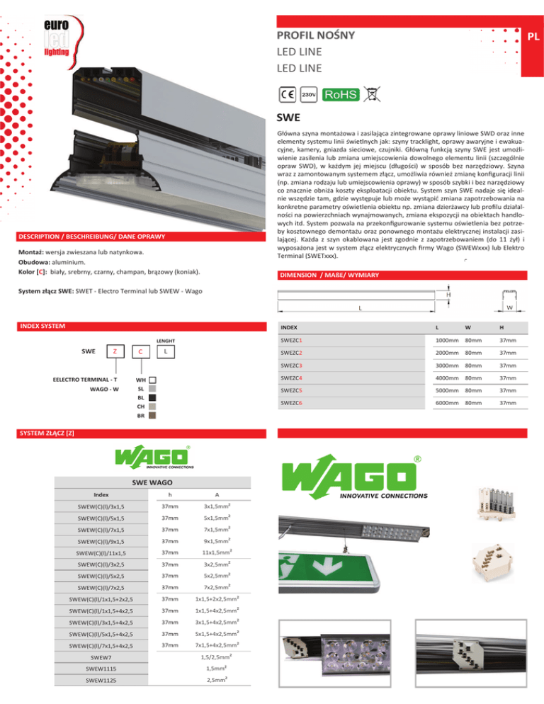 PROFIL NOŚNY LED LINE LED LINE PL SWE Główna szyna montażowa i zasilająca zintegrowane oprawy liniowe SWD oraz inne elementy systemu linii świetlnych jak: szyny tracklight, oprawy awaryjne i ewakuacyjne, kamery, gniazda sieciowe, czujniki. Główną funkcją szyny SWE jest umożliwienie zasilenia lub zmiana umiejscowienia dowolnego elementu linii (szczególnie opraw SWD), w każdym jej miejscu (długości) w sposób bez narzędziowy. Szyna wraz z zamontowanym systemem złącz, umożliwia również zmianę konfiguracji linii (np. zmiana rodzaju lub umiejscowienia oprawy) w sposób szybki i bez narzędziowy co znacznie obniża koszty eksploatacji obiektu. System szyn SWE nadaje się idealnie wszędzie tam, gdzie występuje lub może wystąpić zmiana zapotrzebowania na konkretne parametry oświetlenia obiektu np. zmiana dzierżawcy lub profilu działalności na powierzchniach wynajmowanych, zmiana ekspozycji na obiektach handlowych itd. System pozwala na przekonfigurowanie systemu oświetlenia bez potrzeby kosztownego demontażu oraz ponownego montażu elektrycznej instalacji zasilającej. Każda z szyn okablowana jest zgodnie z zapotrzebowaniem (do 11 żył) i wyposażona jest w system złącz elektrycznych firmy Wago (SWEWxxx) lub Elektro Terminal (SWETxxx). DESCRIPTION / BESCHREIBUNG/ DANE OPRAWY Montaż: wersja zwieszana lub natynkowa. Obudowa: aluminium. Kolor [C]: biały, srebrny, czarny, champan, brązowy (koniak). DIMENSION / MAßE/ WYMIARY System złącz SWE: SWET - Electro Terminal lub SWEW - Wago INDEX SYSTEM SWE Z INDEX L LENGHT SWEZC1 1000mm 80mm 37mm L SWEZC2 2000mm 80mm 37mm SWEZC3 3000mm 80mm 37mm WH SWEZC4 4000mm 80mm 37mm SL SWEZC5 5000mm 80mm 37mm SWEZC6 6000mm 80mm 37mm C EELECTRO TERMINAL - T WAGO - W W H BL CH BR SYSTEM ZŁĄCZ [Z] SWE WAGO Index h A SWEW(C)(l)/3x1,5 37mm 3x1,5mm2 SWEW(C)(l)/5x1,5 37mm 5x1,5mm2 SWEW(C)(l)/7x1,5 37mm 7x1,5mm2 SWEW(C)(l)/9x1,5 37mm 9x1,5mm2 SWEW(C)(l)/11x1,5 37mm 11x1,5mm2 SWEW(C)(l)/3x2,5 37mm 3x2,5mm2 SWEW(C)(l)/5x2,5 37mm 5x2,5mm2 SWEW(C)(l)/7x2,5 37mm 7x2,5mm2 SWEW(C)(l)/1x1,5+2x2,5 37mm 1x1,5+2x2,5mm2 SWEW(C)(l)/1x1,5+4x2,5 37mm 1x1,5+4x2,5mm2 SWEW(C)(l)/3x1,5+4x2,5 37mm 3x1,5+4x2,5mm2 SWEW(C)(l)/5x1,5+4x2,5 37mm 5x1,5+4x2,5mm2 SWEW(C)(l)/7x1,5+4x2,5 37mm 7x1,5+4x2,5mm2 SWEW7 1,5/2,5mm2 SWEW1115 1,5mm2 SWEW1125 2,5mm2 SYSTEM ZŁĄCZ [Z] SWE Electro Terminal Index h A SWET(C)(l)/3x1,5 37mm 3x1,5mm2 SWET(C)(l)/5x1,5 37mm 5x1,5mm2 SWET(C)(l)/7x1,5 37mm 7x1,5mm2 SWET(C)(l)/3x2,5 37mm 3x2,5mm2 SWET(C)(l)/5x2,5 37mm 5x2,5mm2 SWET(C)(l)/7x2,5 37mm 7x2,5mm2 SWET(C)(l)/1x1,5+2x2,5 37mm 1x1,5+2x2,5mm2 SWET(C)(l)/1x1,5+4x2,5 37mm 1x1,5+4x2,5mm2 SWET(C)(l)/3x1,5+4x2,5 37mm 3x1,5+4x2,5mm2 SWET 37mm