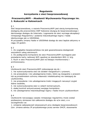 Regulamin korzystania z sieci bezprzewodowej PracownicyWiFi - Akademii Wychowania Fizycznego im. J. Kukuczki w Katowicach §1 Sieć bezprzewodowa, o nazwie PracownicyWiFi jest siecią komputerową dostępną dla pracowników AWF Katowice służącą do bezprzewodowego i darmowego dostępu do Internetu. Logowanie do sieci wymaga akceptacji niniejszego Regulaminu i podania indywidualnego loginu i hasła identycznego jak w USOSWeb. W przypadku zmiany hasła w USOSWeb dostęp do sieci będzie aktywny w ciągu 24 godzin. §2 1. Ze względów bezpieczeństwa nie jest gwarantowana dostępność wszystkich usług sieciowych. 2. Do podłączenia komputera do sieci PracownicyWiFi wymagane jest posiadanie karty radiowej WiFi zgodnej ze standardem 802.11 b/g. 3. Ruch w sieci PracownicyWiFi jest na bieżąco monitorowany i archiwizowany. §3 Użytkownik sieci PracownicyWiFi zobowiązuje się do : 1. nie wykorzystywania sieci do działań niezgodnych z prawem, 2. nie przesyłania i nie udostępniania treści, które są niezgodne z prawem lub są przedmiotem ochrony własności intelektualnej nie należącej do użytkownika, 3. nie przesyłania i nie udostępniania treści mogących naruszyć czyjeś dobra osobiste, 4. nie wykorzystywania sieci w celach komercyjnych, 5. stałej kontroli antywirusowej swojego komputera. 6. nie udostępniania indywidualnego loginu i hasła innym użytkownikom §4 Użytkownik naruszający zasady niniejszego regulaminu może zostać pozbawiony okresowo lub całkowicie dostępu do w/w sieci, a w szczególności za: 1. omijanie zabezpieczeń stosowanych przy dostępie bezprzewodowym (tzn. zmiana adresu IP przydzielonego przez serwer DHCP, stosowanie tuneli), 2. udostępnianie oraz pobieranie z sieci materiałów chronionych prawami autorskimi ( oprogramowanie, filmy, muzyka itp.) i pornograficznych, 3. korzystanie z aplikacji typu P2P 4. wszelkie inne działanie użytkownika, które może zostać uznane za potencjalnie niebezpieczne dla funkcjonowania sieci i komputerów innych użytkowników. §5 1. AWF Katowice nie ponosi odpowiedzialności za przerwy w dostępie do sieci bezprzewodowej, 2. AWF Katowice nie ponosi odpowiedzialności za problemy z dostępem do Internetu związane z nieprawidłowym działaniem oprogramowania na komputerach użytkowników. §6 Użytkownik ponosi pełną odpowiedzialność prawną i finansową za szkody spowodowane jego działalnością z użyciem w/w sieci. §7 W sprawach nieuregulowanych niniejszym Regulaminem stosuje się powszechnie obowiązujące w tym zakresie przepisy prawa.