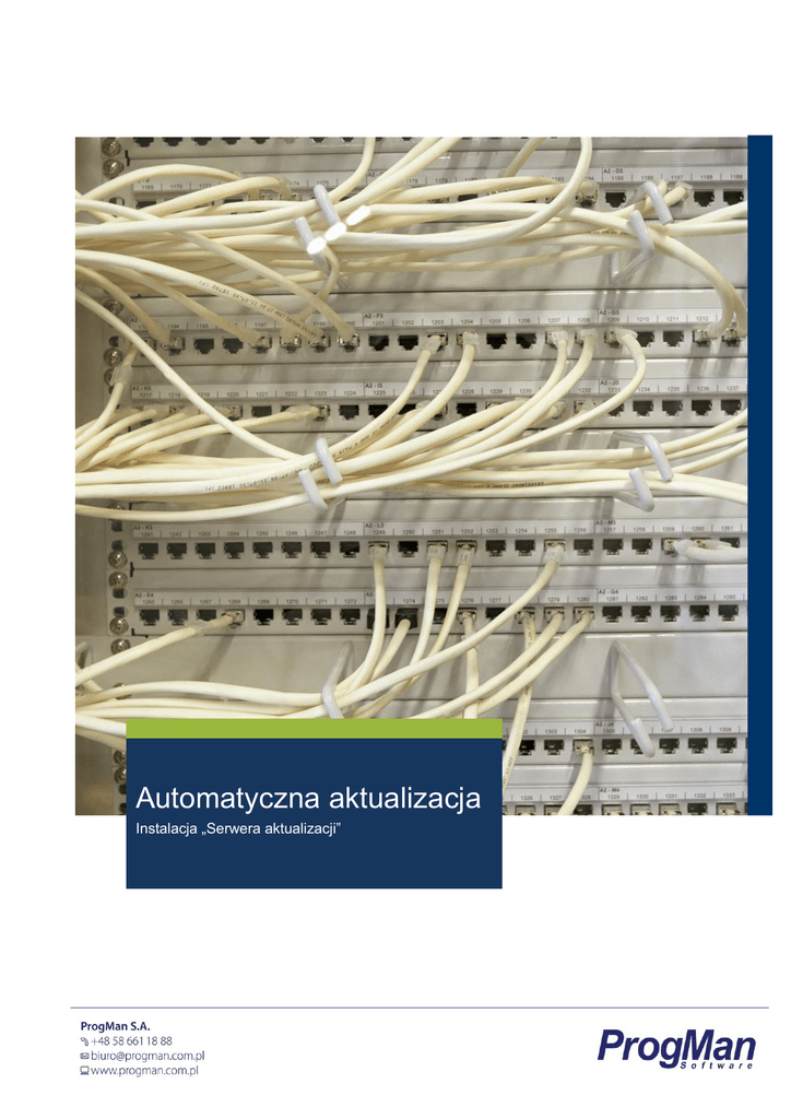Automatyczna aktualizacja Instalacja „Serwera aktualizacji” Automatyczna aktualizacja Spis treści Wstęp 4 Jak działa automatyczna aktualizacja 5 Aktualizacja z wykorzystaniem mechanizmu udostępnienia plików w systemie Windows 6 Konfiguracja serwera aktualizacji .............................................................................................. 6 Konfiguracja programu.............................................................................................................. 8 Aktualizacja z wykorzystaniem serwera WWW (protokół HTTP) 10 Ustawienie serwera aktualizacji .............................................................................................. 10 Krok 1: Instalacja Apache HTTP Server .................................................................................. 10 Krok 2: Konfiguracja serwera Apache ..................................................................................... 11 Konfiguracja programu............................................................................................................ 13 Aktualizacja z wykorzystaniem serwera FTP 15 Ustawienie serwera aktualizacji .............................................................................................. 15 Krok 1: Instalacja FileZilla Server ............................................................................................ 15 Krok 2: Konfiguracja FileZilla Server ....................................................................................... 17 Konfiguracja programu............................................................................................................ 19 Najczęściej zadawane pytania 20 Czy można ustawić okno FileZilla tak aby nie pojawiało się za każdym razem kiedy uruchamiam komputer? .......................................................................................................... 21 Jak zmienić hasło dla panelu administracyjnego FileZilla Server? .......................................... 21 Na jakim porcie pracuje serwer? ............................................................................................. 21 Dlaczego system pyta mnie o użytkownika i hasło kiedy próbuję wejść na udostępniony zasób? .................................................................................................................................... 21 Jak zezwolić programowi na dostęp przez zaporę systemu Windows? ................................... 21 Dlaczego mimo poprawnie skonfigurowanego Firewall na Serwerze Aktualizacji program nadal nie ma połączenia? ....................................................................................................... 22 Czy są jakieś ograniczenia?.................................................................................................... 22 Dlaczego nie mam oddzielnej zakładki Zabezpieczenia (udostępnienie folderu)? ................... 22 serwis.progman.pl Strona 2 z 23 Automatyczna aktualizacja Jak wyłączyć kontrolę pracy użytkownika (User Account Control)?......................................... 22 Dlaczego nie mogę utworzyć pliku w katalogu „Program Files”? ............................................. 23 serwis.progman.pl Strona 3 z 23 Automatyczna aktualizacja Wstęp Niniejsza instrukcja jest tylko wskazówką jak można stworzyć „Serwer aktualizacji”, aby poprawnie funkcjonowała automatyczna aktualizacja zaimplementowana w programach firmy ProgMan. Kwestie bezpieczeństwa / zabezpieczeń wybranego przez użytkownika sposobu aktualizacji należy skonsultować z administratorem sieci lokalnej. Więcej informacji znajdą Państwo na stronie http://serwis.progman.pl ProgMan S.A. Al. Zwyciestwa 96/98 | 81-451 Gdynia tel: +48 58 661 18 88 | fax: +48 58 661 22 48 [email protected] | www.progman.com.pl NIP: 586-20-10-111 | REGON: 191807711 | KRS: 0000322718 Rejestr przedsiębiorców Krajowego Rejestru Sądowego prowadzony przez Sąd Rejonowy Gdańsk - Północ w Gdańsku VIII Wydział Gospodarczy. Wysokość kapitału zakładowego: 700 000.00 zł. serwis.progman.pl Strona 4 z 23 Automatyczna aktualizacja Jak działa automatyczna aktualizacja W celu zautomatyzowania procesu aktualizacji programów dla komputerów pracujących w sieci należy w pierwszej kolejności wybrać jeden komputer, na którym będą instalowane najnowsze wersje programów. Komputer ten będzie Serwerem Aktualizacji (SA) i z niego będą automatycznie pobierane pliki dla pozostałych komputerów. Może być to stacja robocza lub specjalnie do tego celu wydzielony komputer z systemem Windows lub Linux. W drugim przypadku należy przenieść zainstalowane pliki pod Windows na udostępniony zasób pod Linuxem. Następnie należy przejść do konfiguracji serwera SA według wybranego przez Użytkownika sposobu aktualizacji. Programy z wbudowaną funkcją automatycznej aktualizacji umożliwiają wybranie jednej z trzech metod: ■ ■ ■ udostępnienie folderu (mechanizm udostępniania plików Windows/Linux), z wykorzystaniem serwera WWW (HTTP) z wykorzystaniem serwera WWW (HTTP) FTP. Każda z nich została szczegółowo opisany w kolejnych rozdziałach. Udostępnionym zasobem może być domyślny folder programów firmy ProgMan (czyli: C:\Program Files\ProgMan) lub specjalnie stworzony folder z zainstalowanymi programami. Zalecane jest aby nie zawierały one baz danych i ustawionych plików konfiguracyjnych. W poniższej instrukcji przedstawiono przykład z udostępnianiem domyślnej lokalizacji programów. Każdy program z wbudowana funkcję automatycznej aktualizacji należy oddzielnie skonfigurować. Informacje o serwerze SA przechowywana są w bazie danych dzięki temu wystarczy, że skonfigurujemy jedno stanowisko aby aktualizowały się wszystkie pracujące na wybranym programie. Warunkiem poprawnego działania automatycznej aktualizacji na stacjach roboczych jest nadanie programowi pełnego prawa do zapisu w folderze, w którym się znajduje. W przypadku s