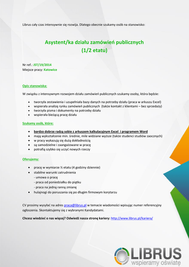 Librus cały czas intensywnie się rozwija. Dlatego obecnie szukamy osób na stanowisko: Asystent/ka działu zamówień publicznych (1/2 etatu) Nr ref.: JST/19/2014 Miejsce pracy: Katowice Opis stanowiska: W związku z intensywnym rozwojem działu zamówień publicznych szukamy osoby, która będzie: tworzyła zestawienia i uzupełniała bazy danych na potrzeby działu (praca w arkuszu Excel) wspierała analizę rynku zamówień publicznych (także kontakt z klientami – bez sprzedaży) tworzyła pisma i dokumenty na potrzeby działu wspierała bieżącą pracę działu Szukamy osób, które: bardzo dobrze radzą sobie z arkuszem kalkulacyjnym Excel i programem Word mają wykształcenie min. średnie, mile widziane wyższe (także studenci studiów zaocznych) w pracy wykazują się dużą dokładnością są samodzielne i zaangażowane w pracę potrafią szybko się uczyć nowych rzeczy Oferujemy: pracę w wymiarze ½ etatu (4 godziny dziennie) stabilne warunki zatrudnienia - umowa o pracę - praca od poniedziałku do piątku - praca na jedną ranną zmianę hulajnogi do poruszania się po długim firmowym korytarzu CV prosimy wysyłać na adres [email protected] w temacie wiadomości wpisując numer referencyjny ogłoszenia. Skontaktujemy się z wybranymi Kandydatami. Chcesz wiedzieć o nas więcej? Odwiedź nasza stronę kariery: http://www.librus.pl/kariera/