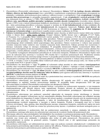 Nakla 20-01-2015 OGÓLNE WARUNKI UMOWY-ZLECENIA (OWU) 1. Zleceniobiorca (Przewoźnik) zobowiązany jest doręczyć Zleceniodawcy fakturę VAT do każdego zlecenia oddzielnie (faktury zbiorcze nie będą honorowane) wraz z prawidłowo wypełnionymi oryginalnymi dokumentami otrzymanymi na załadunku i rozładunku, potwierdzonymi przez nadawcę i odbiorcę towaru: w szczególności: 2 szt. oryginalnego i czystego prawnie listu przewozowego (w przypadku transportów zagranicznych - 2 szt. oryginalnych i czystych prawnie CMR oraz dokumenty które są wpisane w CMR), WZ, Lieferschein, kwit paletowy, karty postojowe, wydruk z termografu, delivery note, specyfikacja, podbite pieczątką i podpisane czytelnie zlecenie transportowe (wszystkie strony zlecenia łącznie z OWU) wraz z innymi dokumentami dodatkowo określonymi w zleceniu lub przekazanymi na załadunku tj. faktury itd..., które potwierdzają prawidłowo wykonany transport w terminie do 14 dni kalendarzowych od dnia rozładunku dla transportów międzynarodowych i 7 dni kalendarzowych dla transportów krajowych. Faktura musi dotrzeć do zleceniodawcy, na adres korespondencyjny (83-400 Kościerzyna ul. Klasztorna 16) najpóźniej do 15 dnia kolejnego miesiąca po wykonaniu usługi, w przeciwnym wypadku termin zostanie wydłużony do 90 dni. 2. Faktura wystawiona przez Zleceniobiorcę winna zawierać: numer zlecenia, nr tabeli kursów (numer tabeli oraz wartość waluty w danym dniu) , pełną nazwę nabywcy (Gosped Adamscy Spółka Jawna) wraz z adresem (77-127 Nakla, ul. Przyjazna 11), w przypadku faktur walutowych wartość podatku VAT wyrażoną w PLN dla celów podatkowych po kursie z dnia poprzedzającego datę rozładunku (datę sprzedaży). Faktury powinny zawierać rzeczywistą datę załadunku i rozładunku, data sprzedaży = data rozładunku. Dla faktur wystawionych w PLN, EUR, GBP należy przyjąć kurs z dnia poprzedzającego dzień rozładunku (dzień poprzedzający datę sprzedaży). Faktura wystawiona w walucie musi posiadać wyraźnie oznaczone konto walutowe oraz wyraźnie oznaczone konto złotówkowe. Faktura powinna być wystawiona w miesiącu wykonania usługi (w miesiącu rozładunku). W przypadku dostarczenia błędnie wystawionych faktur albo dostarczenia niekompletnych lub nieoryginalnych dokumentów, o którym mowa w punkcie 1, faktura zostanie odesłana bez księgowania, a termin płatności zostanie wydłużony do 90 dni od daty dostarczenia prawidłowo wystawionej faktury wraz ze wszystkimi wymaganymi dokumentami potrzebnymi do rozliczenia transportu. Dodatkowo Zleceniodawca będzie miał prawo do naliczenia kary umownej w wysokości 50% frachtu lub w wysokości poniesionych strat. Wydłużenie terminu płatności oraz naliczenie kary umownej nastąpi również w przypadku przekroczenia terminu doręczenia dokumentów. 3. Zleceniodawca zastrzega sobie możliwość wykonania płatności za faktury wystawione w walucie obcej zarówno w PLN jak i w EUR, w związku z czym w przypadku faktur walutowych należy przeliczyć zawarte pozycje netto, vat i brutto na PLN oraz podać konto PLN w sposób wyraźny. 4. Zleceniobiorca ma obowiązek w ciągu 72 godzin od wykonania usługi przesłać na adres mailowy ([email protected]) czytelny skan wszystkich dokumentów transportowych wymienionych w punkcie 1 wpisując w tytule wiadomości numer zlecenia pod rygorem naliczenia kary umownej w wysokości 100 EUR i wydłużeniem terminu płatności do 90 dni. 5. Zleceniobiorca ma obowiązek w ciągu 30 minut przesłać na adres mailowy ([email protected]) potwierdzone zlecenie (oryginał podbitego zlecenia musi być dołączony także do faktury) pod rygorem naliczenia kary umownej w wysokości 100 EUR i wydłużeniem terminu płatności do 90 dni. 6. Rezygnacja z wykonania przyjętego zlecenia wiąże się z poniesieniem kary umownej w wysokości 100 EUR oraz pokrycia ewentualnych kosztów jakie poniesie Zleceniodawca. 7. Zleceniobiorca zobowiązany jest posiadać aktualne ubezpieczenie OC pojazdu oraz OCP z sumą ubezpieczenia odpowiadającą co najmniej wartości przewożonego ładunku. W przypadku braku ubezpieczenia OCP lub jego niewystarczającej wysokości Zleceniobiorca zobowiązany jest ubezpieczyć ładunek. 8. Zleceniobiorca zobowiązany jest posiadać niezbędne licencje i zezwolenia na wykonywanie transportu, w tym transportu międzynarodowego jeśli zlecenie dotyczy trasy zagranicznej. Przyjęcie zlecenia do realizacji jest równoznaczne z potwierdzeniem faktu, iż Zleceniobiorca jest uprawnionym przewoźnikiem posiadającym odpowiednie licencje i ubezpieczenia. 9. Zleceniobiorca zobowiązany jest podstawić samochód odpowiedni do transportu towaru określonego w zleceniu. W przypadku gdy transport wykonywany ma być samochodem chłodnią, Przewoźnik zobowiązany jest schłodzić naczepę przed załadunkiem do temperatury 0 stopni Celsjusza lub niższej zgodnej z warunkami zlecenia oraz do monitorowania jej wysokości przez cały czas trwania transportu, a także do przedstawienia na żądanie Zleceniodawcy wydruku dokumentującego wysokość temperatury w naczepie w trakcie transportu. Wydruk z termografu musi być w formie cyfrowej zawierającej : datę, godzinę, dane identyfikacyjne naczepy, temperaturę transportu, częstotliwość zapisu nie może być mniejsza niż co 30 min. Wydruk ten winien być przechowywany łącznie z wydrukiem/ tarczkami tachografu przez co najmniej rok. 10. W przypadku spóźnienia w podstawieniu (lub nie podstawienia) samochodu w miejscu załadunku lub rozładunku Zleceniodawca zastrzega sobie prawo do naliczenia kary umownej do wysokości frachtu lub poniesionych strat. 11. Obowiązuje całkowity zakaz przeładunków lub doładunków bez uzyskania wcześniejszej pisemnej zgody Zleceniodawcy. 12. Zleceniodawca zastrzega pierwsze 48 godzin postoju (72 godziny w krajach Europy Wschodniej), a także postój w soboty, niedziele oraz święta przy załadunku i rozładunku jako wolne o
