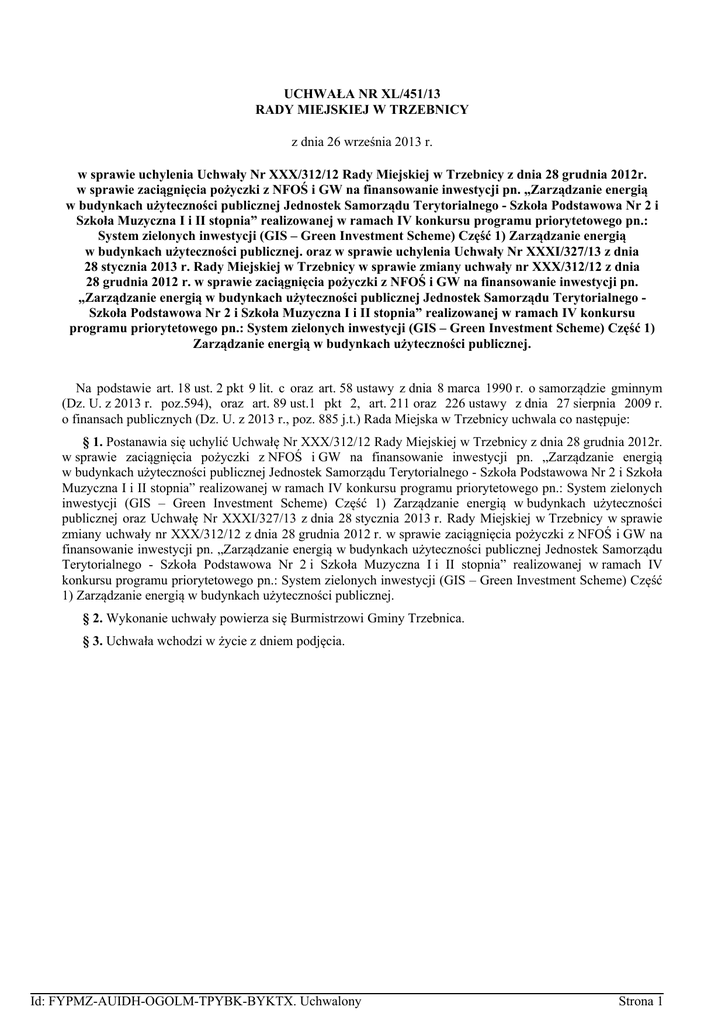 UCHWAŁA NR XL/451/13 RADY MIEJSKIEJ W TRZEBNICY z dnia 26 września 2013 r. w sprawie uchylenia Uchwały Nr XXX/312/12 Rady Miejskiej w Trzebnicy z dnia 28 grudnia 2012r. w sprawie zaciągnięcia pożyczki z NFOŚ i GW na finansowanie inwestycji pn. „Zarządzanie energią w budynkach użyteczności publicznej Jednostek Samorządu Terytorialnego - Szkoła Podstawowa Nr 2 i Szkoła Muzyczna I i II stopnia” realizowanej w ramach IV konkursu programu priorytetowego pn.: System zielonych inwestycji (GIS – Green Investment Scheme) Część 1) Zarządzanie energią w budynkach użyteczności publicznej. oraz w sprawie uchylenia Uchwały Nr XXXI/327/13 z dnia 28 stycznia 2013 r. Rady Miejskiej w Trzebnicy w sprawie zmiany uchwały nr XXX/312/12 z dnia 28 grudnia 2012 r. w sprawie zaciągnięcia pożyczki z NFOŚ i GW na finansowanie inwestycji pn. „Zarządzanie energią w budynkach użyteczności publicznej Jednostek Samorządu Terytorialnego Szkoła Podstawowa Nr 2 i Szkoła Muzyczna I i II stopnia” realizowanej w ramach IV konkursu programu priorytetowego pn.: System zielonych inwestycji (GIS – Green Investment Scheme) Część 1) Zarządzanie energią w budynkach użyteczności publicznej. Na podstawie art. 18 ust. 2 pkt 9 lit. c oraz art. 58 ustawy z dnia 8 marca 1990 r. o samorządzie gminnym (Dz. U. z 2013 r. poz.594), oraz art. 89 ust.1 pkt 2, art. 211 oraz 226 ustawy z dnia 27 sierpnia 2009 r. o finansach publicznych (Dz. U. z 2013 r., poz. 885 j.t.) Rada Miejska w Trzebnicy uchwala co następuje: § 1. Postanawia się uchylić Uchwałę Nr XXX/312/12 Rady Miejskiej w Trzebnicy z dnia 28 grudnia 2012r. w sprawie zaciągnięcia pożyczki z NFOŚ i GW na finansowanie inwestycji pn. „Zarządzanie energią w budynkach użyteczności publicznej Jednostek Samorządu Terytorialnego - Szkoła Podstawowa Nr 2 i Szkoła Muzyczna I i II stopnia” realizowanej w ramach IV konkursu programu priorytetowego pn.: System zielonych inwestycji (GIS – Green Investment Scheme) Część 1) Zarządzanie energią w budynkach użyteczności publicznej oraz Uchwałę Nr XXXI/327/13 z dnia 28 stycznia 2013 r. Rady Miejskiej w Trzebnicy w sprawie zmiany uchwały nr XXX/312/12 z dnia 28 grudnia 2012 r. w sprawie zaciągnięcia pożyczki z NFOŚ i GW na finansowanie inwestycji pn. „Zarządzanie energią w budynkach użyteczności publicznej Jednostek Samorządu Terytorialnego - Szkoła Podstawowa Nr 2 i Szkoła Muzyczna I i II stopnia” realizowanej w ramach IV konkursu programu priorytetowego pn.: System zielonych inwestycji (GIS – Green Investment Scheme) Część 1) Zarządzanie energią w budynkach użyteczności publicznej. § 2. Wykonanie uchwały powierza się Burmistrzowi Gminy Trzebnica. § 3. Uchwała wchodzi w życie z dniem podjęcia. Id: FYPMZ-AUIDH-OGOLM-TPYBK-BYKTX. Uchwalony Strona 1 Uzasadnienie W związku z opóźnieniami Wykonawcy w wykonaniu robót budowlanych, w tym prac z zakresu termomodernizacji w budynkach Szkoły Podstawowej Nr 2, Szkoły Muzycznej, co związane było z możliwością utraty dofinansowania przyznanego przez Narodowy Fundusz Ochrony Środowiska i Gospodarki Wodnej na ww. zadania i TCKiS, Gmina Trzebnica podjęła decyzję o rozwiązaniu umowy o dofinansowanie zarówno w formie dotacji jak i pożyczki dla inwestycji pn. „Zarządzanie energią w budynkach użyteczności publicznej Jednostek Samorządu Terytorialnego w Gminie Trzebnica” przyznanego w ramach IV konkursu Programu Priorytetowego System zielonych inwestycji (GIS). Gmina Trzebnica niezwłocznie przystąpiła do konkursu ogłoszonego przez Narodowy Fundusz Ochrony Środowiska i Gospodarki Wodnej w ramach II konkurs cz. 5 "Zarządzanie energią" dla PAN, w którym kwota dofinansowania wynosi 100%. Gmina Trzebnica złożyła dokumenty aplikacyjne na dofinansowanie termomodernizacji Trzebnickiego Centrum Kultury i Sportu. Gmina Trzebnica złożyła również dokumenty aplikacyjne do Programu Operacyjnego PL04 „Oszczędzanie energii i promowanie odnawialnych źródeł energii” ogłoszonego w ramach funduszy norweskich. Maksymalny poziom dofinansowania w tym naborze sięga 80%. Gmina złożyła wniosek obejmujący m. in. termomodernizację Szkoły Muzycznej. W powyższych konkursach Gmina aplikowała o dofinansowanie pod warunkiem rezygnacji z przyznanych form dofinansowania zarówno w formie dotacji jak i pożyczki przez NFOŚiGW dla budynków Szkoły Podstawowej Nr 2, Szkoły Muzycznej oraz TCKiS w celu wyeliminowania podwójnego dofinansowania. Łączną kwotę przyznanego dofinansowania w ramach IV konkursu (GIS) dla budynków: TCKiS, Szkoły Muzycznej i Szkoły Podstawowej Nr 2 w formie dotacji stanowiącej jedynie 30% kosztów kwalifikowalnych oraz pożyczki stanowiącej 60% kosztów kwalifikowalnych Gmina zamierza zastąpić dofinansowaniem w formie dotacji w aplikowanych wymienionych powyżej konkursach na łączną kwotę stanowiącą: 100% kosztów kwalifikowalnych dla TCKiS oraz 80% kosztów kwalifikowalnych dla Szkoły Muzycznej. Można jednoznacznie stwierdzić ponad dwukrotną korzyść finansową dla Gminy Trzebnica przy zastosowaniu aktualnego montażu finansowego w złożonych dokumentach aplikacyjnych. Id: FYPMZ-AUIDH-OGOLM-TPYBK-BYKTX. Uchwalony Strona 1