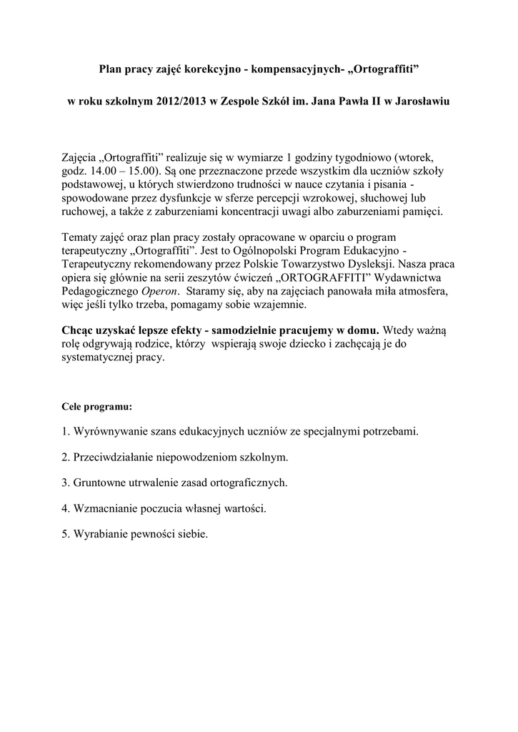Plan pracy zajęć korekcyjno - kompensacyjnych- „Ortograffiti” w roku szkolnym 2012/2013 w Zespole Szkół im. Jana Pawła II w Jarosławiu Zajęcia „Ortograffiti” realizuje się w wymiarze 1 godziny tygodniowo (wtorek, godz. 14.00 – 15.00). Są one przeznaczone przede wszystkim dla uczniów szkoły podstawowej, u których stwierdzono trudności w nauce czytania i pisania spowodowane przez dysfunkcje w sferze percepcji wzrokowej, słuchowej lub ruchowej, a także z zaburzeniami koncentracji uwagi albo zaburzeniami pamięci. Tematy zajęć oraz plan pracy zostały opracowane w oparciu o program terapeutyczny „Ortograffiti”. Jest to Ogólnopolski Program Edukacyjno Terapeutyczny rekomendowany przez Polskie Towarzystwo Dysleksji. Nasza praca opiera się głównie na serii zeszytów ćwiczeń „ORTOGRAFFITI” Wydawnictwa Pedagogicznego Operon. Staramy się, aby na zajęciach panowała miła atmosfera, więc jeśli tylko trzeba, pomagamy sobie wzajemnie. Chcąc uzyskać lepsze efekty - samodzielnie pracujemy w domu. Wtedy ważną rolę odgrywają rodzice, którzy wspierają swoje dziecko i zachęcają je do systematycznej pracy. Cele programu: 1. Wyrównywanie szans edukacyjnych uczniów ze specjalnymi potrzebami. 2. Przeciwdziałanie niepowodzeniom szkolnym. 3. Gruntowne utrwalenie zasad ortograficznych. 4. Wzmacnianie poczucia własnej wartości. 5. Wyrabianie pewności siebie. Przewidywane osiągnięcia: 1. Usprawnienie umiejętności czytania w aspekcie: techniki, tempa, rozumienia czytanych treści. 2. Usprawnienie umiejętności pisania w zakresie odpowiedzialności, czujności i poprawności ortograficznej. 3. Utrwalanie i zastosowanie znajomości zasad ortograficznych w prawidłowej pisowni polskiej. 4. Wdrażanie uczniów do systematycznej pracy z zastosowaniem słownika ortograficznego. 5. Doskonalenie umiejętności redakcyjnych w różnych formach wypowiedzi. 6. Opanowanie sztuki kształtnego pisania poprzez wprowadzenie specjalnej liniatury oraz kaligrafii. 1) Metody pracy: praca z zeszytami zestawu „Ortograffiti”, drama, mapy pojęciowe, loteryjki, puzzle, scrable, zabawy ortograficzne. 2) Formy pracy: grupowa, indywidualna. 3) Środki dydaktyczne: karty pracy, programy multimedialne, plansze ortograficzne. 4) Cele zajęć: Cel nadrzędny to rozwijanie umiejętności poprawnego pisania. Cele szczegółowe: - kształcenie słuchu fonematycznego, - ćwiczenia pamięci i spostrzegawczości słuchowej, - usprawnianie analizatora słuchowego, - podniesienie poziomu pamięci wzrokowej i uwagi w celu lepszego zapamiętywania struktur graficznych wyrazów, - doskonalenie koordynacji wzrokowo-ruchowej, - utrwalenie zasad pisowni z wszystkimi trudnościami ortograficznymi ze szczególnym akcentem na ”ó, u, rz, ż, ch, h”, - ćwiczenia umiejętności stosowania reguł ortograficznych w trakcie pisania, - usprawnianie techniki czytania, - ćwiczenia czytania ze zrozumieniem, - ćwiczenia usprawniające grafomotorykę (poziom graficzny pisania), - wdrażanie do autokorekty, - integracja zespołu, - zachęta do radzenia sobie w trudnych sytuacjach, - motywowanie do podejmowania zadań o różnym stopniu trudności. Plan działania: 1. Usprawnianie percepcji wzrokowej: – Ćwiczenia usprawniające analizator wzrokowy (wyszukiwanie podobieństw i różnic). – Ćwiczenia usprawniające syntezę wzrokową (puzzle). – Ćwiczenia usprawniające pamięć wzrokową (odtwarzanie rysunków). 2. Usprawnienie percepcji słuchowej: – Ćwiczenia usprawniające słuch fonemowy(różnicowanie słów podobnych brzmieniowo). – Ćwiczenia kształtujące wrażliwość słuchową(rysowanie struktury rytmicznej wyrazu). 3. Doskonalenie graficznego poziomu pisma: – Ćwiczenia doskonalące płynność pisania. – Ćwiczenia doskonalące umiejętność mieszczenia zapisu w liniaturze(rysowanie po śladzie). – Ćwiczenia małej motoryki (lepienie, wycinanie, nawlekanie). 4. Utrwalenie zasad pisania: – Praca na blokach ortograficznych – „ó”, „rz”, itp. (uzupełnianie luk w wyrazach, wypisywanie wyrazów z trudnością ortograficzną, porządkowanie według alfabetu, krzyżówki, opowiadania, rebusy, pisanie ze słuchu i z pamięci). 5. Usprawnianie umiejętności czytania i pisania: – Ćwiczenia w płynnym czytaniu, z zachowaniem intonacji, czytanie ze zrozumieniem (wykreślanie zbędnych wyrazów, analiza tekstu). – Opowiadanie historyjek obrazkowych, łańcuchy wyrazowe, anagramy, układanie opowiadań z wykorzystaniem podanych wyrazów, krzyżówki. – Ćwiczenia rozwijające pamięć i uwagę (wierszyki, rymowanki, luki wyrazów). 6. Wzbogacanie słownictwa czynnego ucznia.