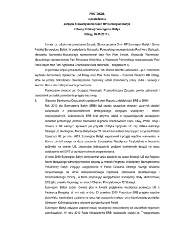 PROTOKÓŁ z posiedzenia Zarządu Stowarzyszenia Gmin RP Euroregion Bałtyk i Strony Polskiej Euroregionu Bałtyk Elbląg, 06.05.2011 r. 6 maja br. odbyło się posiedzenie Zarządu Stowarzyszenia Gmin RP Euroregion Bałtyk i Strony Polskiej Euroregionu Bałtyk. W posiedzeniu Marszałka Pomorskiego reprezentowała Pani Kora Stańczyk, Marszałka Warmińsko-Mazurskiego reprezentował oraz Pan Piotr Zwolak, Wojewodę WarmińskoMazurskiego reprezentowała Pani Mirosława Wojtyńska, a Wojewodę Pomorskiego reprezentowały Pani Anna Mayer oraz Pani Agnieszka Chankiewicz (lista obecności – załącznik nr 1). W pierwszej części posiedzenia uczestniczyły Pani Monika Bechter-Jankowska – p.o. Naczelnika Wydziału Komunikacji Społecznej UM Elbląg oraz Pani Anna Kleina – Rzecznik Prasowy UM Elbląg, które na prośbę Sekretariatu Stowarzyszenia zapewniły udział dziennikarzy prasy, radia i telewizji z Warmii i Mazur dla zrelacjonowania posiedzenia. Posiedzenie otworzył pan Grzegorz Nowaczyk, Przewodniczący Zarządu, powitał zebranych i przedstawił porządek posiedzenia przyjęty bez uwag. 1. Sławomir Demkowicz-Dobrzański przedstawił skrót Raportu z działalności ERB w 2010r. Rok 2010 dla Euroregionu Bałtyk (ERB) był przede wszystkim okresem waŜnych działań związanych z przeprowadzeniem strategicznego przeglądu współpracy i reform instytucjonalnych. Jednocześnie ERB brał aktywny udział w najwaŜniejszych europejskich debatach prezentując jednolite stanowisko regionów członkowskich Danii, Litwy, Polski, Rosji i Szwecji w tak waŜnych sprawach jak przyszła Polityka Spójności UE czy dalsza realizacja Strategii UE dla Regionu Morza Bałtyckiego. W ramach konsultacji dotyczących przyszłej Polityki Spójności UE po roku 2013, Euroregion Bałtyk wypracował i przyjął wspólne stanowisko, w którym zwrócił uwagę na duŜe znaczenie Europejskiej Współpracy Terytorialnej w tworzeniu spójności na terenie UE, proponując jednocześnie podjęcie konkretnych decyzji na rzecz zwiększenia roli EWT w przyszłym okresie programowania. W roku 2010 Euroregion Bałtyk kontynuował takŜe działania na rzecz Strategii UE dla Regionu Morza Bałtyckiego wdraŜając wspólne projekty w ramach Programu Współpracy Transgranicznej Południowy Bałtyk, inicjując uwzględnienie w Planie Działania Strategii nowego działania horyzontalnego na temat wielopoziomowego rządzenia, planowania przestrzennego i zrównowaŜonego rozwoju, a takŜe proponując uwzględnienie współpracy Rady MłodzieŜowej ERB jako projektu flagowego w ramach Obszaru Priorytetowego 12 Strategii. Euroregion Bałtyk zabrał równieŜ głos w kwestii pogłębiania współpracy pomiędzy UE a Federacją Rosyjską. W tym celu w dniu 23 września 2010 Prezydium ERB przyjęło wspólne stanowisko wspierające działania na rzecz wprowadzenia małego ruchu bezwizowego pomiędzy Obwodem Kaliningradzkim a terenami przygranicznymi Polski. Euroregion Bałtyk aktywnie wspierał rozwój współpracy młodzieŜowej we wszystkich regionach członkowskich. W roku 2010 Rada MłodzieŜowa ERB realizowała projekt pt. Transgraniczna Współpraca i Komunikacja MłodzieŜy, w ramach którego w kaŜdym z regionów członkowskich zorganizowano szereg spotkań, warsztatów i wizyt studyjnych. Działania realizowane w projekcie objęły ogółem ponad 280 młodych osób z Danii, Litwy, Polski, Rosji i Szwecji, przyczyniając się do pogłębienia współpracy między młodzieŜą na obszarze ERB. W lutym 2010 r. w Vaxjo, Szwecja odbyło się seminarium poświęcone wpływowi młodzieŜy na polityki i strategie ochrony środowiska. Kolejne spotkanie zorganizowane przez uczestników współpracy w kwietniu w Kłajpedzie, Litwa poświęcone zostało problemowi demokracji i równości. NajwaŜniejszym wydarzeniem tej współpracy w roku 2010 było zorganizowanie w lipcu szczytu młodzieŜowego w Karlskronie, Szwecja. W szczycie wzięło udział podczas ponad 80 przedstawicieli młodzieŜy z całego terytorium ERB. W toku obrad zaprezentowano przykłady najciekawszych działań regionalnych organizacji młodzieŜowych, a następnie przeprowadzono dyskusję na temat przedsiębiorczości i ochrony środowiska. Ostatnie spotkanie młodzieŜowe odbyło się w październiku 2010 r. w Gdańsku. Ponad 50 uczestników spotkania zapoznało się z podstawowymi załoŜeniami polityki edukacyjnej UE, w tym zwłaszcza programu wymiany studenckiej Socrates Erasmus. W roku 2010 Euroregion Bałtyk kontynuował swoje działania w Programie Współpracy Transgranicznej Południowy Bałtyk. Całkowity budŜet Programu to ponad 75 MEUR, z czego ponad 60 MEUR pochodzi z dofinansowania Europejskiego Funduszu Rozwoju Regionalnego. Euroregion Bałtyk miał znaczący udział w stworzeniu Programu, a obecnie aktywnie przyczynia się do jego realizacji. Regiony członkowskie ERB są reprezentowane w formalnych strukturach Programu, a takŜe są odpowiadają za prowadzenie jego Punktów Kontaktowych. W ramach Programu ERB i jego partnerzy realizują obecnie kilka wspólnych projektów transgranicznych: • MOMENT - tworzenie nowatorskiego systemu gospodarki wodnej na terenie Litwy, Polski i Szwecji. Działania będą kontynuowane w ramach projektu MOMENT UP. Beneficjent wiodący: Rada Regionalna w Hrabstwie Kalmar: BudŜet obu projektów: około 2 500 000 €. • LED – nowatorskie systemy oświetlenia ulicznego LED, oszczędność energii. Beneficjent wiodący: Gmina Kalmar. BudŜet: 2 396 450,00 €. • YC3 – współpraca transgraniczna młodzieŜy. Beneficjent wiodący: Region Blekinge. BudŜet: 478 940,00 € • Capacity Building Projekt – pomoc potencjalnym beneficjentom Programu w tworzeniu wysokiej jakości projektów. Partner projektu: Stowarzyszenie Gmin RP Euroregion Bałty. BudŜet: 776 262,47 €. Zarząd przyjął projekt Rocznego Raportu ERB z roku 2010 jednogłośnie. 2. Sławomir Demkowicz-Dobrzański przedstawił memorandum nt. wsp