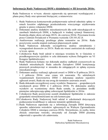 Informacja Rady Nadzorczej DSM z działalności w III kwartale 2016r. Rada Nadzorcza w w/wym. okresie zajmowała się sprawami wynikającymi z planu pracy Rady oraz sprawami bieżącymi, a mianowicie: 1. Rada Nadzorcza kontynuowała podejmowanie uchwał odnośnie spłaty w ratach kosztów odpłatnego przekształcenia wieczystego użytkowania gruntu w prawo własności DSM. 2. Dokonano analizy dodatków mieszkaniowych dla osób mieszkających w zasobach lokalowych DSM, a będących w trudnej sytuacji finansowej. Kontrolą objęto okres od maja 2015r. do czerwca 2016r. Przyznana kwota przez Centrum Świadczeń w Poznaniu wyniosła 120.101,02 zł. 3. Analizowano realizację przebiegu planu remontów na 2016r. Rada pozytywnie oceniła stopień realizacji planowanych zadań. 4. Rada Nadzorcza dokonała szczegółowej analizy zatrudnienia i wynagrodzeń dozorców za 2015r. Rada nie wnosi zastrzeżeń do realizacji w/wym. spraw. 5. Członkowie Rady brali udział w miesiącu wrześniu br. w Gnieźnie w przedkongresowym zjeździe w celu dokonania wyboru Delegatów na VI Kongres Spółdzielczości. 6. Rada Nadzorcza kolejny raz dokonała analizy zadłużeń czynszowych na lokalach mieszkalnych. Rada zaleciła Zarządowi DSM kontynuację prawnych przedsięwzięć w stosunku do zalegających ze spłatą czynszu mieszkaniowego. 7. Dokonano analizy realizacji zgłoszeń awarii w DSM w II półroczu 2015r. i I półroczu 2016r. oraz czasu ich usuwania. Po udzielonych wyjaśnieniach kierownictwa DSM i dokonanej analizie rejestrów zgłoszeń awarii, Rada nie ma uwag do terminów usuwania awarii. 8. Rada dokonała szczegółowej oceny wyników finansowo – gospodarczych uzyskanych przez DSM w I półroczu 2016r. Po dokonaniu analizy wyników za wymieniony okres Rada uznała, że posiadane środki pieniężne zabezpieczają spłatę zobowiązań Spółdzielni w 2016r. 9. Członkowie Rady pozytywnie ocenili działalność Spółdzielni w zakresie gospodarki nieruchomościami na cele komercyjne 10.Członkowie Rady Nadzorczej brali udział w szkoleniach dotyczących podnoszenia kwalifikacji w zakresie tematyki spółdzielczej. 11.Rada Nadzorcza zapoznała się z informacją Zarządu DSM dotyczącą sposobu załatwienia wniosków zgłoszonych na Walnym Zgromadzeniu Członków DSM w miesiącu czerwcu 2016r. Stwierdzono, że osoby, które złożyły omawiane wnioski, otrzymały od Zarządu DSM pisemną odpowiedź o sposobie ich załatwienia. Rada Nadzorcza Dębieckiej Spółdzielni Mieszkaniowej