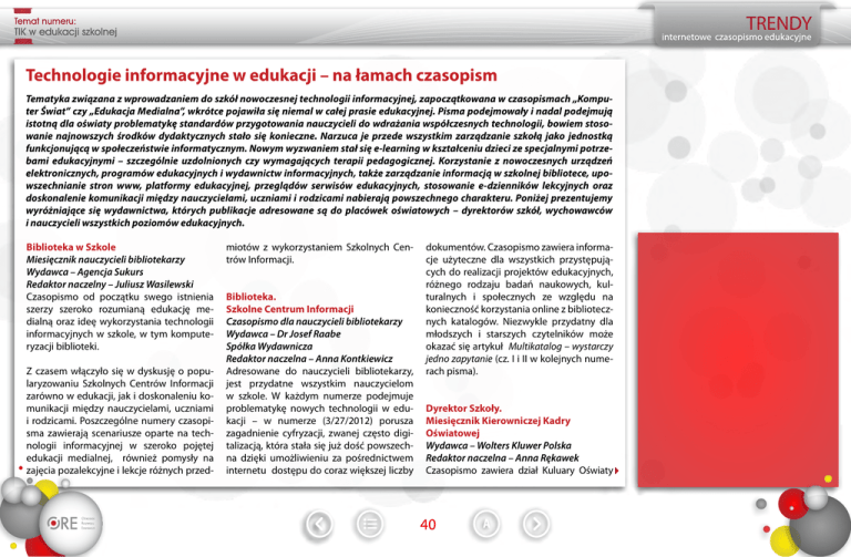 Temat numeru: TIK w edukacji szkolnej Technologie informacyjne w edukacji – na łamach czasopism Tematyka związana z wprowadzaniem do szkół nowoczesnej technologii informacyjnej, zapoczątkowana w czasopismach „Komputer Świat” czy „Edukacja Medialna”, wkrótce pojawiła się niemal w całej prasie edukacyjnej. Pisma podejmowały i nadal podejmują istotną dla oświaty problematykę standardów przygotowania nauczycieli do wdrażania współczesnych technologii, bowiem stosowanie najnowszych środków dydaktycznych stało się konieczne. Narzuca je przede wszystkim zarządzanie szkołą jako jednostką funkcjonującą w społeczeństwie informatycznym. Nowym wyzwaniem stał się e-learning w kształceniu dzieci ze specjalnymi potrzebami edukacyjnymi – szczególnie uzdolnionych czy wymagających terapii pedagogicznej. Korzystanie z nowoczesnych urządzeń elektronicznych, programów edukacyjnych i wydawnictw informacyjnych, także zarządzanie informacją w szkolnej bibliotece, upowszechnianie stron www, platformy edukacyjnej, przeglądów serwisów edukacyjnych, stosowanie e-dzienników lekcyjnych oraz doskonalenie komunikacji między nauczycielami, uczniami i rodzicami nabierają powszechnego charakteru. Poniżej prezentujemy wyróżniające się wydawnictwa, których publikacje adresowane są do placówek oświatowych – dyrektorów szkół, wychowawców i nauczycieli wszystkich poziomów edukacyjnych. Biblioteka w Szkole Miesięcznik nauczycieli bibliotekarzy Wydawca – Agencja Sukurs Redaktor naczelny – Juliusz Wasilewski Czasopismo od początku swego istnienia szerzy szeroko rozumianą edukację medialną oraz ideę wykorzystania technologii informacyjnych w szkole, w tym komputeryzacji biblioteki. Z czasem włączyło się w dyskusję o popularyzowaniu Szkolnych Centrów Informacji zarówno w edukacji, jak i doskonaleniu komunikacji między nauczycielami, uczniami i rodzicami. Poszczególne numery czasopisma zawierają scenariusze oparte na technologii informacyjnej w szeroko pojętej edukacji medialnej, również pomysły na zajęcia pozalekcyjne i lekcje różnych przed- miotów z wykorzystaniem Szkolnych Centrów Informacji. Biblioteka. Szkolne Centrum Informacji Czasopismo dla nauczycieli bibliotekarzy Wydawca – Dr Josef Raabe Spółka Wydawnicza Redaktor naczelna – Anna Kontkiewicz Adresowane do nauczycieli bibliotekarzy, jest przydatne wszystkim nauczycielom w szkole. W każdym numerze podejmuje problematykę nowych technologii w edukacji – w numerze (3/27/2012) porusza zagadnienie cyfryzacji, zwanej często digitalizacją, która stała się już dość powszechna dzięki umożliwieniu za pośrednictwem internetu dostępu do coraz większej liczby dokumentów. Czasopismo zawiera informacje użyteczne dla wszystkich przystępujących do realizacji projektów edukacyjnych, różnego rodzaju badań naukowych, kulturalnych i społecznych ze względu na konieczność korzystania online z bibliotecznych katalogów. Niezwykle przydatny dla młodszych i starszych czytelników może okazać się artykuł Multikatalog – wystarczy jedno zapytanie (cz. I i II w kolejnych numerach pisma). Dyrektor Szkoły. Miesięcznik Kierowniczej Kadry Oświatowej Wydawca – Wolters Kluwer Polska Redaktor naczelna – Anna Rękawek Czasopismo zawiera dział Kuluary Oświaty 40 Temat numeru: TIK w edukacji szkolnej poruszający m.in. problematykę wykorzystania w szkole nowych technologii informacyjnych, np. w artykule Indywidualizacja nauczania a nowe technologie. Tekst Wykorzystanie internetu do komunikowania się szkoły z otoczeniem traktuje o prowadzeniu marketingu za pośrednictwem internetu. Artykuł Internet – pomoc w komunikacji szkoły z rodzicami promuje portal icotamwszkole.pl Edukacja i Dialog. Czasopismo Liderów Edukacji Miesięcznik dla nauczycieli i rodziców Wydawca – Społeczne Towarzystwo Oświatowe Redaktor naczelny – Witold Kołodziejczyk Ostatni numer (5–6/2012) poświęcony jest projektowi Cyfrowa szkoła. Zawiera m.in. rozmowę z prof. Januszem Morbitzerem na temat edukacji informatycznej i medialnej w praktyce szkolnej. Ciekawy jest artykuł Technologie informacyjne w kontekście aktualnych przemian akademickiego kształcenia technicznego, a także relacje z konferencji naukowej Kierunki humanistyczne, pedagogiczne i społeczne Uniwersytetu Kazimierza Wielkiego wobec digitalizacji: narzędzia – dydaktyka – kompetencje absolwenta – cyfryzacja obiegu naukowego, zorganizowanej przez Katedrę Germanistyki UKW w Bydgoszczy w maju 2012 r. W numerze zaprezentowany też został pomysł na e-szkołę, problematyka e-dzienników oraz bezpiecznego korzystania z zasobów internetu. Serwis Edukacjamedialna.pl Jest odpowiedzią na współczesne potrzeby rodziców, nauczycieli i wychowawców. Ma ambicje niesienia pomocy w przygotowaniu dzieci i młodzieży do twórczego i krytycznego odbioru mediów, wartościowania przekazu – aby był jak najbardziej cenny i najmniej szkodliwy. Serwis proponuje wiele narzędzi pozwalających lepiej poznać media, nauczyć się z nich efektywnie korzystać i rozpoznać kryjące się w nich zagrożenia. Redakcja zaprasza użytkowników do współpracy – współtworzenia i wzbogacania serwisu. EduFakty – Uczę Nowocześnie Dwumiesięcznik oświatowy Wydawca – Benild s.c. Redaktor naczelny – Maciej Kułak Magazyn kierowany do nauczycieli i dyrektorów wszystkich typów szkół, samorządowców, polityków i urzędników oświatowych, nauczycieli akademickich (szkół pedagogicznych) i studentów kierunków pedagogicznych. Upowszechnia nowe technologie w edukacji, współpracując z najlepszymi ekspertami w kraju. Oprócz tematów związanych z metodyką nauczania i prawem oświatowym wiele stron poświęca nowinkom i poradom ułatwiającym codzienną pracę poprzez korzystanie z nowych technologii. Zawiera samouczki i scenariusze lekcji, np. Film animowany? Ależ tak!, Voki – gadający i animowany avator w s