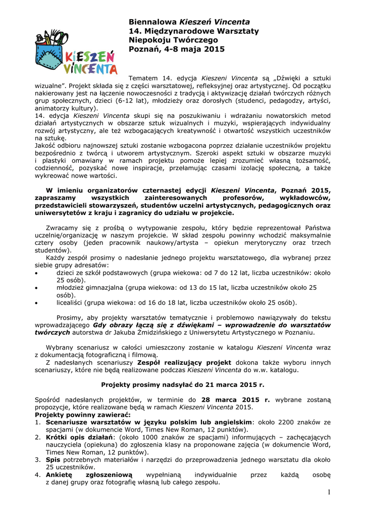 Biennalowa Kieszeń Vincenta 14. Międzynarodowe Warsztaty Niepokoju Twórczego Poznań, 4-8 maja 2015 Tematem 14. edycja Kieszeni Vincenta są „Dźwięki a sztuki wizualne”. Projekt składa się z części warsztatowej, refleksyjnej oraz artystycznej. Od początku nakierowany jest na łączenie nowoczesności z tradycją i aktywizację działań twórczych różnych grup społecznych, dzieci (6-12 lat), młodzieży oraz dorosłych (studenci, pedagodzy, artyści, animatorzy kultury). 14. edycja Kieszeni Vincenta skupi się na poszukiwaniu i wdrażaniu nowatorskich metod działań artystycznych w obszarze sztuk wizualnych i muzyki, wspierających indywidualny rozwój artystyczny, ale też wzbogacających kreatywność i otwartość wszystkich uczestników na sztukę. Jakość odbioru najnowszej sztuki zostanie wzbogacona poprzez działanie uczestników projektu bezpośrednio z twórcą i utworem artystycznym. Szeroki aspekt sztuki w obszarze muzyki i plastyki omawiany w ramach projektu pomoże lepiej zrozumieć własną tożsamość, codzienność, pozyskać nowe inspiracje, przełamując czasami izolację społeczną, a także wykreować nowe wartości. W imieniu organizatorów czternastej edycji Kieszeni Vincenta, Poznań 2015, zapraszamy wszystkich zainteresowanych profesorów, wykładowców, przedstawicieli stowarzyszeń, studentów uczelni artystycznych, pedagogicznych oraz uniwersytetów z kraju i zagranicy do udziału w projekcie. Zwracamy się z prośbą o wytypowanie zespołu, który będzie reprezentował Państwa uczelnię/organizację w naszym projekcie. W skład zespołu powinny wchodzić maksymalnie cztery osoby (jeden pracownik naukowy/artysta – opiekun merytoryczny oraz trzech studentów). Każdy zespół prosimy o nadesłanie jednego projektu warsztatowego, dla wybranej przez siebie grupy adresatów: dzieci ze szkół podstawowych (grupa wiekowa: od 7 do 12 lat, liczba uczestników: około 25 osób). młodzież gimnazjalna (grupa wiekowa: od 13 do 15 lat, liczba uczestników około 25 osób). licealiści (grupa wiekowa: od 16 do 18 lat, liczba uczestników około 25 osób). Prosimy, aby projekty warsztatów tematycznie i problemowo nawiązywały do tekstu wprowadzającego Gdy obrazy łączą się z dźwiękami – wprowadzenie do warsztatów twórczych autorstwa dr Jakuba Żmidzińskiego z Uniwersytetu Artystycznego w Poznaniu. Wybrany scenariusz w całości umieszczony zostanie w katalogu Kieszeni Vincenta wraz z dokumentacją fotograficzną i filmową. Z nadesłanych scenariuszy Zespół realizujący projekt dokona także wyboru innych scenariuszy, które nie będą realizowane podczas Kieszeni Vincenta do w.w. katalogu. Projekty prosimy nadsyłać do 21 marca 2015 r. Spośród nadesłanych projektów, w terminie do 28 marca 2015 r. wybrane zostaną propozycje, które realizowane będą w ramach Kieszeni Vincenta 2015. Projekty powinny zawierać: 1. Scenariusze warsztatów w języku polskim lub angielskim: około 2200 znaków ze spacjami (w dokumencie Word, Times New Roman, 12 punktów). 2. Krótki opis działań: (około 1000 znaków ze spacjami) informujących – zachęcających nauczyciela (opiekuna) do zgłoszenia klasy na proponowane zajęcia (w dokumencie Word, Times New Roman, 12 punktów). 3. Spis potrzebnych materiałów i narzędzi do przeprowadzenia jednego warsztatu dla około 25 uczestników. 4. Ankietę zgłoszeniową wypełnianą indywidualnie przez każdą osobę z danej grupy oraz fotografię własną lub całego zespołu. 1 Warsztatom, które realizowane będą w dniach 5-7 maja towarzyszyć będzie Forum w godzinach popołudniowych. Spotkania odbywać się będą na Scenie Wspólnej: 5-6 maja w godz. 17.30 – 19.30, prezentacja, wykłady, treningi kreatywne, akcje flash mob 7 maja w godz.17.30 – 19.30, krótkie prezentacje i podsumowanie. Oficjalnym językiem Forum będzie język polski (symultanicznie tłumaczony na j. angielski). Zapewniamy: nocleg(ze śniadaniem), honorarium, obiady (pozostałe posiłki we własnym zakresie, nie zwracamy kosztów podróży). Zakwaterowanie gości i studentów: od poniedziałku 4 maja, od godziny 14.00 Miejsce zakwaterowania: Fusion Hostel, ul. Święty Marcin 66/72, Poznań, tel. +48 61 852 12 30, www.fusionhostel.pl Projekty wraz ankietą prosimy nadsyłać do 21 marca 2015 r. pod adres: e-mail: [email protected] oraz e-mail: [email protected] Szczegółowy program imprezy i zaproszenie prześlemy w terminie do 31 marca 2015 roku. Organizatorzy projektu Centrum Sztuki Dziecka w Poznaniu Stowarzyszenie Artystyczno-Edukacyjne-MAGAZYN Partnerzy Uniwersytet Artystyczny w Poznaniu Polski Komitet Międzynarodowego Stowarzyszenia Wychowania przez Sztukę InSEA Wszelkie pytania dotyczące projektu prosimy kierować e-mail: [email protected] e-mail: [email protected] fax +48 61 64 64 472 Kilka wskazówek dla zainteresowanych Przygotowanie warsztatu artystycznego dla dzieci/młodzieży jest trudnym zadaniem. Warsztat powinien być zaplanowaną, twórczą sytuacją opartą na jasnych zasadach ze zrozumiale i konkretnie postawionym zadaniem do wykonania. Powinien także być spotkaniem, formą zabawy, w której młodzi uczestnicy są traktowani poważnie i po partnersku, a poza tym mogą się czegoś nowego nauczyć, doświadczyć. Warsztat ma za zadnie łamać istniejące konwenanse i stereotypy, ma stawiać uczestnika spotkania w sytuacji nietypowej, pozbawionej wcześniejszych prototypów. Projekt jest propozycją do realizacji, powinien być przemyślany i konkretnie opisany. Zapraszamy do twórczego, grupowego działania i wzięcia udziału w naszym projekcie. Szanowne grono Pedagogów, Artystów, Animatorów Planujemy wydanie katalogu z przebiegu projektu w formacie A5. Proponujemy Państwu nadsyłanie artykułów do tego wydawnictwa nawiązujących do tematu aktualnej edycji Gdy obrazy łączą się z dźwiękami – wprowadzenie do warsztatów twórczych, ilość znaków ze spacjami około 12000 – 15000 (b