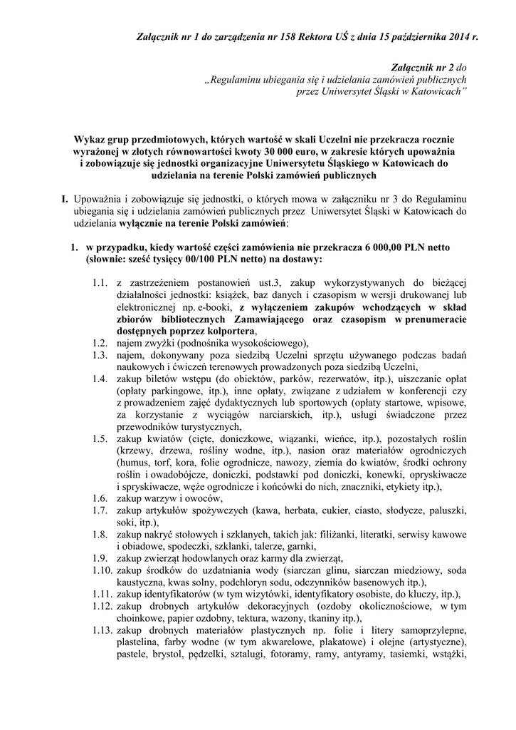 Załącznik nr 1 do zarządzenia nr 158 Rektora UŚ z dnia 15 października 2014 r. Załącznik nr 2 do „Regulaminu ubiegania się i udzielania zamówień publicznych przez Uniwersytet Śląski w Katowicach” Wykaz grup przedmiotowych, których wartość w skali Uczelni nie przekracza rocznie wyrażonej w złotych równowartości kwoty 30 000 euro, w zakresie których upoważnia i zobowiązuje się jednostki organizacyjne Uniwersytetu Śląskiego w Katowicach do udzielania na terenie Polski zamówień publicznych I. Upoważnia i zobowiązuje się jednostki, o których mowa w załączniku nr 3 do Regulaminu ubiegania się i udzielania zamówień publicznych przez Uniwersytet Śląski w Katowicach do udzielania wyłącznie na terenie Polski zamówień: 1. w przypadku, kiedy wartość części zamówienia nie przekracza 6 000,00 PLN netto (słownie: sześć tysięcy 00/100 PLN netto) na dostawy: 1.1. z zastrzeżeniem postanowień ust.3, zakup wykorzystywanych do bieżącej działalności jednostki: książek, baz danych i czasopism w wersji drukowanej lub elektronicznej np. e-booki, z wyłączeniem zakupów wchodzących w skład zbiorów bibliotecznych Zamawiającego oraz czasopism w prenumeracie dostępnych poprzez kolportera, 1.2. najem zwyżki (podnośnika wysokościowego), 1.3. najem, dokonywany poza siedzibą Uczelni sprzętu używanego podczas badań naukowych i ćwiczeń terenowych prowadzonych poza siedzibą Uczelni, 1.4. zakup biletów wstępu (do obiektów, parków, rezerwatów, itp.), uiszczanie opłat (opłaty parkingowe, itp.), inne opłaty, związane z udziałem w konferencji czy z prowadzeniem zajęć dydaktycznych lub sportowych (opłaty startowe, wpisowe, za korzystanie z wyciągów narciarskich, itp.), usługi świadczone przez przewodników turystycznych, 1.5. zakup kwiatów (cięte, doniczkowe, wiązanki, wieńce, itp.), pozostałych roślin (krzewy, drzewa, rośliny wodne, itp.), nasion oraz materiałów ogrodniczych (humus, torf, kora, folie ogrodnicze, nawozy, ziemia do kwiatów, środki ochrony roślin i owadobójcze, doniczki, podstawki pod doniczki, konewki, opryskiwacze i spryskiwacze, węże ogrodnicze i końcówki do nich, znaczniki, etykiety itp.), 1.6. zakup warzyw i owoców, 1.7. zakup artykułów spożywczych (kawa, herbata, cukier, ciasto, słodycze, paluszki, soki, itp.), 1.8. zakup nakryć stołowych i szklanych, takich jak: filiżanki, literatki, serwisy kawowe i obiadowe, spodeczki, szklanki, talerze, garnki, 1.9. zakup zwierząt hodowlanych oraz karmy dla zwierząt, 1.10. zakup środków do uzdatniania wody (siarczan glinu, siarczan miedziowy, soda kaustyczna, kwas solny, podchloryn sodu, odczynników basenowych itp.), 1.11. zakup identyfikatorów (w tym wizytówki, identyfikatory osobiste, do kluczy, itp.), 1.12. zakup drobnych artykułów dekoracyjnych (ozdoby okolicznościowe, w tym choinkowe, papier ozdobny, tektura, wazony, tkaniny itp.), 1.13. zakup drobnych materiałów plastycznych np. folie i litery samoprzylepne, plastelina, farby wodne (w tym akwarelowe, plakatowe) i olejne (artystyczne), pastele, brystol, pędzelki, sztalugi, fotoramy, ramy, antyramy, tasiemki, wstążki, sznurek itp., 1.14. zakup jednorazowych opakowań (torebki, woreczki, pudełka, itp.), 1.15. zakup płyt, taśm i pozostałych nośników z zarejestrowanym dźwiękiem lub obrazem oraz ramek i magazynków do przeźroczy, 1.16. zakup map i planów miast, 1.17. zakup flag, 1.18. zakup pomocy dydaktycznych oraz modeli, plansz, zabawek, gier planszowych i artykułów modelarskich, magnesów itp. używanych do celów dydaktycznych, 1.19. zakup klei: poxipol, poxilina, distal oraz klei kontaktowych i innych (np. superglue, kropelka, cyjanopan), 1.20. zakup spoiw lutowniczych, 1.21. zakup szyb, luster, 1.22. zakup kalkulatorów, 1.23. zakup zegarów, 1.24. zakup ubrań reprezentacyjnych, 1.25. zakup innych, drobnych artykułów, takich jak np. termometry pokojowe, kartki pocztowe, w tym świąteczne i okolicznościowe, lakier do włosów, pinezki, zapałki, świeczki, żyletki, słomki, naftalina, bibuła filtracyjna, lanolina, drożdże, artykuły pasmanteryjne, wieszaki samoprzylepne, tacki styropianowe, chusteczki jednorazowe, baterie do urządzeń elektronicznych niedostępne w magazynie, 1.26. zakup, dokonywany poza siedzibą Uczelni innych drobnych materiałów niezbędnych do działalności dydaktycznej i badawczej prowadzonej poza siedzibą Uczelni, 1.27. zakup artykułów alpinistycznych: liny, sznury, karabinki, szekle, bloczki i innych. 1.28. zakup filmów do aparatów fotograficznych oraz odczynników do wywoływania filmów oraz innych materiałów fotograficznych, 1.29. zakup toreb do notebooków oraz do innego sprzętu elektronicznego. 1.30. zakup środków do zwalczania gryzoni, owadów, itp., 1.31. zakup biletów kolejowych i lotniczych (płatne przelewem1), 1.32. w zakresie krótkoterminowego (tj. nieprzekraczającego 30 dni) wynajmu obiektów lub pomieszczeń na cele dydaktyczne, sportowe lub okolicznościowe, 1.33. zakup wody mineralnej, 1.34. elementy jednorazowego użytku stanowiące wyposażenie defibrylatora 1.35. zakup sprzętu ekspedycyjnego oraz ubiorów specjalistycznych. 1.36. zakup oznaczeń informacyjnych (np. piktogramy, oznaczenia BHP, P.Poż), 1.37. zakup materiałów introligatorskich, 1.38. najem elementów zabezpieczających (ogrodzenia, siatki, rusztowania, daszki i inne). 2. w przypadku, kiedy wartość części zamówienia nie przekracza 6 000,00 PLN netto (słownie: sześć tysięcy 00/100 PLN netto) na usługi: 2.1. nie objęty umową wspólną przewóz osób i towarów wykonywany w trakcie prowadzenia zajęć dydaktycznych lub sportowych, odbywających się poza siedzibą 1 Biletów kolejowych, faktur za usługi hotelarskie oraz faktur za pozostałe wydatki związane z delegacjami służbowymi (z wyjątkiem faktur za opłaty konferencyjne), płatne gotówką ze środków własnych pracownika lub z zaliczek pobranych na delegację nie 