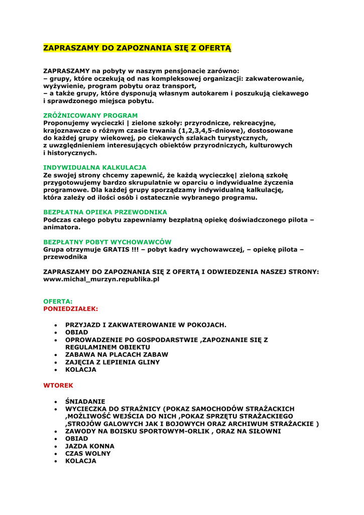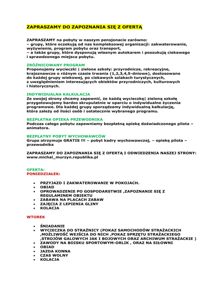 ZAPRASZAMY DO ZAPOZNANIA SIĘ Z OFERTĄ ZAPRASZAMY na pobyty w naszym pensjonacie zarówno: – grupy, które oczekują od nas kompleksowej organizacji: zakwaterowanie, wyżywienie, program pobytu oraz transport, – a także grupy, które dysponują własnym autokarem i poszukują ciekawego i sprawdzonego miejsca pobytu. ZRÓŻNICOWANY PROGRAM Proponujemy wycieczki | zielone szkoły: przyrodnicze, rekreacyjne, krajoznawcze o różnym czasie trwania (1,2,3,4,5-dniowe), dostosowane do każdej grupy wiekowej, po ciekawych szlakach turystycznych, z uwzględnieniem interesujących obiektów przyrodniczych, kulturowych i historycznych. INDYWIDUALNA KALKULACJA Ze swojej strony chcemy zapewnić, że każdą wycieczkę| zieloną szkołę przygotowujemy bardzo skrupulatnie w oparciu o indywidualne życzenia programowe. Dla każdej grupy sporządzamy indywidualną kalkulację, która zależy od ilości osób i ostatecznie wybranego programu. BEZPŁATNA OPIEKA PRZEWODNIKA Podczas całego pobytu zapewniamy bezpłatną opiekę doświadczonego pilota – animatora. BEZPŁATNY POBYT WYCHOWAWCÓW Grupa otrzymuje GRATIS !!! – pobyt kadry wychowawczej, – opiekę pilota – przewodnika ZAPRASZAMY DO ZAPOZNANIA SIĘ Z OFERTĄ I ODWIEDZENIA NASZEJ STRONY: www.michal_murzyn.republika.pl OFERTA: PONIEDZIAŁEK: PRZYJAZD I ZAKWATEROWANIE W POKOJACH. OBIAD OPROWADZENIE PO GOSPODARSTWIE ,ZAPOZNANIE SIĘ Z REGULAMINEM OBIEKTU ZABAWA NA PLACACH ZABAW ZAJĘCIA Z LEPIENIA GLINY KOLACJA WTOREK ŚNIADANIE WYCIECZKA DO STRAŻNICY (POKAZ SAMOCHODÓW STRAŻACKICH ,MOŻLIWOŚĆ WEJŚCIA DO NICH ,POKAZ SPRZĘTU STRAŻACKIEGO ,STROJÓW GALOWYCH JAK I BOJOWYCH ORAZ ARCHIWUM STRAŻACKIE ) ZAWODY NA BOISKU SPORTOWYM-ORLIK , ORAZ NA SIŁOWNI OBIAD JAZDA KONNA CZAS WOLNY KOLACJA ŚRODA ŚNIADANIE WYJAZD DO KOPALNI SOLI W WIELICZCE LUB BOCHNI-DZIECI DOSTAJĄ PROWIANT NA DROGĘ OBIADOKOLACJA POGADUCHY DO PODUCHY CZWARTEK ŚNIADANIE PIECZENIE CHLEBA –WARSZTATY OD ZIARNA DO CHLEBA PRZEJAŻDZKA DO TARTAKU TRAKTOREM PRZEJŚCIE DO STAJNI ,ZWIEDZANIE ZWIERZĄTEK ,GŁASKANIE ,SKAKANIE NA SIANIE , KARMIENIE ZWIERZĄT – WARSZTATY ZE SIANA OBIAD PODCHODY W LESIEN ,RÓŻNE KONKURSY OGNISKO POŁĄCZONE Z KOLACJĄ DYSKOTEKA PIĄTEK ŚNIADANIE WYJŚCIE NA PLATFORMĘ WIDOKOWĄ (OBSERWACJA BESKIDU WYSPOWEGO ORAZ TATRÓW I SŁOWACJI) ŁOWIENIE RYB POKAZ PASIEKI PSZCZÓŁ OMÓWIENIE SZCZEGÓŁOWO ULA ,PLASTRÓW PSZCZELICH ORAZ ZOBACZENIE STROJU PSZCZELEGO OBIAD WYJAZD ZAPRASZAMY