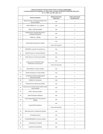 Wykaz pracodawców z którymi zawarto umowy w miesiącu sierpniu 2016 r. w ramach aktywnych form (zgodnie z art. 59b ustawy o promocji zatrudnienia i instytucjach rynku pracy Dz. U. z 2016r., poz. 645 z późn. zm.) Nazwa pracodawcy Rodzaj instrumentu rynku pracy Liczba utworzonych stanowisk pracy 1 Obiady Domowe i Uroczystości Rodzinne W. Grynczel Sokółka staż 1 2 PPHU KRESPOL Sp. z o.o. Sokółka staż 2 3 LARO A. Orłowska Sokółka staż 1 4 Podlaskie Biuro Geodezji Klasyfukacji i Rekultywacji Białystok staż 1 5 VERDE Sp. j. Sokółka staż 1 staż 1 6 Zespół Szkół Integracyjnych Sokółka prace interwencyjne 2 7 PANTEON R. Łapiński, M. Łapiński Sp. j. staż 1 8 Kapitał-Krzywiec A. Krzywiec Białystok staż 1 9 PPHU Vitamina G. Minczewski Sokółka staż 1 Stowarzyszenie EDUKATOR Szkoła Podstawowa Janowszczyzna staż 1 10 prace interwencyjne 2 11 MR CHICKEN D. Kundzicz Sokółka staż 1 12 Akademia Malucha A. Szoka Sokółka staż 1 13 Samodzielny Publiczny Zakład Opieki Zdrowotnej Sokółka staż 1 14 MABiCel G. Przeździecki staż 1 15 Ośrodek Pomocy Społecznej Sokółka staż 1 16 Stowarzyszenie Lokalna Grupa Działania Szlak Tatarki Sokółka staż 1 17 SAM E. Olszewski Sokółka staż 1 18 Szkoła Podstawowa Bogusze staż 1 19 Stomatologia Rodzinna B. Wanczewska Sokółka staż 1 staż 1 20 Zespół Szkół Szudziałowo prace interwencyjne 1 21 Sklep Nowy Dom P. Maliszewski Sokółka staż 1 22 Przedszkole Korycin staż 2 23 FH NIESPODZIANKA M. Kunicka Sokółka staż 1 24 Przedszkole Nr 3 Sokółka staż 2 25 Urząd Gminy Szudziałowo staż 2 26 Przedszkole Nr 4 Sokółka staż 1 27 Polski Dom Rodzinny SERCE J. Lis Sokółka staż 1 28 FHU KRIS-BUD K. Głódź Racewo staż 1 29 Pizzeria Peperoni M. Blichniewicz Sokółka staż 1 30 Zespół Szkół Samorządowych Krynki staż 1 31 Szkoła Podstawowa Nr 1 Sokółka staż 1 32 Przedszkole Nr 1 Sokółka staż 1 33 Stowarzyszenie Na Rzecz Osób Niepełnosprawnych RAZEM Sokółka staż 1 34 Fundacja Sokólski Fundusz Lokalny Sokółka staż 1 35 Zespół Szkół Ogólnokształcących Sokółka staż 1 36 Specjalny Ośrodek Szkolno-Wychowawczy Sokółka staż 4 37 AMBER-PLANET EBJ. s.c. staż 1 38 Powiatowy Zarząd Dróg Sokółka roboty publiczne 1 roboty publiczne 1 39 Zespół Szkół Sokółka prace interwencyjne 2 40 Ośrodek Sportu i Rekreacji Sokółka roboty publiczne 1 41 Urząd Miejski Sokółka roboty publiczne 2 42 Starostwo Powiatowe Sokółka roboty publiczne 5 43 Urząd Gminy Kuźnica prace interwencyjne 4 44 Szkoła Podstawowa Babiki prace interwencyjne 1 45 Sklep Spożywczo-Przemysłowy J. Pul Krynki prace interwencyjne 1 46 Zespół Szkół Kuźnica prace interwencyjne 2 47 Zespół Szkół Korycin prace interwencyjne 1 48 Zespół Szkół Samorządowych Krynki prace interwencyjne 1 49 Szkoła Podstawowa Bogusze prace interwencyjne 1 50 FF Mateusz Hołubowski Sokółka prace interwencyjne 1 51 Urząd Gminy Janów prace interwencyjne 3 52 Zespół Szkół Samorządowych Janów prace interwencyjne 1 53 Przedszkole Kuźnica prace interwencyjne 2 54 Zdanewicz Auto Serwis Zagórze prace interwencyjne 1 Sporz. Alicja Januszkiewicz
