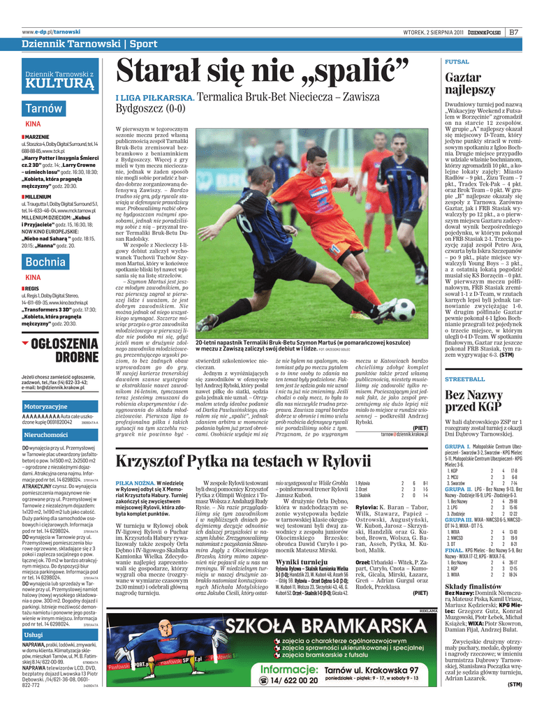 www.e-dp.pl/tarnowski B7 WTOREK, 2 SIERPNIA 2011 Dziennik Tarnowski | Sport Dziennik Tarnowski z KULTURĄ Starał się nie „spalić” I LIGA PIŁKARSKA. Termalica Tarnów KINA ■ MARZENIE ul.Staszica 4, Dolby Digital Surround, tel. 14 688-88-85, www.tck.pl „Harry Potter i Insygnia Śmierci cz.2 3D” godz. 14; „Larry Crowne – uśmiech losu” godz. 16:30, 18:30; „Kobieta, która pragnęła mężczyzny” godz. 20:30. ■ MILLENIUM ul.Traugutta 1, Dolby Digital Surround 5.1, tel. 14–633–46–04, www.mck.tarnow.pl MILLENIUM DZIECIOM: „Kubuś i Przyjaciele” godz. 15, 16:30, 18; NOW KINO EUROPEJSKIE: „Niebo nad Saharą ” godz. 18:15, 20:15; „Hanna” godz. 20. Bochnia KINA ■ REGIS ul.Regis 1, Dolby Digital Stereo, 14–611–69–35, www.kino.bochnia.pl „Transformers 3 3D” godz. 17:30; „Kobieta, która pragnęła mężczyzny” godz. 20:30. OGŁOSZENIA DROBNE Jeżeli chcesz zamieścić ogłoszenie, zadzwoń, tel./fax (14) 622-33-42; e-mail: [email protected] Motoryzacyjne Auta całe uszkodzone kupię 0691820042 3909D4TA-A Nieruchomości wynajęcia przy ul. Przemysłowej w Tarnowie plac utwardzony (asfaltobeton) o pow. 1x1500 m2, 2x2500 m2 – ogrodzone z niezależnymi dojazdami. Atrakcyjna cena najmu. Informacje pod nr tel. 14 6298024. 37911A4TA ATRAKCYJNY czynsz. Do wynajęcia pomieszczenia magazynowe nieogrzewane przy ul. Przemysłowej w Tarnowie z niezależnym dojazdem: 1x120 m2, 1x190 m2 lub jako całość. Duży parking dla samochodów osobowych i ciężarowych. Informacja pod nr tel. 14 6298024. 37911A4TA DO wynajęcia w Tarnowie przy ul. Przemysłowej pomieszczenia biurowe ogrzewane, składające się z 3 pokoi i zaplecza socjalnego o pow. łącznej ok. 70 m2 w bardzo atrakcyjnym miejscu. Do dyspozycji biur miejsca parkingowe. Informacja pod nr tel. 14 6298024. 37911A4TA DO wynajęcia lub sprzedaży w Tarnowie przy ul. Przemysłowej namiot halowy (nowy) wysokiego składowania o pow. 300 m2. Dogodny dojazd i parkingi. Istnieje możliwość demontażu namiotu i ponowne jego postawienie w innym miejscu. Informacja pod nr tel. 14 6298024. 37911A4TA Usługi pralki, lodówki, zmywarki, w domu klienta. Klimatyzacja sklepów, mieszkań Tarnów, ul. M. B. Fatimskiej 8.14/ 622-00-99. 67908D4TA telewizorów LCD, DVD, bezpłatny dojazd Lwowska 13 Piotr Dębowski. /14/621-36-08, 0601822-772 3409D4TA FUTSAL Gaztar najlepszy Bruk-Bet Nieciecza – Zawisza Dwudniowy turniej pod nazwą „Wakacyjny Weekend z Futsalem w Borzęcinie” zgromadził on na starcie 12 zespołów. W grupie „A” najlepszy okazał się miejscowy D-Team, który jedyne punkty stracił w remisowym spotkaniu z Igloo Bochnia. Drugie miejsce przypadło w udziale właśnie bochnianom, którzy zgromadzili 10 pkt., a kolejne lokaty zajęły: Miasto Radłów – 9 pkt., Zizu Team – 7 pkt., Tradex Tek-Pak – 4 pkt. oraz Brok Team – 0 pkt. W grupie „B” najlepsze okazały się zespoły z Tarnowa. Zarówno Gaztar, jak i FRB Stasiak wywalczyły po 12 pkt., a o pierwszym miejscu Gaztaru zadecydował wynik bezpośredniego pojedynku, w którym pokonał on FRB Stasiak 2-1. Trzecią pozycję zajął zespół Petro Ava, czwarta była Iskra Szczepanów – po 9 pkt., piąte miejsce wywalczyli Young Boys – 3 pkt., a z ostatnią lokatą pogodzić musiał się KS Borzęcin – 0 pkt. W pierwszym meczu półfinałowym, FRB Stasiak zremisował 1-1 z D-Team, w rzutach karnych lepsi byli jednak tarnowianie zwyciężając 1-0. W drugim półfinale Gaztar pewnie pokonał 4-1 Igloo. Bochnianie przegrali też pojedynek o trzecie miejsce, w którym ulegli 0-4 D-Team. W spotkaniu finałowym, Gaztar raz jeszcze pokonał FRB Stasiak, tym razem wygrywając 6-3. (STM) Bydgoszcz (0-0) W pierwszym w tegorocznym sezonie meczu przed własną publicznością zespół Tarnaliki Bruk-Betu zremisował bezbramkowo z beniaminkiem z Bydgoszczy. Więcej z gry mieli w tym meczu niecieczanie, jednak w żaden sposób nie mogli sobie poradzić z bardzo dobrze zorganizowaną defensywą Zawiszy. – Bardzo trudno się gra, gdy rywale stawiają w defensywie prawdziwy mur. Próbowaliśmy rozbić obronę bydgoszczan rożnymi sposobami, jednak nie poradziliśmy sobie z nią – przyznał trener Termaliki Bruk-Betu Dusan Radolsky. W zespole z Niecieczy I-ligowy debiut zaliczył wychowanek Tuchovii Tuchów Szymon Martuś, który w końcówce spotkanie bliski był nawet wpisania się na listę strzelców. – Szymon Martuś jest jeszcze młodym zawodnikiem, po raz pierwszy zagrał w pierwszej lidze i uważam, że jest dobrym zawodnikiem. Nie można jednak od niego wszystkiego wymagać. Szczerze mówiąc przepis o grze zawodnika młodzieżowego w pierwszej lidze nie podoba mi się, gdyż jeżeli mam w drużynie zdolnego zawodnika młodzieżowego, prezentującego wysoki poziom, to bez żadnych obaw wprowadzam go do gry. W swojej karierze trenerskiej dawałem szanse występów w ekstraklasie nawet zawodnikom 16-letnim, tymczasem teraz jesteśmy zmuszani do robienia eksperymentów i desygnowania do składu młodzieżowców. Pierwsza liga to profesjonalna piłka i takich sytuacji na tym szczeblu rozgrywek nie powinno być - 20-letni napastnik Termaliki Bruk-Betu Szymon Martuś (w pomarańczowej koszulce) w meczu z Zawiszą zaliczył swój debiut w I lidze. FOT. GRZEGORZ GOLEC stwierdził szkoleniowiec niecieczan. Jednym z wyróżniających się zawodników w ofensywie był Andrzej Rybski, który posłał nawet piłkę do siatki, sędzia gola jednak nie uznał. – Otrzymałem wtedy idealne podanie od Darka Pawlusińskiego, starałem się nie „spalić”, jednak zdaniem arbitra w momencie podania byłem już przed obrońcami. Osobiście wydaje mi się że nie byłem na spalonym, natomiast gdy po meczu pytałem o to inne osoby to zdania na ten temat były podzielone. Faktem jest że sędzia gola nie uznał i nic tu już nie zmienimy. Jeśli chodzi o cały mecz, to była to dla nas niezwykle trudna przeprawa. Zawisza zagrał bardzo dobrze w obronie