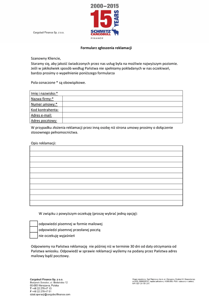 Formularz zgłoszenia reklamacji Szanowny Kliencie, Staramy się, aby jakość świadczonych przez nas usług była na możliwie najwyższym poziomie. Jeśli w jakikolwiek sposób według Państwa nie spełniamy pokładanych w nas oczekiwań, bardzo prosimy o wypełnienie poniższego formularza Pola oznaczone * są obowiązkowe. Imię i nazwisko:* Nazwa firmy:* Numer umowy:* Kod kontrahenta: Adres e-mail: Adres pocztowy: W przypadku złożenia reklamacji przez inną osobę niż strona umowy prosimy o dołączenie stosownego pełnomocnictwa. Opis reklamacji: W związku z powyższym oczekuję (proszę wybrać jedną opcję): odpowiedzi pisemnej w formie mailowej odpowiedzi pisemnej przesłanej pocztą nie oczekuję wyjaśnień Odpowiemy na Państwa reklamację nie później niż w terminie 30 dni od daty otrzymania od Państwa wniosku. Odpowiedź w sprawie reklamacji wyślemy na podany przez Państwa adres mailowy bądź pocztowy. W szczególnie skomplikowanych przypadkach, uniemożliwiających rozpatrzenie reklamacji i udzielenie odpowiedzi w terminie 30 dni, wyślemy Państwu informację o przyczynie opóźnienia w udzieleniu odpowiedzi na reklamację wraz ze wskazaniem okoliczności, które muszą zostać ustalone dla rozpatrzenia sprawy oraz przewidywanego terminu rozpatrzenia reklamacji. _______/_______/_______ (pieczęć firmowa i czytelny podpis, data)