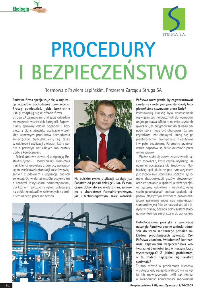 Ekologia PROCEDURY I BEZPIECZEŃSTWO Rozmowa z Pawłem Łapińskim, Prezesem Zarządu Struga SA Państwa firma specjalizuje się w utylizacji odpadów pochodzenia zwierzęcego. Proszę powiedzieć, jakie konkretnie usługi znajdują się w ofercie firmy. Struga SA zajmuje się utylizacją odpadów zwierzęcych wszystkich kategorii. Zapewniamy sprawny odbiór odpadów i bezpieczną dla środowiska utylizację wszelkich ubocznych produktów pochodzenia zwierzęcego. Specjalizujemy się także w odbiorze i utylizacji zwierząt, które padły z przyczyn naturalnych lub zostały ubite z konieczności. Dzięki umowie zawartej z Agencją Restrukturyzacji i Modernizacji Rolnictwa nasi klienci korzystają z pomocy polegającej na częściowej refundacji kosztów związanych z odbiorem i utylizacją padłych zwierząt. Od wielu lat współpracujemy też z licznymi instytucjami samorządowymi, dla których realizujemy usługi polegające na odbiorze odpadów zwierzęcych z administrowanego przez nie terenu. Na polskim rynku utylizacji działają już Państwo od ponad dziesięciu lat. W tym czasie dokonało się wiele zmian, zarówno o charakterze formalno-prawnym, jak i technologicznym. Jakie wdrożyli Państwo rozwiązania, by zagwarantować sanitarne i weterynaryjne standardy bezpieczeństwa stworzone przez Unię? Podstawową kwestią było dostosowanie rozwiązań technologicznych do wymogów unijnego prawa. Miało to na celu uzyskanie gwarancji, że przyjmowane do zakładu odpady, które mogą być obarczone różnymi czynnikami chorobowymi, staną się po przetworzeniu biologicznie nieaktywne i w pełni bezpieczne. Parametry przetwarzania odpadów są ściśle określone przez unijne prawo. Ważne stało się zatem zastosowanie takich rozwiązań, które czynią utylizację jak najmniej obciążającą dla środowiska. Najbardziej spektakularne pod tym względem jest stosowanie sterylizacji ścieków, systemów dezodoryzacji gazów złowonnych oraz ich spalanie w spalarni, a także specjalne systemy odpylania i neutralizowania spalin powstających podczas spalania odpadów. Najlepszym dowodem potwierdzającym spełnianie przez nas najwyższych standardów jest fakt, że nasz zakład, jako jedyny w branży, posiada pełny system stałego monitoringu emisji spalin do atmosfery. Dotychczasowa praktyka z pewnością nasunęła Państwu pewne wnioski odnośnie do stanu sanitarnego polskich zakładów produkujących żywność. Czy, Państwa zdaniem, świadomość konieczności zapewnienia bezpieczeństwa wytwarzanej żywności jest w naszym kraju wystarczająca? Z jakimi problemami w tej materii najczęściej się Państwo spotykają? Trudno mówić o problemach klientów, w sytuacji gdy nasza działalność ma na celu ich rozwiązywanie. Jeśli zaś chodzi o świadomość konieczności zapewnienia 94 Bezpieczeństwo i Higiena Żywności 9/74/2009 Ekologia dów, niezwykle ważne jest to, że w ten sposób rozwiązany zostaje problem ich składowania. Działalność naszej firmy przynosi zatem dwojakiego rodzaju korzyści: po pierwsze, znacznie zmniejsza ryzyko rozprzestrzeniania się groźnych chorób i, po drugie, rozwiązuje problem wyjątkowo kłopotliwych odpadów, których powstawanie we współczesnym świecie jest nieuchronne. bezpieczeństwa zdrowotnego i sanitarnego w przedsiębiorstwach branży mięsnej i spożywczej, to można stwierdzić, że w naszym kraju sytuacja w tym zakresie uległa znacznej poprawie. Służą temu ścisły nadzór weterynaryjny i sanitarny oraz wprowadzane i nieustanne udoskonalane systemy bezpieczeństwa, choćby poprzez popularny HACCP. Nie sądzę, aby dziś możliwe było znalezienie producenta żywności, który uzyskałby zatwierdzenie powiatowego lekarza weterynarii lub państwowego powiatowego inspektora sanitarnego, nie spełniwszy obowiązujących norm i standardów. Nieco gorzej bywa w przypadku małych gospodarstw indywidualnych. Często jeszcze zdarzają się sytuacje porzucania padłych zwierząt gospodarskich i zwierząt domowych w lasach. Wielu rolnikom brakuje również świadomości, że każdy przypadek odbioru zwierząt musi być odpowiednio udokumentowany, a zmiana stanu liczebności posiadanego przez nich stada wymaga każdorazowo rejestrowania w ARiMR. Stąd często zdarzają się sytuacje, że odbierane przez nas zwierzęta nie były wcześniej zarejestrowane i w związku z tym nie ma podstaw do ubiegania się o pomoc finansową w zakresie refundacji kosztów utylizacji. Państwa firma angażuje się w działania proekologiczne poprzez odzyskiwanie energii zawartej w różnego rodzaju odpadach zwierzęcych. Jakie wymierne korzyści przynosi środowisku spalanie biomasy. Czy oszczędności, które dzięki temu powstają, są znaczne? Nasza firma posiada jedyną w kraju aktywną instalację do utylizacji mączki mięsno-kostnej. Wytwarzana w tym procesie para technologiczna jest przekształcana na energię elektryczną. Jest to proces przy- jazny dla środowiska naturalnego. Spalanie biomasy staje się coraz bardziej popularne nie tylko z powodu cen paliw kopalnych oraz wyczerpywania się ich zasobów. Powodem tego są również coraz bardziej restrykcyjne limity emisji dwutlenku węgla do atmosfery i związana z nimi polityka energetyczna skierowana na zwiększanie udziału energii pozyskanej ze źródeł al- „ Nasza firma posiada jedyną w kraju aktywną instalację do utylizacji mączki mięsno-kostnej „ ternatywnych. Powszechnie wiadomo, że spalanie biomasy jest znacznie korzystniejsze dla środowiska niż spalanie paliw kopalnych. Wynika to przede wszystkim ze znacznie niższej zawartości szkodliwych pierwiastków, przede wszystkim zaś siarki i metali ciężkich. Ważne jest również to, aby dwutlenek węgla uwalniany do atmosfery podczas spalania biomasy został najpierw z niej związany poprzez kolejne pokolenia organizmów żywych, co w tym przypadku odbyło się w stosunkowo krótkim czasie. Natomiast dwutlenek węgla powst