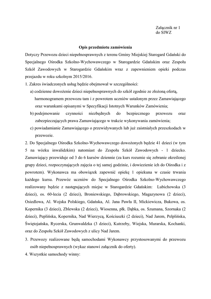 Załącznik nr 1 do SIWZ Opis przedmiotu zamówienia Dotyczy Przewozu dzieci niepełnosprawnych z terenu Gminy Miejskiej Starogard Gdański do Specjalnego Ośrodka Szkolno-Wychowawczego w Starogardzie Gdańskim oraz Zespołu Szkół Zawodowych w Starogardzie Gdańskim wraz z zapewnieniem opieki podczas przejazdu w roku szkolnym 2015/2016. 1. Zakres świadczonych usług będzie obejmował w szczególności: a) codzienne dowożenie dzieci niepełnosprawnych do szkół zgodnie ze złożoną ofertą, harmonogramem przewozu tam i z powrotem uczniów ustalonym przez Zamawiającego oraz warunkami opisanymi w Specyfikacji Istotnych Warunków Zamówienia; b) podejmowanie czynności niezbędnych do bezpiecznego przewozu oraz zabezpieczających prawa Zamawiającego w trakcie wykonywania zamówienia; c) powiadamianie Zamawiającego o przewidywanych lub już zaistniałych przeszkodach w przewozie. 2. Do Specjalnego Ośrodka Szkolno-Wychowawczego dowożonych będzie 41 dzieci (w tym 5 na wózku inwalidzkim) natomiast do Zespołu Szkół Zawodowych - 1 dziecko. Zamawiający przewiduje od 3 do 6 kursów dziennie (za kurs rozumie się zebranie określonej grupy dzieci, rozpoczynających zajęcia o tej samej godzinie, i dowiezienie ich do Ośrodka i z powrotem). Wykonawca ma obowiązek zapewnić opiekę 1 opiekuna w czasie trwania każdego kursu. Przewóz uczniów do Specjalnego Ośrodka Szkolno-Wychowawczego realizowany będzie z następujących miejsc w Starogardzie Gdańskim: Lubichowska (3 dzieci), os. 60-lecia (2 dzieci), Broniewskiego, Dąbrowskiego, Magazynowa (2 dzieci), Osiedlowa, Al. Wojska Polskiego, Gdańska, Al. Jana Pawła II, Mickiewicza, Bukowa, os. Kopernika (3 dzieci), Zblewska (2 dzieci), Wiosenna, płk. Dąbka, os. Szumana, Szornaka (2 dzieci), Peplińska, Kopernika, Nad Wierzycą, Kościuszki (2 dzieci), Nad Jarem, Pelplińska, Świętojańska, Rycerska, Grunwaldzka (3 dzieci), Kutrzeby, Wiejska, Murarska, Kochanki, oraz do Zespołu Szkół Zawodowych z ulicy Nad Jarem. 3. Przewozy realizowane będą samochodami Wykonawcy przystosowanymi do przewozu osób niepełnosprawnych (wykaz stanowi załącznik do oferty). 4. Wszystkie samochody winny: - posiadać aktualne badania techniczne, dopuszczające pojazd do ruchu drogowego oraz aktualne ubezpieczenie odpowiedzialności cywilnej i następstw nieszczęśliwych wypadków, - przystosowane do przewozu osób niepełnosprawnych, tzn. posiadają windy lub podjazdy dla wózków, wyposażone są w pasy bezpieczeństwa umożliwiające przewóz uczniów w liczbie określonej dla danej trasy i opiekunów, zgodny z liczbą miejsc wpisaną do dowodu rejestracyjnego pojazdu. W przypadku oferty wspólnej wykonawców, powyższy warunek można spełnić łącznie. Zamawiający wymaga wykazania przynajmniej trzech pojazdów posiadających wyżej wymienione parametry. Zamawiający nie dopuszcza udziału podwykonawców w wykonaniu zamówienia. W uzasadnionych przypadkach (np. awaria techniczna pojazdu) Wykonawca niezwłocznie podstawi zastępczy środek transportu w taki sposób, aby zapewnić równorzędny poziom realizacji zamówienia. Wykonawca może polegać na wiedzy i doświadczeniu, potencjale technicznym, osobach zdolnych do wykonania zamówienia innych podmiotów, niezależnie od charakteru prawnego łączących go z nim stosunków. Wykonawca w takiej sytuacji zobowiązany jest udowodnić Zamawiającemu, iż będzie dysponował zasobami niezbędnymi do realizacji zamówienia w szczególności przedstawiając w tym celu pisemne zobowiązanie tych podmiotów do oddania mu do dyspozycji niezbędnych zasobów na okres korzystania z nich przy wykonywaniu zamówienia. 5. Cena ofertowa powinna uwzględniać wszystkie koszty związane z realizacją zamówienia. RAMOWY ZAKRES OBOWIĄZKÓW OPIEKUNÓW PRZY PRZEWOZACH UCZNIÓW NIEPEŁNOSPRAWNYCH DO SOSW i ZSZ W STAROGARDZIE GDAŃSKIM: 1) opiekun odpowiada za bezpieczeństwo uczniów w czasie przewozu, a także w czasie przejścia z pojazdu samochodowego do szkoły i ze szkoły do pojazdu samochodowego, 2) opiekun pomaga uczniom wsiąść i wysiąść z pojazdu samochodowego, 3) opiekun odpowiada za to, aby w czasie przewozu uczniowie byli zabezpieczeni pasami lub przewożeni w fotelikach (dostarczonych przez rodziców lub opiekunów prawnych), 4) opiekun doprowadza uczniów z pojazdu samochodowego do szkoły i oddaje pod opiekę wychowawcy, a po zakończonych lekcjach/zajęciach odbiera uczniów ze szkoły i doprowadza ich do pojazdu samochodowego, 5) opiekun po zajęciach/lekcjach przekazuje uczniów rodzicom lub opiekunom prawnym lub też osobom wskazanym przez rodziców lub opiekunów prawnych, 6) osoby sprawujące opiekę nad uczniami muszą być przeszkolone w zakresie udzielania pierwszej pomocy, pierwszej pomocy medycznej lub pierwszej pomocy przedmedycznej, które przeszły szkolenie dla opiekunów dzieci przewożonych do szkół (np. organizowane przez Ośrodek Ruchu Drogowego). W przypadku oferty wspólnej wykonawców powyższy warunek można spełnić łącznie. 7) opiekun odpowiada za umieszczenie uczniów w pojeździe w sposób niezagrażający zdrowiu i życiu uczniów i współpasażerów, 8) Zamawiający wyklucza możliwość łączenia funkcji kierowcy i opiekuna.