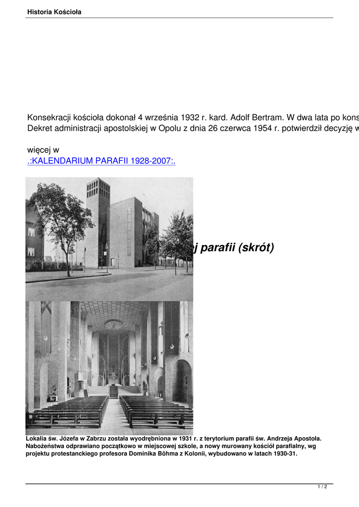 Historia Kościoła Konsekracji kościoła dokonał 4 września 1932 r. kard. Adolf Bertram. W dwa lata po kons Dekret administracji apostolskiej w Opolu z dnia 26 czerwca 1954 r. potwierdził decyzję w więcej w .:KALENDARIUM PARAFII 1928-2007:. HISTORIA naszej parafii (skrót) Lokalia św. Józefa w Zabrzu została wyodrębniona w 1931 r. z terytorium parafii św. Andrzeja Apostoła. Nabożeństwa odprawiano początkowo w miejscowej szkole, a nowy murowany kościół parafialny, wg projektu protestanckiego profesora Dominika Böhma z Kolonii, wybudowano w latach 1930-31. 1/2 Historia Kościoła Budowniczym kościoła był proboszcz parafii św. Andrzeja Apostoła, ks. Jan Zwior. Kościół pw. św. Józefa stanowi jeden z ciekawszych przykładów architektury modernistycznej na Górnym Śląsku. Pod kościołem znajduje się duża krypta z ołtarzem poświęconym patronce górników - św. Barbarze 2/2