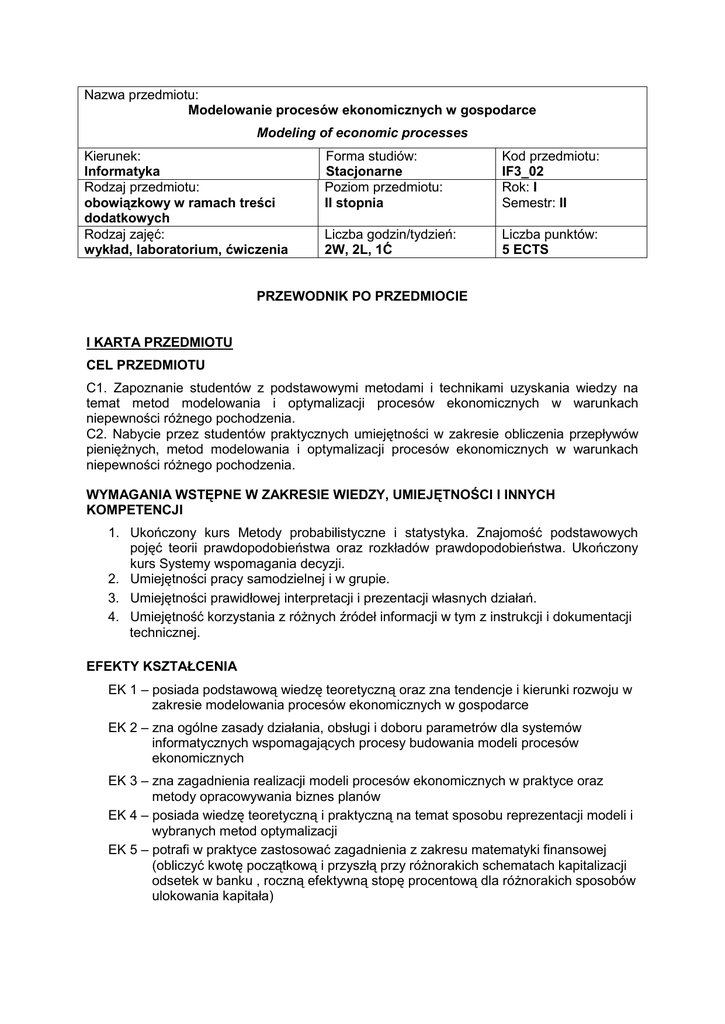 Nazwa przedmiotu: Modelowanie procesów ekonomicznych w