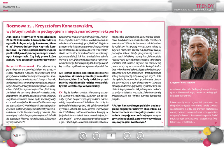 2/2013 Rozmowa z.... Rozmowa z… Krzysztofem Konarzewskim, wybitnym polskim pedagogiem i międzynarodowym ekspertem Agnieszka Pietryka: W roku szkolnym 2012/2013 Minister Edukacji Narodowej ogłosiła kolejną edycję konkursu „Mam 6 lat”. Przewodniczył Pan Kapitule konkursowej i w trakcie gali podsumowującej podkreślał jakość prac wykonanych w różnych kategoriach. Czy były prace, które zyskały Pana szczególne zainteresowanie? Krzysztof Konarzewski: Z przyjemnością powtórzę to, co powiedziałem na uroczystości rozdania nagród: cała kapituła była pozytywnie zaskoczona jakością prac. Spodziewaliśmy się okolicznościowych laurek, a obejrzeliśmy starannie przemyślane prezentacje. Autorzy antycypowali wątpliwości rodziców i zbijali je za pomocą faktów. „Boicie się, że dzieci nie dostaną obiadu? – Niesłusznie, popatrzcie, jak działa nasza stołówka szkolna”, „Myślicie, że wasze dzieci będą spędzały cały czas w dusznej izbie klasowej? – Zapraszamy na plac zabaw”. W niektórych pracach pokazywano systematyczny wzrost liczby sześciolatków w szkole. To przekonujący przekaz: „Coraz więcej rodziców posyła swoje sześciolatki do pierwszej klasy w naszej szkole. Dlaczego wy się wahacie?”. Sporo prac miało oryginalną formę. Pamiętam, że jedna z nich została wystylizowana na wiadomość z telewizyjnych „Faktów”. Najpierw prezenterka informowała o ruchu posyłania sześciolatków do szkoły, potem w towarzystwie uczennicy i z mikrofonem w ręku wypytywała dzieci, jak im się wiedzie w szkole. Mówię o tym, ponieważ nakręcenie i zmontowanie takiego filmu wymagało dużego wysiłku, o który zwykle nie podejrzewa się rodziców. AP: Istotną częścią społeczności szkolnej są rodzice. W trakcie prezentacji laureatów konkursu „Mam 6 lat” rady rodziców przedstawiły, w jaki sposób rodzice mogą efektywnie uczestniczyć w życiu szkoły. KK: To, że konkurs został skierowany akurat do uczniów i rodziców, uważam za doskonały wybór. Po pierwsze, gdy rodzice namawiają do posłania sześciolatków do szkoły, to są bardziej wiarygodni, niż gdyby to mówił dyrektor. Szkoła ma swój interes w przyjęciu sześciolatków, natomiast rodzice kierują się jedynie dobrem dzieci. Jeszcze ważniejsze jest „po drugie” – że ministerstwo prosi rodziców o głos i słucha go. To wielka rzadkość; jakoś nie mogę sobie przypomnieć, żeby władze oświatowe kiedykolwiek konsultowały cokolwiek z rodzicami. Wiem, że ten zwrot ministerstwa ku rodzicom jest trochę wymuszony, mimo to daje on rodzicom szansę na poprawę swojej pozycji w szkole. Kiedy spotykam się z rodzicami sześciolatków, mówię im: „Nie musicie rozstrzygać, czy obniżenie wieku szkolnego w Polsce jest słuszne, czy nie, ale musicie się przekonać, czy waszemu dziecku będzie dobrze w konkretnej szkole. A jest tylko jeden sposób, żeby się o tym przekonać – trzeba pójść do szkoły i obejrzeć ją od piwnicy po strych. Jeśli nie będziecie zadowoleni, powinniście otwarcie powiedzieć o tym dyrektorowi”. Krótko mówiąc, rodzice mają szansę wyłamać się z roli nieśmiałego petenta i tak już trzymać do końca pobytu dziecka w szkole. Szkoła może się zrazu krzywić, ale i jej taki partner bardzo się przyda. AP: Jest Pan wybitnym polskim pedagogiem i międzynarodowym ekspertem. Co Pana zdaniem w szczególny sposób uzasadnia decyzję o wcześniejszym rozpoczynaniu edukacji, zarówno w wymiarze krajowym, jak i światowym? 5 Krzysztof Konarzewski Absolwent Wydziału Pedagogicznego Uniwersytetu Warszawskiego, profesor pedagogiki i ekspert oświatowy. Interesuje się w szczególności systemem polskiej oświaty i jego reformami, szkołą (zwłaszcza relacjami między programem kształcenia, nauczycielami i uczniami) oraz teorią pomiaru osiągnięć szkolnych. Pracuje w Instytucie Badań Edukacyjnych w Warszawie i Wszechnicy Świętokrzyskiej w Kielcach. 2/2013 Rozmowa z.... KK: W Polsce od czasu odzyskania niepodległości w 1918 r. obowiązek szkolny obejmuje dzieci siedmioletnie, ale we współczesnej Europie jest to rozwiązanie mniejszościowe. Stosują je kraje skandynawskie: Dania, Finlandia i Szwecja, przy czym w tych dwóch ostatnich krajach znaczna część rodziców korzysta z prawa posłania dziecka do szkoły o rok wcześniej. Oprócz nich także kraje bałtyckie – Litwa, Łotwa, Estonia – oraz Bułgaria. Prawie dwie trzecie krajów posyła do szkoły dzieci sześcioletnie. W Anglii i Walii idą do szkoły pięciolatki, a w Irlandii Północnej – czterolatki. Wielokrotnie pytałem, co przemawia za tym, by polskie dziecko dopiero przygotowywało się do nauki, podczas gdy większość jego rówieśników w Europie już ją pobiera? Czyżby nasze dzieci wolniej się rozwijały? W odpowiedzi nieodmiennie słyszałem argument typowy dla tradycjonalistów: myśmy zaczynali szkołę w wieku siedmiu lat i proszę – na jakich wspaniałych ludzi wyrośliśmy. Ale tradycjonaliści nie biorą pod uwagę zmian, jakie zaszły w naszym świecie. Dzisiejszy sześciolatek w niczym nie przypomina rówieśnika sprzed 50 lat – z koszulą w zębach, nieumiejącego odpowiedzieć na najprostsze pytania. Jest tak dlatego, że dzisiejszy świat nieustannie stymuluje rozwój sześciolatka. Trzeba tu wymienić dwa główne czynniki: wzrost wykształcenia rodziców i technologię infor- matyczną. Wykształceni rodzice rozmawiają ze swoimi dziećmi, podczas gdy kiedyś większość rodziców jedynie dbała o zaspokojenie ich podstawowych potrzeb. Gry komputerowe dostarczają dziecku mnóstwa informacji o świecie, a jednocześnie doskonalą jego inteligencję. „Chińczyk”, w którego ja grałem w dzieciństwie, nie dawał tego. Psychologia rozwoju dziecka przestrzega przed nudą. Nuda hamuje rozwój. Przeciętny sześciolatek po rocznym przygotowaniu przedszkolnym jest gotowy do nauki w pierwszej klasie. Jeśli rodzice 