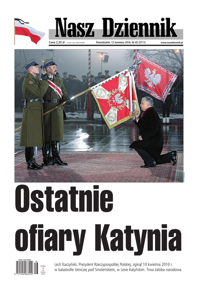 (w tym 7 proc. VAT) 0.50 USD Poniedzia∏ek, 12 kwietnia 2010, Nr 85 (3711) www.naszdziennik.pl FOT. R. SOBKOWICZ Cena 2,20 z∏ Ostatnie ofiary Katynia WYDANIE 2 NR INDEKSU 349461 Lech Kaczyƒski, Prezydent Rzeczypospolitej Polskiej, zginà∏ 10 kwietnia 2010 r. w katastrofie lotniczej pod Smoleƒskiem, w Lesie Katyƒskim. Trwa ˝a∏oba narodowa. Poniedzia∏ek, 12 kwietnia 2010 TRAGEDIA W LESIE KATY¡SKIM 2010 KALENDARIUM KATASTROFY SOBOTA, 10 KWIETNIA 07.15 – samolot Tu-154 M z polskim prezydentem na pok∏adzie startuje z warszawskiego lotniska Ok´cie; na pok∏adzie oprócz pary prezydenckiej znajdujà si´ najwa˝niejsze osoby w Polsce, Rodziny Katyƒskie; 08.56 – maszyna rozbija si´, podchodzàc do làdowania na lotnisku wojskowym Siewiernyj. Samolot runà∏ ok. 2 km od pasa startowego. Na pok∏adzie by∏o 88 pasa˝erów i siedmiu cz∏onków za∏ogi; wed∏ug pierwszych doniesieƒ Rosjan do katastrofy mia∏o dojÊç w trudnych warunkach pogodowych, przy czwartej próbie podejÊcia do làdowania. Cz´Êç osób, które by∏y w Smoleƒsku, twierdzi jednak, ˝e pogoda by∏a s∏oneczna, a niebo czyste. Podchodzàc do làdowania, samolot mia∏ zahaczyç skrzyd∏em (wed∏ug innych Êwiadków statecznikiem) o drzewa na koƒcu pasa startowego. W tym czasie na cmentarzu katyƒskim odbywa si´ Msza Êw., którà odprawi∏ proboszcz parafii katolickiej w Smoleƒsku ks. Ptolemeusz. By∏ to jedyny punkt programu sobotnich uroczystoÊci w 70. rocznic´ zbrodni sowieckiego NKWD na polskich jeƒcach wojennych; 09.25 – Polska Agencja Prasowa, powo∏ujàc si´ na MSZ, podaje informacj´: „Prezydencki samolot rozbi∏ si´ w Smoleƒsku”; 09.36 – ekipy ratownicze zakoƒczy∏y gaszenie p∏onàcego samolotu, podj´to prób´ wydobycia cia∏ pasa˝erów; 09.41 – rosyjskie ministerstwo ds. sytuacji nadzwyczajnych informuje o 87 ofiarach; 09.54 – PAP, powo∏ujàc si´ na gubernatora obwodu smoleƒskiego, powiadamia: „Nikt nie prze˝y∏”; 10.12 – komunikat MSZ oznajmia: „Najprawdopodobniej nikt nie prze˝y∏”; 10.15 – prezydent Rosji Dmitrij Miedwiediew powo∏uje specjalnà komisj´ do zbadania przyczyn katastrofy polskiego samolotu, na jej czele staje premier Rosji W∏adimir Putin; 10.32 – trwajà prace s∏u˝b ratowniczych na lotnisku w Smoleƒsku; 10.36 – rzecznik MSZ podaje: „Prezydencka para najprawdopodobniej nie ˝yje”; 10.41 – lista pasa˝erów Tu-154 zostaje poszerzona przez Komitet Âledczy przy Prokuraturze Generalnej Federacji Rosyjskiej do 132 osób; 10.55 – MSZ Rosji potwierdza, ˝e nikt nie prze˝y∏ katastrofy; 11.20 – polskie MSZ utrzymuje, ˝e na pok∏adzie samolotu by∏o 88 osób; 11.20 – nieoficjalne informacje: 3 osoby prze˝y∏y katastrof´; 12.00 – na Wawelu zabrzmia∏ Dzwon Zygmunta, na cmentarzu wojskowym w Katyniu dobieg∏a koƒca Msza Êw. w intencji ofiar katastrofy prezydenckiego samolotu – uroczystoÊci katyƒskie zosta∏y odwo∏ane; 12.18 – nadzór nad Êledztwem obejmuje prokurator generalny Rosji Jurij Czajka; 12.22 – na miejsce katastrofy leci naczelny prokurator wojskowy p∏k Krzysztof Parulski; 12.40 – trwa weryfikacja listy pasa˝erów; 13.00 – nadzwyczajne posiedzenie Rady Ministrów w Warszawie, wczeÊniej premier Donald Tusk odby∏ d∏ugà rozmow´ telefonicznà z szefem rosyjskiego rzàdu W∏adimirem Putinem; 13.42 – zostaje odnaleziona pierwsza czarna skrzynka; 13.43 – lista pasa˝erów samolotu rzàdowego Tu-154 M podana przez Rzàdowe Centrum Bezpieczeƒstwa obejmuje 88 pasa˝erów, 8 cz∏onków za∏ogi, w tym funkcjonariuszk´ BOR b´dàcà równoczeÊnie stewardesà; 13.46 – marsza∏ek Sejmu RP og∏asza tygodniowà ˝a∏ob´ narodowà; 15.00 – na teren lotniska w Smoleƒsku przywieziono pierwsze trumny; 15.37 – ministerstwo ds. nadzwyczajnych Rosji podaje: „W katastrofie zgin´∏o 97 osób”; 15.37 – odnaleziono drugà czarnà skrzynk´; 15.48 – prezydent Miedwiediew og∏osi∏ ˝a∏ob´ narodowà w Rosji na dzieƒ 12 kwietnia; 16.10 – na miejscu katastrofy odnaleziono cia∏o prezydenta Lecha Kaczyƒskiego; 19.18 – rozpoczà∏ si´ transport do Moskwy cia∏ ofiar katastrofy; 19.39 – wydobyto cia∏a wszystkich ofiar wypadku pod Smoleƒskiem. Ca∏y kraj pogrà˝ony jest w ˝a∏obie. Sprawowane sà Msze Âwi´te w intencji wszystkich ofiar katastrofy. Tysiàce zniczy p∏onà na Krakowskim PrzedmieÊciu przed pustym Pa∏acem Prezydenckim i na pl. Pi∏sudskiego w Warszawie; 20.02 – polscy prokuratorzy dotarli do Smoleƒska; 21.40 – premierzy Rosji i Polski z∏o˝yli wiàzanki kwiatów na miejscu katastrofy; 21.47 – wszystkie cia∏a ofiar katastrofy pod Smoleƒskiem zosta∏y przetransportowane na moskiewskie lotnisko; 22.16 – PAP: „Prezes PiS Jaros∏aw Kaczyƒski, który przyby∏ na miejsce katastrofy, zidentyfikowa∏ zw∏oki prezydenta Lecha Kaczyƒskiego i jego ˝ony Marii Kaczyƒskiej”; 22.48 – premierzy Rosji i Polski uczestniczyli w telekonferencji z przedstawicielami w∏adz Moskwy nt. przygotowaƒ do identyfikacji ofiar tragicznego wypadku. NIEDZIELA, 11 KWIETNIA 00.27 – Donald Tusk wylecia∏ z Witebska do Warszawy; 04.38 – samolot z Jaros∏awem Kaczyƒskim wylàdowa∏ na lotnisku w Warszawie; 07.47 – specjalny pociàg ze Smoleƒska z uczestnikami uroczystoÊci katyƒskich przyjecha∏ do Warszawy; 08.41 – w Smoleƒsku w rejonie katastrofy pracuje ponad 800 osób; 09.08 – Rosjanie i Polacy rozpocz´li badanie czarnych skrzynek samolotu; 09.15 – cia∏o Lecha Kaczyƒskiego ma trafiç prosto do Warszawy, cia∏a pozosta∏ych ofiar majà byç identyfikowane w Moskwie; 09.17 – paƒstwowa telewizja Rossija: „Wieczorem wyemitujemy film »Katyƒ« Andrzeja Wajdy”; 10.04 – zidentyfikowano 12 cia∏; 10.10 – Krzysztof Kwiatkowski: „Jest wst´pna identyfikacja 24 cia∏”; 10.22 – zapowiedê: „Oko∏o godz. 14.00 trumny ze zw∏okami Lecha Kaczyƒskiego, Ryszarda Kaczorowskiego i Krz