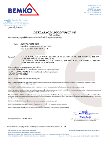BEMKO Sp. z o.o. ul. Annopol 21 03-236 Warszawa tel. 0 22 732 11 85 tel./fax: 0 22 732 11 86 www.bemko.eu …………………….. pieczęć firmowa DEKLARACJA ZGODNOŚCI WE NR: 46/2013 Deklarujemy z pełną odpowiedzialnością, że wyrób (wyroby) Opis: DOWNLIGHT LED napięcie znamionowe: ~230V/50Hz moc max: 6W, 12W, 18W, 24W Symbol: SLS-120-060-3K, SLS-120-060-4K , SLS-180-120-3K, SLS-180-120-4K , SLS-240-180-3K, SLS-240180-4K, SLS-300-240-3K, SLS-300-240-4K SLR-120-060-3K, SLR-120-060-4K , SLR-180-120-3K, SLR-180-120-4K , SLR-240-180-3K, SLR-240180-4K, SLR-300-240-3K, SLR-300-240-4K jest zgodny z wymaganiami dyrektyw: - LVD – 2006/95/WE – urządzenia elektryczne niskonapięciowe - EMC – 2004/108/WE – kompatybilność elektromagnetyczna - RoHS - 2011/65/WE oraz z normami zharmonizowanymi: PN-EN 55015:2006+A1:2007+A2:2009 Poziomy dopuszczalne i metody pomiarów zaburzeń radioelektrycznych wytwarzanych przez elektryczne urządzenia oświetleniowe i urządzenia podobne . PN-EN61547:2009 Sprzęt do ogólnych celów oświetleniowych -- Wymagania dotyczące kompatybilności elektromagnetycznej PN-EN 61000-3-2:2006+A1:2009+A2:2009 Kompatybilność elektromagnetyczna (EMC) -- Część 3-2: Poziomy dopuszczalne -- Poziomy dopuszczalne emisji harmonicznych prądu (fazowy prąd zasilający odbiornika < lub = 16 A) PN-EN 61000-3-3:2008 Kompatybilność elektromagnetyczna (EMC) -- Część 3-3: Poziomy dopuszczalne -- Ograniczanie zmian napięcia, wahań napięcia i migotania światła w publicznych sieciach zasilających niskiego napięcia, powodowanych przez odbiorniki o fazowym prądzie znamionowym < lub = 16 A przyłączone bezwarunkowo PN-EN 62471:2008 Bezpieczeństwo fotobiologiczne lamp i systemów lampowych PN-EN 60598-1:2008+A11:2009 Oprawy oświetleniowe -- Część 1: Wymagania ogólne i badania PN-EN 62031:2008 Moduły LED do ogólnych celów oświetleniowych -- Wymagania bezpieczeństwa Warszawa dnia 04.05.2013 imię, nazwisko i stanowisko osoby upoważnionej do wystawienia deklaracji zgodności Ostatnie dwie cyfry roku, w którym naniesiono oznaczenie CE: 13 Wysokość kapitału zakładowego – 50.000,00 złotych Sąd Rejonowy dla m.st. Warszawy w Warszawie, XIII Wydział Gospodarczy Krajowego Rejestru Sądowego Siedziba kraj: Polska, woj. Mazowieckie, m.st. Warszawa, gmina m.st. Warszawa, miejscowość Warszawa KRS – 0000278651, NIP – 118-18-84-396, REGON – 140893162 Konto DB PBC S.A. Nr. Rachunku: 81 1910 1048 2787 8320 2675 0001