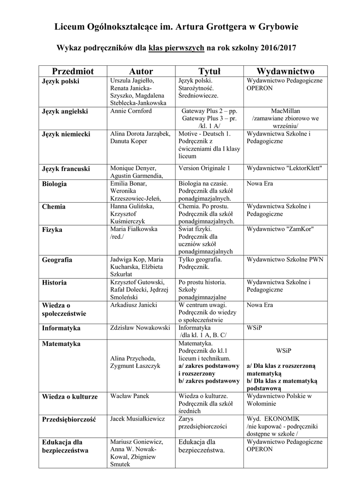 Liceum Ogólnokształcące im. Artura Grottgera w Grybowie Wykaz podręczników dla klas pierwszych na rok szkolny 2016/2017 Przedmiot Język polski Język angielski Autor Urszula Jagiełło, Renata JanickaSzyszko, Magdalena Steblecka-Jankowska Annie Cornford Język niemiecki Alina Dorota Jarząbek, Danuta Koper Język francuski Monique Denyer, Agustin Garmendia, Emilia Bonar, Weronika Krzeszowiec-Jeleń, Hanna Gulińska, Krzysztof Kuśmierczyk Maria Fiałkowska /red./ Biologia Chemia Fizyka Geografia Historia Wiedza o społeczeństwie Informatyka Jadwiga Kop, Maria Kucharska, Elżbieta Szkurłat Krzysztof Gutowski, Rafał Dolecki, Jędrzej Smoleński Arkadiusz Janicki Zdzisław Nowakowski Matematyka Alina Przychoda, Zygmunt Łaszczyk Wiedza o kulturze Wacław Panek Przedsiębiorczość Jacek Musiałkiewicz Edukacja dla bezpieczeństwa Mariusz Goniewicz, Anna W. NowakKowal, Zbigniew Smutek Tytuł Język polski. Starożytność. Średniowiecze. Wydawnictwo Wydawnictwo Pedagogiczne OPERON Gateway Plus 2 – pp. MacMillan Gateway Plus 3 – pr. /zamawiane zbiorowo we /kl. 1 A/ wrześniu/ Motive - Deutsch 1. Wydawnictwa Szkolne i Podręcznik z Pedagogiczne ćwiczeniami dla I klasy liceum Version Originale 1 Wydawnictwo "LektorKlett" Biologia na czasie. Podręcznik dla szkół ponadgimazjalnych. Chemia. Po prostu. Podręcznik dla szkół ponadgimnazjalnych. Świat fizyki. Podręcznik dla uczniów szkół ponadgimnazjalnych Tylko geografia. Podręcznik. Nowa Era Po prostu historia. Szkoły ponadgimnazjalne W centrum uwagi. Podręcznik do wiedzy o społeczeństwie Informatyka /dla kl. 1 A, B. C/ Matematyka. Podręcznik do kl.1 liceum i technikum. a/ zakres podstawowy i rozszerzony b/ zakres podstawowy Wydawnictwa Szkolne i Pedagogiczne Wiedza o kulturze. Podręcznik dla szkół średnich Zarys przedsiębiorczości Edukacja dla bezpieczeństwa. Wydawnictwa Szkolne i Pedagogiczne Wydawnictwo "ZamKor" Wydawnictwo Szkolne PWN Nowa Era WSiP WSiP a/ Dla klas z rozszerzoną matematyką b/ Dla klas z matematyką podstawową Wydawnictwo Polskie w Wołominie Wyd. EKONOMIK /nie kupować - podręczniki dostępne w szkole / Wydawnictwo Pedagogiczne OPERON