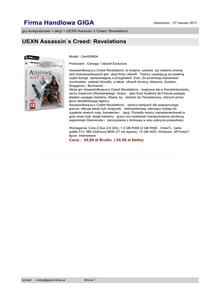 Firma Handlowa GIGA Utworzono : 07 marzec 2017 gry komputerowe > akcji > UEXN Assassin`s Creed: Revelations UEXN Assassin`s Creed: Revelations Model : Cen000804 Producent : Cenega / Ubisoft Exclusive Assassin’s Creed Revelations to kolejna, czwarta już odsłona znanej serii trzecioosobowych gier akcji firmy Ubisoft. Twórcy uważają ją za ostatnią część trylogii opowiadającej o przygodach Ezio. Za produkcję odpowiada montrealski oddział Ubisoftu, a także Ubisoft Annecy, Massive, Quebec, Singapore i Bucharest. Akcja gry Assassin’s Creed Revelations rozgrywa się w Konstantynopolu, sercu imperium Ottomańskiego. Gracz, jako Ezio Auditore da Firenze podążą śladem swojego mentora, Altaira, by dotrzeć do Templariuszy, których armia grozi destabilizacją regionu. Assassin’s Creed Revelations, oprócz kampanii dla pojedynczego gracza, oferuje także tryb rozgrywki wieloosobowej, oferujący dostęp do zupełnie nowych map, bohaterów i opcji. Ponadto twórcy zaimplementowali w grze nowy tryb, dzięki któremu gracz ma możliwość manipulowania strukturą wspomnień Desmonda i skorzystania z Animusa w celu odkrycia przeszłości. Wymagania: Core 2 Duo 2.6 GHz, 1.5 GB RAM (2 GB RAM - Vista/7), karta grafiki 512 MB (GeForce 8800 GT lub lepsza), 12 GB HDD, Windows XP/Vista/7, łącze internetowe Cena : 54,99 zł Brutto ( 54,99 zł Netto) kontakt : - [email protected] Strona 1