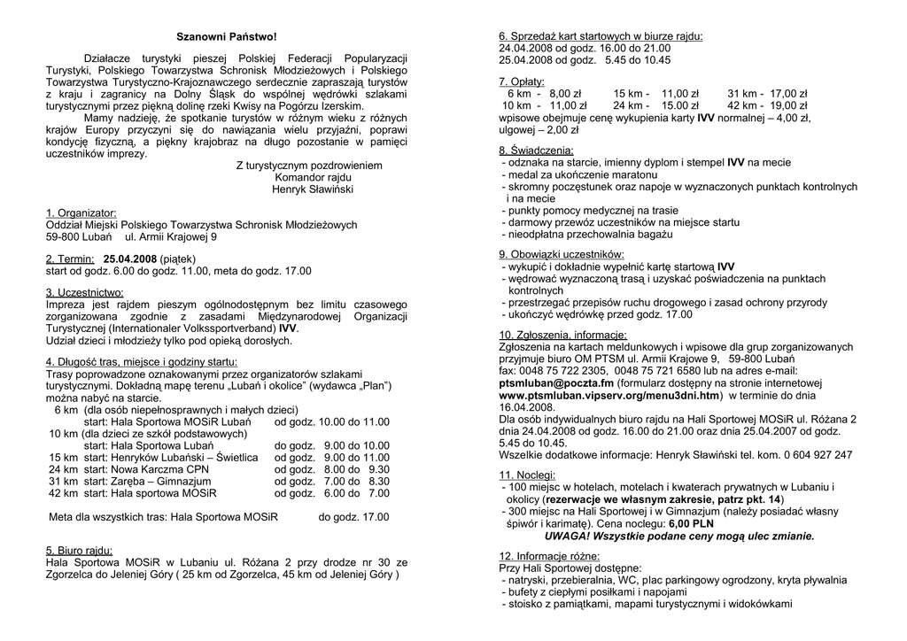 Szanowni Państwo! Działacze turystyki pieszej Polskiej Federacji Popularyzacji Turystyki, Polskiego Towarzystwa Schronisk Młodzieżowych i Polskiego Towarzystwa Turystyczno-Krajoznawczego serdecznie zapraszają turystów z kraju i zagranicy na Dolny Śląsk do wspólnej wędrówki szlakami turystycznymi przez piękną dolinę rzeki Kwisy na Pogórzu Izerskim. Mamy nadzieję, że spotkanie turystów w różnym wieku z różnych krajów Europy przyczyni się do nawiązania wielu przyjaźni, poprawi kondycję fizyczną, a piękny krajobraz na długo pozostanie w pamięci uczestników imprezy. Z turystycznym pozdrowieniem Komandor rajdu Henryk Sławiński 1. Organizator: Oddział Miejski Polskiego Towarzystwa Schronisk Młodzieżowych 59-800 Lubań ul. Armii Krajowej 9 2. Termin: 25.04.2008 (piątek) start od godz. 6.00 do godz. 11.00, meta do godz. 17.00 3. Uczestnictwo: Impreza jest rajdem pieszym ogólnodostępnym bez limitu czasowego zorganizowana zgodnie z zasadami Międzynarodowej Organizacji Turystycznej (Internationaler Volkssportverband) IVV. Udział dzieci i młodzieży tylko pod opieką dorosłych. 4. Długość tras, miejsce i godziny startu: Trasy poprowadzone oznakowanymi przez organizatorów szlakami turystycznymi. Dokładną mapę terenu „Lubań i okolice” (wydawca „Plan”) można nabyć na starcie. 6 km (dla osób niepełnosprawnych i małych dzieci) start: Hala Sportowa MOSiR Lubań od godz. 10.00 do 11.00 10 km (dla dzieci ze szkół podstawowych) start: Hala Sportowa Lubań do godz. 9.00 do 10.00 15 km start: Henryków Lubański – Świetlica od godz. 9.00 do 11.00 24 km start: Nowa Karczma CPN od godz. 8.00 do 9.30 31 km start: Zaręba – Gimnazjum od godz. 7.00 do 8.30 42 km start: Hala sportowa MOSiR od godz. 6.00 do 7.00 Meta dla wszystkich tras: Hala Sportowa MOSiR do godz. 17.00 5. Biuro rajdu: Hala Sportowa MOSiR w Lubaniu ul. Różana 2 przy drodze nr 30 ze Zgorzelca do Jeleniej Góry ( 25 km od Zgorzelca, 45 km od Jeleniej Góry ) 6. Sprzedaż kart startowych w biurze rajdu: 24.04.2008 od godz. 16.00 do 21.00 25.04.2008 od godz. 5.45 do 10.45 7. Opłaty: 6 km - 8,00 zł 15 km - 11,00 zł 31 km - 17,00 zł 10 km - 11,00 zł 24 km - 15.00 zł 42 km - 19,00 zł wpisowe obejmuje cenę wykupienia karty IVV normalnej – 4,00 zł, ulgowej – 2,00 zł 8. Świadczenia: - odznaka na starcie, imienny dyplom i stempel IVV na mecie - medal za ukończenie maratonu - skromny poczęstunek oraz napoje w wyznaczonych punktach kontrolnych i na mecie - punkty pomocy medycznej na trasie - darmowy przewóz uczestników na miejsce startu - nieodpłatna przechowalnia bagażu 9. Obowiązki uczestników: - wykupić i dokładnie wypełnić kartę startową IVV - wędrować wyznaczoną trasą i uzyskać poświadczenia na punktach kontrolnych - przestrzegać przepisów ruchu drogowego i zasad ochrony przyrody - ukończyć wędrówkę przed godz. 17.00 10. Zgłoszenia, informacje: Zgłoszenia na kartach meldunkowych i wpisowe dla grup zorganizowanych przyjmuje biuro OM PTSM ul. Armii Krajowe 9, 59-800 Lubań fax: 0048 75 722 2305, 0048 75 721 6580 lub na adres e-mail: [email protected] (formularz dostępny na stronie internetowej www.ptsmluban.vipserv.org/menu3dni.htm) w terminie do dnia 16.04.2008. Dla osób indywidualnych biuro rajdu na Hali Sportowej MOSiR ul. Różana 2 dnia 24.04.2008 od godz. 16.00 do 21.00 oraz dnia 25.04.2007 od godz. 5.45 do 10.45. Wszelkie dodatkowe informacje: Henryk Sławiński tel. kom. 0 604 927 247 11. Noclegi: - 100 miejsc w hotelach, motelach i kwaterach prywatnych w Lubaniu i okolicy (rezerwacje we własnym zakresie, patrz pkt. 14) - 300 miejsc na Hali Sportowej i w Gimnazjum (należy posiadać własny śpiwór i karimatę). Cena noclegu: 6,00 PLN UWAGA! Wszystkie podane ceny mogą ulec zmianie. 12. Informacje różne: Przy Hali Sportowej dostępne: - natryski, przebieralnia, WC, plac parkingowy ogrodzony, kryta pływalnia - bufety z ciepłymi posiłkami i napojami - stoisko z pamiątkami, mapami turystycznymi i widokówkami 13. Program dodatkowy: - uroczyste otwarcie imprezy o godz. 18.00 dnia 24.04.2008 - dla chętnych spotkanie towarzyskie przy muzyce w Motelu Łużyckim (1 km od Hali Sportowej) o godz. 19.30 dnia 24.04.2008 zapraszają na 14. Baza noclegowa: Rezerwacja noclegów we własnym zakresie (w nawiasie podano odległość od Hali Sportowej) "Motel Łużycki" – Lubań Pokoje Gościnne UM – Lubań Pokoje Gościnne P. Krystyna Golis – Lubań Bursa Szkolna – Lubań Kwatery Prywatne P. Koncka – Lubań Motel „Eureka” – Jałowiec Agroturystyka "Ponde Rosa" – Jałowiec Agroturystyka „Krystyna” – Nawojów Łużycki Hotel "Zaułek" – Olszyna Hotel "Leliva" – Leśna Hotel "Zamek Czocha" – Leśna OW „Baworowa” – Leśna OSW „Złoty Sen” – Złotniki Lubańskie OW „Gajówka” – Złoty Potok (1 km) (1 km) (1 km) (1 km) (2 km) (3 km) (5 km) (7 km) (9 km) (12 km) (15 km) (16 km) (18 km) (22 km) POLSKIE TOWARZYSTWO SCHRONISK MŁODZIEŻOWYCH POLSKA FEDERACJA POPULARYZACJI TURYSTYKI 0048 75 722 3946 0048 75 722 3781 0048 50 928 4442 0048 75 646 1809 0048 75 722 3022 0048 75 721 7613 0048 75 721 2320 0048 75 721 6794 0048 75 721 2588 0048 75 721 1129 0048 75 721 1553 0048 75 721 1244 0048 75 721 1392 0048 75 781 3216 Szanowni Państwo! VIII Rajd Pieszy IVV „Łużyckie Wędrówki” jest pierwszym dniem dużej międzynarodowej imprezy turystycznej organizowanej na terenie Euroregionu NYSA pod nazwą „3 Dni – 3 Kraje – 3 Wędrówki”. ♦ Dzień drugi tej imprezy według zasad IVV odbędzie się dnia 26.04.2008 w Górach Izerskich a organizatorem jest: Klub Czeskich Turystów CZ 46365 Nove Mesto pod Smrkem ul. Palackeho 280 tel. 00420 482 360 320 fax. 00420/ 482 325 358 e-mail: [email protected] internet: www.nmps.cz/turiste.php Dnia 25.04.2008 o godz. 16.30 i 17.30 organizator imprezy zapewnia odpłatny przewóz autokarami z Lubania (PL) do Novego Mesta pod Smrkem (CZ) - koszt przejazdu 8,00 PLN. 
