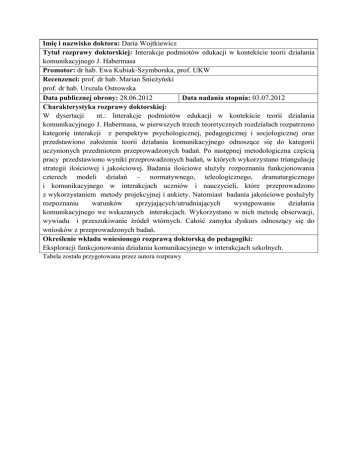 Imię i nazwisko doktora: Daria Wojtkiewicz Tytuł rozprawy doktorskiej: Interakcje podmiotów edukacji w kontekście teorii działania komunikacyjnego J. Habermasa Promotor: dr hab. Ewa Kubiak-Szymborska, prof. UKW Recenzenci: prof. dr hab. Marian Śnieżyński prof. dr hab. Urszula Ostrowska Data publicznej obrony: 28.06.2012 Data nadania stopnia: 03.07.2012 Charakterystyka rozprawy doktorskiej: W dysertacji nt.: Interakcje podmiotów edukacji w kontekście teorii działania komunikacyjnego J. Habermasa, w pierwszych trzech teoretycznych rozdziałach rozpatrzono kategorię interakcji z perspektyw psychologicznej, pedagogicznej i socjologicznej oraz przedstawiono założenia teorii działania komunikacyjnego odnoszące się do kategorii uczynionych przedmiotem przeprowadzonych badań. Po następnej metodologiczna częścią pracy przedstawiono wyniki przeprowadzonych badań, w których wykorzystano triangulację strategii ilościowej i jakościowej. Badania ilościowe służyły rozpoznaniu funkcjonowania czterech modeli działań – normatywnego, teleologicznego, dramaturgicznego i komunikacyjnego w interakcjach uczniów i nauczycieli, które przeprowadzono z wykorzystaniem metody projekcyjnej i ankiety. Natomiast badania jakościowe posłużyły rozpoznaniu warunków sprzyjających/utrudniających występowanie działania komunikacyjnego we wskazanych interakcjach. Wykorzystano w nich metodę obserwacji, wywiadu i przeszukiwanie źródeł wtórnych. Całość zamyka dyskurs odnoszący się do wniosków z przeprowadzonych badań. Określenie wkładu wniesionego rozprawą doktorską do pedagogiki: Eksploracji funkcjonowania działania komunikacyjnego w interakcjach szkolnych. Tabela została przygotowana przez autora rozprawy