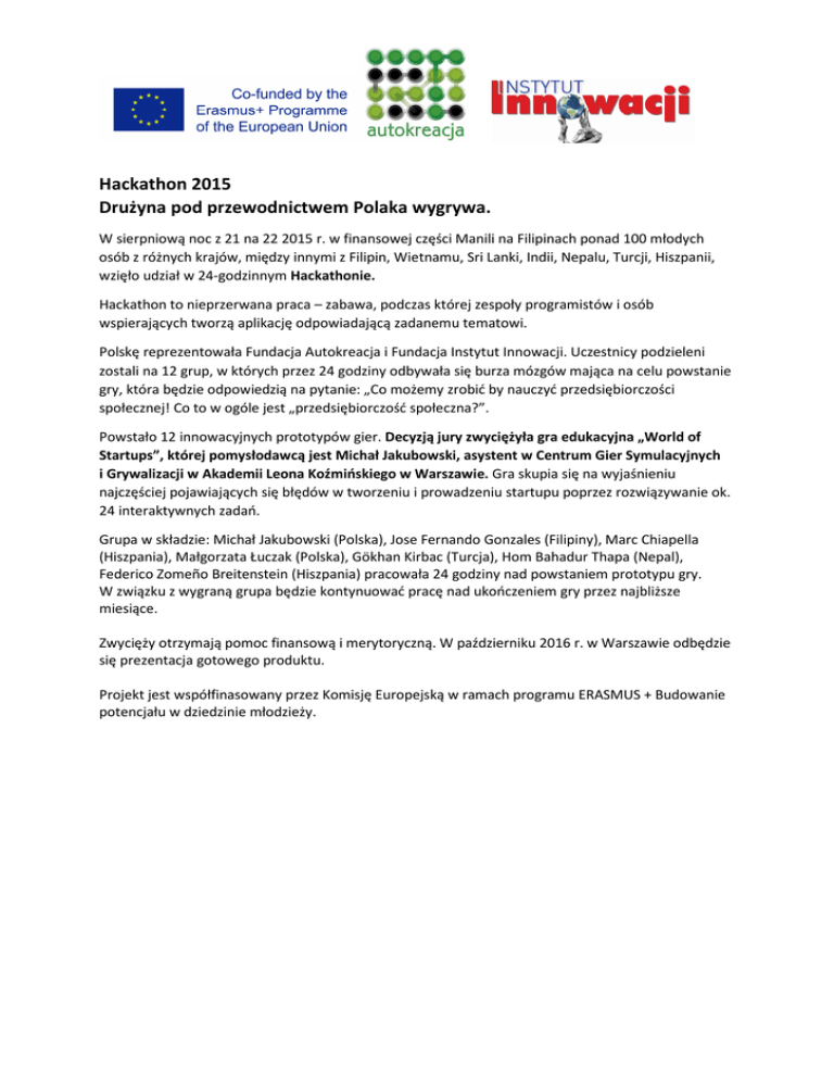 Hackathon 2015 Drużyna pod przewodnictwem Polaka wygrywa. W sierpniową noc z 21 na 22 2015 r. w finansowej części Manili na Filipinach ponad 100 młodych osób z różnych krajów, między innymi z Filipin, Wietnamu, Sri Lanki, Indii, Nepalu, Turcji, Hiszpanii, wzięło udział w 24-godzinnym Hackathonie. Hackathon to nieprzerwana praca – zabawa, podczas której zespoły programistów i osób wspierających tworzą aplikację odpowiadającą zadanemu tematowi. Polskę reprezentowała Fundacja Autokreacja i Fundacja Instytut Innowacji. Uczestnicy podzieleni zostali na 12 grup, w których przez 24 godziny odbywała się burza mózgów mająca na celu powstanie gry, która będzie odpowiedzią na pytanie: „Co możemy zrobić by nauczyć przedsiębiorczości społecznej! Co to w ogóle jest „przedsiębiorczość społeczna?”. Powstało 12 innowacyjnych prototypów gier. Decyzją jury zwyciężyła gra edukacyjna „World of Startups”, której pomysłodawcą jest Michał Jakubowski, asystent w Centrum Gier Symulacyjnych i Grywalizacji w Akademii Leona Koźmińskiego w Warszawie. Gra skupia się na wyjaśnieniu najczęściej pojawiających się błędów w tworzeniu i prowadzeniu startupu poprzez rozwiązywanie ok. 24 interaktywnych zadań. Grupa w składzie: Michał Jakubowski (Polska), Jose Fernando Gonzales (Filipiny), Marc Chiapella (Hiszpania), Małgorzata Łuczak (Polska), Gökhan Kirbac (Turcja), Hom Bahadur Thapa (Nepal), Federico Zomeño Breitenstein (Hiszpania) pracowała 24 godziny nad powstaniem prototypu gry. W związku z wygraną grupa będzie kontynuować pracę nad ukończeniem gry przez najbliższe miesiące. Zwycięży otrzymają pomoc finansową i merytoryczną. W październiku 2016 r. w Warszawie odbędzie się prezentacja gotowego produktu. Projekt jest współfinasowany przez Komisję Europejską w ramach programu ERASMUS + Budowanie potencjału w dziedzinie młodzieży.
