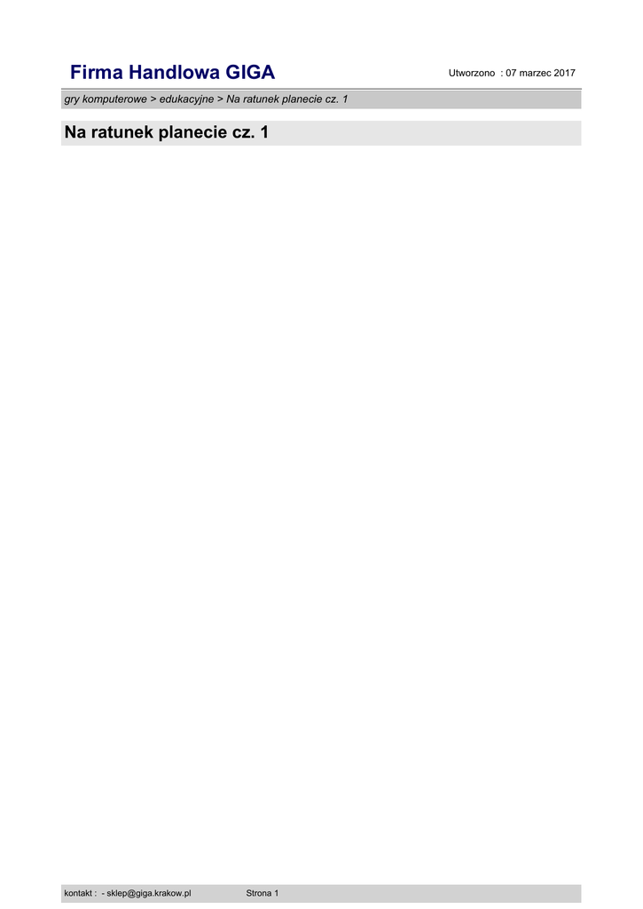 Firma Handlowa GIGA gry komputerowe > edukacyjne > Na ratunek planecie cz. 1 Na ratunek planecie cz. 1 kontakt : - [email protected] Strona 1 Utworzono : 07 marzec 2017 Firma Handlowa GIGA Utworzono : 07 marzec 2017 gry komputerowe > edukacyjne > Na ratunek planecie cz. 1 Na ratunek planecie cz. 1 Model : YDP000113 Producent : Young Digital Planet EduROM Przyroda „Na ratunek planecie” to interaktywna gra edukacyjna przygotowana w formie zabawy dla uczniów w wieku 10-13 lat. Oprócz wiedzy z dziedziny przyrody rozwija on także zdolność logicznego myślenia, łączenia faktów i wnioskowania oraz buduje świadomość ekologiczną u dzieci. Fabuła gry Zadaniem gracza, któremu towarzyszy zabawna postać globtrottera, udzielającego mu wskazówek i zachęcającego do dalszej nauki, jest uratowanie świata przed katastrofą ekologiczną. Każde poprawnie rozwiązane ćwiczenie oznacza „zdobycie” kolejnych elementów świata przyrody, służących do jego odbudowy. Przechodząc przez kolejne zagadnienia i rozwiązując ćwiczenia, uczeń odbudowuje zniszczony świat, a wykonanie wszystkich zadań przywróci światu harmonię i równowagę ekologiczną. Bogactwo zasobów multimedialnych Zagadnienia przyrodnicze zgromadzone w programie są przedstawione w atrakcyjnej formie animacji, ilustracji, symulacji procesów, pokazów zdjęć z narracją i filmów. Niezwykle atrakcyjna szata graficzna przyciąga uwagę uczniów, którzy poza nauką, z przyjemnością bawią się zadaniami i grami interaktywnymi, a więc łączą zabawę z nauką. Śledzenie postępów w nauce Program zawiera wiele ćwiczeń aktywizujących, takich jak: łączenie elementów, wybór wielokrotny, porządkowanie, wybór z listy, przenoszenie elementów w odpowiednie miejsca. Dają one możliwość automatycznej oceny poprawności rozwiązania. Uczeń może więc sam kontrolować swoje postępy w nauce, a także korzystać z podpowiedzi do ćwiczeń. Dodatkowe ułatwienia W grze użytkownik znajdzie niezwykle przydatne programy narzędziowe, które służą urozmaiceniu i uzupełnieniu materiału: Słowniczek - zbiór terminów z zakresu przyrody objaśnionych w przystępny sposób, który ułatwia posługiwanie się terminologią naukową bez konieczności zaglądania do innych źródeł, Galeria gatunków - zbiór krótkich opisów wybranych organizmów roślinnych i zwierzęcych, Biogramy - sylwetki osób, które wniosły znaczący wkład w rozwój wiedzy o przyrodzie, Mapy. Zakres zagadnień Część 1 skupia następujące tematy: Atmosfera: Ciało fizyczne, substancja, zjawisko - Pierwiastek i związek chemiczny - Powietrze - Pogoda - Optyka i akustyka - Klimat, Woda na Ziemi: Woda substancją życia - Przemiany wody na Ziemi - Morza i oceany - Jeziora, rzeki i lodowce - Zanieczyszczenia wód, Gleby, skały minerały: Ciała stałe Elektryczność i magnetyzm - Jak powstają gleby? - Niszczenie gleb. W części 2 znajdują się zagadnienia takie jak: Krajobrazy Ziemi: Historia badana Ziemi Rzeźba powierzchni Ziemi - Krajobrazy Ziemi, Fauna i flora: Cechy organizmów żywych - Fitogeografia - Zoogeografia - Klasyfikacja kontakt : - [email protected] Strona 2 Firma Handlowa GIGA Utworzono : 07 marzec 2017 gry komputerowe > edukacyjne > Na ratunek planecie cz. 1 Na ratunek planecie cz. 1 organizmów, Układ Słoneczny: Wszechświat - Ziemia w Układzie Słonecznym. Ciekawe zadania dla ucznia Cały produkt składa się z dwóch części. W części pierwszej gracz wykonuje następujące zadania: zaprowadza porządek w laboratorium, poprzez segregację substancji chemicznych; pilotuje samolot łapiący sondy meteorologiczne, które unoszą się w powietrzu wśród niebezpiecznych zjawisk atmosferycznych; łączy źródła zanieczyszczeń z urządzeniami do neutralizacji szkodliwych substancji; ratuje ocean, poprzez wyławianie beczek z odpadami chemicznymi, zanim trucizna przedostanie się do wody; buduje kanał, uwzględniając ukształtowanie terenu; testuje mikroorganizmy, które pomagają mu w oczyszczaniu ścieków; doprowadza chodnik kopalni do poszukiwanych złóż skał, tak wybierając miejsce, aby się nie zawalił; tworzy próbki idealnej gleby. W części drugiej uczeń: bierze udział w wyprawie do jaskini, aby zbadać jej stan i rozmiary; kompletuje zielnik z kwiatów i liści; ratuje astronautów unoszących się w przestrzeni kosmicznej. Gra edukacyjna Przyroda „Na ratunek planecie” to doskonały sposób na dobrą zabawę, owocną naukę i zaspokajanie ciekawości świata każdego dziecka. Cena : 59,90 zł Brutto ( 59,90 zł Netto) kontakt : - [email protected] Strona 3