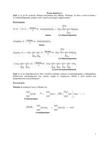Praca domowa 1 Zad. 1. (2 p) W syntezie Würtza otrzymano trzy alkany. Wiedząc, że dwa z nich to butan i 2,3-dimetylopentan, podać wzór i nazwę trzeciego węglowodoru. Rozwiązanie: butan 2,3-dimetylopentan butan 2,3-dimetylopentan 2,3,4,5-tetrametyloheksan Zad. 2. (5 p) Zaproponować dwie możliwe metody syntezy 2-metylopropanu z halogenków alkilowych zawierających trzy atomy węgla w cząsteczce. Która z tych metod jest preparatywnie korzystniejsza? Rozwiązanie: Metoda A (reakcja Corey’a-House’a): H3C Li CH Br H3C H3C CH Li H3C CuI H3C H3C CH CuLi 2 2-chloropropan CH3 Br H3C H3C H3C CH CH3 + CH CuLi + CuLi H3C 2-metylopropan 1 Metoda B (reakcja Wurtza): H3C CH Cl Na CH3 Cl + H3C H3C 2-chloropropan H3C H3C CH CH3 + H3C 2-metylopropan chlorometan CH CH CH3 CH3 + CH3 CH3 2,3-dimetylobutan etan Metoda A jest korzystniejsza, ponieważ w przeciwieństwie do reakcji Wurtza, pozwala na otrzymywanie niesymetrycznych alkanów bez domieszek innych alkanów jako produktów ubocznych. Zad. 3. (3 p) Podać wzór strukturalny i nazwę alkanu o wzorze sumarycznym C6H14 wiedząc, że w reakcji z chlorem w obecności promieniowania ultrafioletowego tworzy on dwie izomeryczne monochloropochodne. Rozwiązanie: CH3 H H3C C C H CH3 CH3 CH3 Cl CH3 H Cl2, hν H3C C C H CH3 H3C CH2Cl + C C H CH3 CH3 1-chloro-2,3-dimetylobutan 2-chloro-2,3-dimetylobutan 2,3-dimetylobutan Zad. 4. (5 p) Podać wzory wszystkich izomerycznych dimetylocyklopropanów oraz wskazać wśród nich pary enancjomerów i związki mezo. Rozwiązanie: CH3 CH3 CH3 H H CH3 H H H CH3 CH3 H CH3 CH3 1,1-dimetylocyklopropan achiralny cis-1,2-dimetylocyklopropan forma mezo trans-1,2-dimetylocyklopropan para enancjomerów Zad. 5. (3 p) Podać konfigurację absolutną centrów chiralności podanych związków: CH2OH (S) HOOC H CH3 A CH3 H (S) CHO CH2CH3 B H H3C NH2 CH3 OH H C 2 Rozwiązanie: 2 CH2OH 1 HOOC H 4 obrót o 120° 3 CH3 (S) 2 CH2OH 4 H H3C 3 1 COOH (S) A 3 CH3 4 H 3 CH3 1 CHO 4 H 1 CHO CH2CH3 2 (S) CH2CH3 2 (S) 2 CH3 4 H C2H5 3 1 CHO (S) B Aby określić konfigurację absolutną centrów chiralności we wzorze C, należy przekształcić wzór projekcyjny Newmanna we wzór perspektywiczny, wykonując następujące operacje: kierunek patrzenia (od góry) 3 H3C NH2 H H3C NH2 CH3 OH H3C H CH3 H C H 1 NH2 (R) 2 H 3 1 2 H3C OH (S) H OH Zad. 6. (2 p) Które z podanych wzorów rzutowych kwasu winowego odpowiadają konfiguracji formy mezo? OH COOH HOOC H HOOC OH H OH HO COOH HO COOH H OH H H OH HOOC OH HO COOH HOOC H HO H H H COOH H COOH A B C D E Rozwiązanie: W prawidłowo narysowanym wzorze rzutowym, w linii pionowej powinien znajdować się najdłuższy łańcuch węglowy. Wzory te uzyskuje się, wykonując następujące operacje: 3 OH HOOC (R) HOOC (R) HOOC OH OH HOOC OH A H COOH H H (S) HO OH COOH H HO H HO HO (S) H COOH OH COOH H HO (S) (S) COOH HO H (R) obrót do konformacji synperiplanarnej (R) H H COOH E (R) OH H HO H (R) (S) OH OH COOH H H (R) (S) OH OH COOH forma mezo H COOH H H OH OH obrót do konformacji synperiplanarnej COOH forma mezo COOH COOH OH COOH HO H (S) (S) H OH COOH COOH H OH HO (R) COOH COOH OH HOOC H OH H H OH HO OH COOH COOH H D HO obrót do konformacji synperiplanarnej OH OH H COOH COOH HOOC H HOOC H COOH C HOOC OH H H H COOH COOH COOH H OH COOH HO COOH B (R) H obrót do konformacji synperiplanarnej H H (R) H H COOH H obrót do konformacji synperiplanarnej COOH H COOH OH OH H HO (R) (R) OH H COOH COOH 4