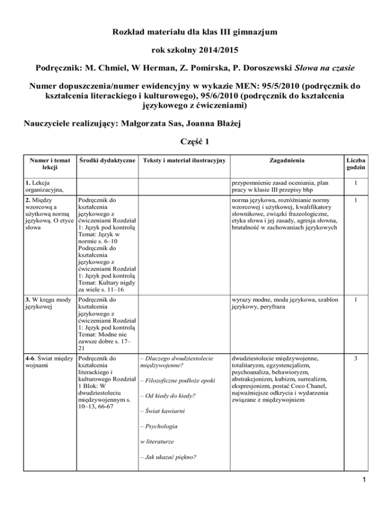 Rozkład materiału dla klas III gimnazjum rok szkolny 2014/2015 Podręcznik: M. Chmiel, W Herman, Z. Pomirska, P. Doroszewski Słowa na czasie Numer dopuszczenia/numer ewidencyjny w wykazie MEN: 95/5/2010 (podręcznik do kształcenia literackiego i kulturowego), 95/6/2010 (podręcznik do kształcenia językowego z ćwiczeniami) Nauczyciele realizujący: Małgorzata Sas, Joanna Błażej Część 1 Numer i temat lekcji Środki dydaktyczne Teksty i materiał ilustracyjny 1. Lekcja organizacyjna, Zagadnienia Liczba godzin przypomnienie zasad oceniania, plan pracy w klasie III przepisy bhp 1 2. Między wzorcową a użytkową normą językową. O etyce słowa Podręcznik do kształcenia językowego z ćwiczeniami Rozdział 1: Język pod kontrolą Temat: Język w normie s. 6–10 Podręcznik do kształcenia językowego z ćwiczeniami Rozdział 1: Język pod kontrolą Temat: Kultury nigdy za wiele s. 11–16 norma językowa, rozróżnianie normy wzorcowej i użytkowej, kwalifikatory słownikowe, związki frazeologiczne, etyka słowa i jej zasady, agresja słowna, brutalność w zachowaniach językowych 1 3. W kręgu mody językowej Podręcznik do kształcenia językowego z ćwiczeniami Rozdział 1: Język pod kontrolą Temat: Modne nie zawsze dobre s. 17– 21 wyrazy modne, moda językowa, szablon językowy, peryfraza 1 dwudziestolecie międzywojenne, totalitaryzm, egzystencjalizm, psychoanaliza, behawioryzm, abstrakcjonizm, kubizm, surrealizm, ekspresjonizm, postać Coco Chanel, najważniejsze odkrycia i wydarzenia związane z międzywojniem 3 4-6. Świat między Podręcznik do wojnami kształcenia literackiego i kulturowego Rozdział 1 Blok: W dwudziestoleciu międzywojennym s. 10–13, 66-67 – Dlaczego dwudziestolecie międzywojenne? – Filozoficzne podłoże epoki – Od kiedy do kiedy? – Świat kawiarni – Psychologia w literaturze – Jak ukazać piękno? 1 – Józef Rapacki, W Ziemiańskiej – Salvador Dalí, Trwałość pamięci – Wassily Kandinsky, Przekątna – Pablo Picasso, Trzej muzykanci – Ernest Ludwig Kirchner, Pięć kobiet na ulicy -Śladami epoki 7. Patriotyczny obowiązek dawniej i dziś Podręcznik do kształcenia literackiego i kulturowego Rozdział 1 Blok: W dwudziestoleciu międzywojennym s. 14–16 – Witold Barbacki, Mój najświętszy obowiązek Legiony Polskie, dziennik 1 Skamander, kawiarnia artystyczna, snobizm 1 – Christopher Richard Wynne Nevinson, Ścieżki chwały 8. Miejsce, gdzie powstają wiersze Podręcznik do – Andrzej Zawada, Atmosfera kształcenia artystyczna literackiego i kulturowego Rozdział 1 Blok: Co zostało z tamtych lat... s. 32–33 9. Poezja skamandrytów Podręcznik – Kazimierz Wierzyński, Zielono postać Kazimierza Wierzyńskiego, dokształcenia mam w głowie Skamander, przerzutnia poetycka, liryka literackiego i bezpośrednia kulturowego Rozdział 1 Blok: W dwudziestoleciu międzywojennym s. 17 1 10. i 12. Krytyczny obraz mieszczaństwa Podręcznik – Julian Tuwim, Mieszkańcy oraz postać Juliana Tuwima, prozaizm, wiersz dokształcenia inne wybrane wiersze sylabiczny, średniówka, konsumpcjonizm literackiego i kulturowego Rozdział 1 Blok: W dwudziestoleciu międzywojennym s. 18–19 3 13. O poezji kobiecej Podręcznik do – Maria Pawlikowskakształcenia Jasnorzewska, Miłość oraz inne literackiego i wybrane wiersze kulturowego Rozdział 1 Blok: W dwudziestoleciu międzywojennym s. 21 Szkolny słownik terminów literackich postać Marii PawlikowskiejJasnorzewskiej, miniatura poetycka, poezja miłosna, epigramat 14 - 15. Spotkanie z Awangardą Krakowską i futuryzmem Podręcznik do – Julian Przyboś, Gmachy, kształcenia poezja futurystów literackiego i kulturowego Rozdział 1 Blok: W dwudziestoleciu postać Juliana Przybosia, awangarda, Awangarda Krakowska, wiersz wolny 1(2) 2 2 międzywojennym s. 22 Słownik języka polskiego 16-17. Zjesieniałe zmrocze, czyli o neologizmach poetyckich Podręcznik do kształcenia literackiego i kulturowego Rozdział 1 Blok: W dwudziestoleciu międzywojennym s. 23 18. Przyjaźń – uczucie, o które warto zabiegać postać Bolesława Leśmiana, neologizmy poetyckie 2 Podręcznik – Maria Dąbrowska, Prawdziwy dokształcenia przyjaciel literackiego i kulturowego Rozdział 1 Blok: W dwudziestoleciu międzywojennym s. 24–26 postać Marii Dąbrowskiej, powieść psychologiczna, opowiadanie psychologiczne, analiza psychologiczna 1 19. Wariacje na temat jazzu Podręcznik do – Debra Hurd, Dziki jazz kształcenia literackiego i – Tadeusz Makowski, Jazz kulturowego Rozdział 1 Blok: Co zostało z tamtych lat... s. 30–31 jazz, gama barwna 1 20. Mały, szary człowiek Podręcznik do – Andrzej Bursa, Uwaga dramat sytuacja liryczna, bohater liryczny, środki kształcenia stylistyczne literackiego i – Alfons Karpiński, Ulica kulturowego Rozdział paryska 1 Blok: Co zostało z tamtych lat... s. 34 1 21. Miłość i śmierć – siostry dwie Podręcznik do – Mirosław Kuźniak, Lechoń kształcenia literackiego i – Edward Munch, Taniec życia kulturowego Rozdział 1 Blok: Co zostało z tamtych lat... s. 35 Słownik symboli 1 22-23. Zrozumieć Podręcznik do surrealizm... kształcenia literackiego i kulturowego Rozdział 1 Blok: Co zostało z tamtych lat... s. 37–39 – Bolesław Leśmian, *** [Wyszło z boru ślepawe, zjesieniałe zmrocze] oraz inne wybrane wiersze obraz poetycki, zasada kontrastu – Boris Vian, Niezwykła podróż, postać Borisa Viana, surrealizm, własne pomysły surrealistyczne elementy świata przedstawionego, uczniów – wypracowanie absurd, komizm „Surrealistyczny sen” 2 24. Tworzenie wyrazów Podręcznik dokształcenia językowego z ćwiczeniami Rozdział 2: W fabryce słów Temat: Wyraz od podstaw s. 26–31 podstawa słowotwórcza, wyraz pochodny, wyrazy niepodzielne słowotwórczo, rodzina wyrazów, rdzeń, wyrazy pokrewne, zasady pisowni wyrazów zakończonych na -aż i -arz 1 25. Jakie tajemnice skrywa rodzinny dom? Podręcznik do – Ha