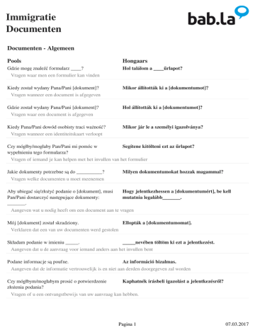 Immigratie Documenten Documenten - Algemeen Pools Hongaars Gdzie mogę znaleźć formularz ____? Vragen waar men een formulier kan vinden Hol találom a ____űrlapot? Kiedy został wydany Pana/Pani [dokument]? Vragen wanneer een document is afgegeven Mikor állították ki a [dokumentumot]? Gdzie został wydany Pana/Pani [dokument]? Vragen waar een document is afgegeven Hol állították ki a [dokumentumot]? Kiedy Pana/Pani dowód osobisty traci ważność? Vragen wanneer een identiteitskaart verloopt Mikor jár le a személyi igazolványa? Czy mógłby/mogłaby Pan/Pani mi pomóc w Segítene kitölteni ezt az űrlapot? wypełnieniu tego formularza? Vragen of iemand je kan helpen met het invullen van het formulier Jakie dokumenty potrzebne są do __________? Vragen welke documenten u moet meenemen Milyen dokumentumokat hozzak magammal? Aby ubiegać się/złożyć podanie o [dokument], musi Hogy jelentkezhessen a [dokumentumért], be kell Pan/Pani dostarczyć następujące dokumenty: mutatnia legalább_______. _______. Aangeven wat u nodig heeft om een document aan te vragen Mój [dokument] został skradziony. Ellopták a [dokumentumomat]. Verklaren dat een van uw documenten werd gestolen Składam podanie w imieniu _____. _____nevében töltöm ki ezt a jelentkezést. Aangeven dat u de aanvraag voor iemand anders aan het invullen bent Podane informacje są poufne. Az információ bizalmas. Aangeven dat de informatie vertrouwelijk is en niet aan derden doorgegeven zal worden Czy mógłbym/mogłabym prosić o potwierdzenie Kaphatnék írásbeli igazolást a jelentkezésről? złożenia podania? Vragen of u een ontvangstbewijs van uw aanvraag kan hebben. Pagina 1 07.03.2017 Immigratie Documenten Documenten - Persoonlijke informatie Pools Hongaars Jak się Pan/Pani nazywa? Vragen naar iemand zijn naam Hogy hívják? Czy mógłby/mogłaby Pan/Pani podać swoją datę i Mikor és hol született? miejsce urodzenia? Vragen naar iemand zijn geboorteplaats en geboortedatum Gdzie Pan/Pani mieszka? Vragen waar iemand woont Hol lakik? Jaki jest Pana/Pani adres? Naar iemand zijn adres vragen Mi a címe? Jakie posiada Pana/Pani obywatelstwo? Vragen naar de nationaliteit van iemand Mi az állampolgársága? Kiedy przyjechał/a Pan/Pani do [nazwa kraju]? Vragen wanneer iemand is aangekomen in dat land Mikor érkezett [országba]? Czy mógłbym/mogłabym zobaczyć Pana/Pani dowód osobisty? Iemand vragen om zijn identiteitskaart te tonen Kérem, mutassa meg a személyi igazolványát. Documenten - Gezinssituatie Pools Hongaars Mój stan cywilny: _____. Aangeven wat uw burgerlijke staat is A családi állapotom ___________. kawaler/panna Burgerlijke staat egyedülálló/hajadon/nőtlen żonaty/zamężna Burgerlijke staat házas Pagina 2 07.03.2017 Immigratie Documenten w separacji Burgerlijke staat külön él a házastársától rozwodnik/rozwódka Burgerlijke staat elvált w konkubinacie Burgerlijke staat élettársi kapcsolatban van w rejestrowanym związku partnerskim Burgerlijke staat regisztrált élettársi kapcsolatban van w związku partnerskim Burgerlijke staat élettársi kapcsolatban van w związku partnerskim (ze wspólnym gospodarstwem domowym) Burgerlijke staat élettársi kapcsolatban van wdowiec/wdowa Burgerlijke staat özvegy Czy ma Pan/Pani dzieci? Vragen of iemand kinderen heeft Vannak gyermekei? Czy mieszka Pan/Pani z osobami na Pana/Pani Élnek önnel eltartottak? utrzymaniu? Vragen of iemand financiële ondersteuning geeft aan inwonenden Chciałbym/Chciałabym skorzystać z prawa do Szeretném egyesíteni a családomat. łączenia rodzin. Verklaren dat u de intentie heeft om zich te verenigen met uw familie Documenten - Aanmelding bij de stad Pools Hongaars Chciałbym/Chciałabym się zameldować (w nowym Szeretnék regisztrálni. miejscu zamieszkania). Verklaren dat u zich graag wilt registreren als nieuwkomer bij de stad Pagina 3 07.03.2017 Immigratie Documenten Jakie dokumenty wymagane są do meldunku? Vragen welke documenten die u moet meenemen Milyen dokumentumokat kell magammal hoznom? Czy za meldunek pobierana jest opłata? Vragen of er registratiekosten zijn Van regisztrációs díj? Chciałbym/Chciałabym zameldować się na pobyt stały. Verklaren dat u uw woonplaats wil registreren Szeretném regisztrálni a lakhelyem. Chciałbym/Chciałabym prosić o wydanie Szeretnék erkölcsi bizonyítványt kérni. zaświadczenia o niekaralności. Verklaren dat u een attest van goed gedrag en zeden wil aanvragen Chciałbym/Chciałabym złożyć podanie o Szeretnék tartózkodási engedélyt igényelni. zezwolenie na pobyt stały. Verklaren dat u graag een verblijfsvergunning wil aanvragen Documenten - Ziektekostenverzekering Pools Hongaars Mam kilka pytań dotyczących ubezpieczenia Lenne pár kérdésem az egészségbiztosítással zdrowotnego. kapcsolatban. Verklaren dat u enkele vragen heeft over de ziektekostenverzekering Czy muszę wykupić prywatne ubezpieczenie Szükséges magán egészségbiztosítást kötni? zdrowotne? Vragen of u een particuliere ziektekostenverzekering nodig heeft Co obejmuje to ubezpieczenie zdrowotne? Vragen naar wat de ziektekostenverzekering dekt Mit fedez a biztosítás? Opłaty za pobyt w szpitalu Kórházi költségek Voorbeeld van gedekte kosten door de ziektekostenverzekering Opłaty za konsultacje u specjalistów Szakorvos Voorbeeld van gedekte kosten door de ziektekostenverzekering Pagina 4 07.03.2017 Immigratie Documenten Badania diagnostyczne Diagnosztikai vizsgálatok Voorbeeld van gedekte kosten door de ziektekostenverzekering Zabiegi chirurgiczne Műtéti beavatkozás Voorbeeld van gedekte kosten door de ziektekostenverzekering Leczenie psychiatryczne Pszichiátriai kezelés Voorbeeld van gedekte kosten door de ziektekostenverzekering Leczenie stomatologiczne Fogorvosi kezelés Voorbeeld van gedekte kosten door de ziektekostenverzekering Leczenie okulistyczne Szemészeti kezelés Voorbeeld van gedekte kosten door de ziektekostenverzekering D
