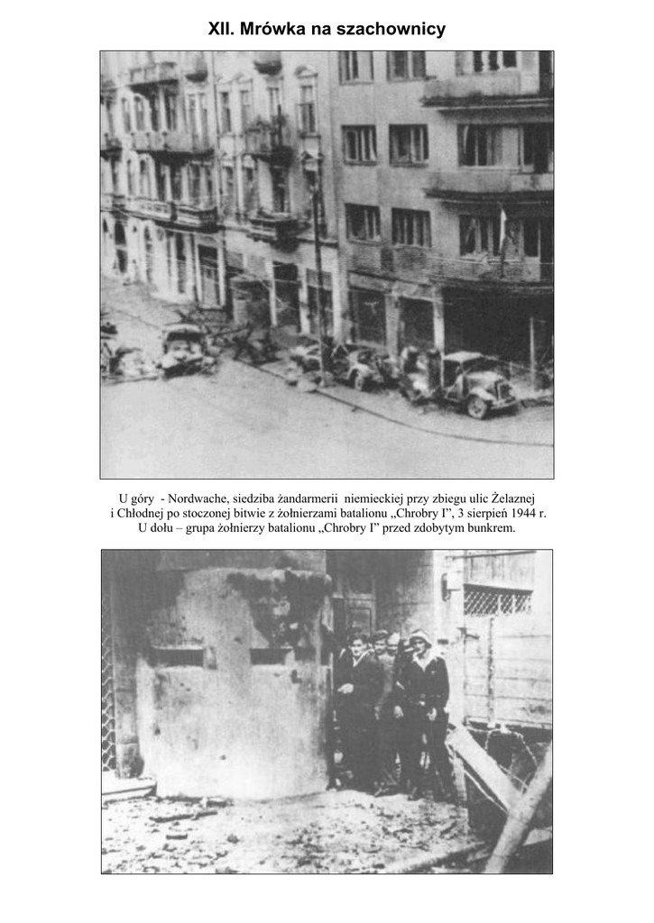 XII. Mrówka na szachownicy U góry - Nordwache, siedziba żandarmerii niemieckiej przy zbiegu ulic Żelaznej i Chłodnej po stoczonej bitwie z żołnierzami batalionu „Chrobry I”, 3 sierpień 1944 r. U dołu – grupa żołnierzy batalionu „Chrobry I” przed zdobytym bunkrem.