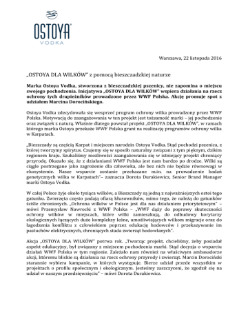 Warszawa, 22 listopada 2016 „OSTOYA DLA WILKÓW” z pomocą bieszczadzkiej naturze Marka Ostoya Vodka, stworzona z bieszczadzkiej pszenicy, nie zapomina o miejscu swojego pochodzenia. Inicjatywa „OSTOYA DLA WILKÓW” wspiera działania na rzecz ochrony tych drapieżników prowadzone przez WWF Polska. Akcję promuje spot z udziałem Marcina Dorocińskiego. Ostoya Vodka zdecydowała się wesprzeć program ochrony wilka prowadzony przez WWF Polska. Motywacją do zaangażowania w ten projekt jest tożsamość marki – jej pochodzenie oraz związek z naturą. Właśnie dlatego powstał projekt „OSTOYA DLA WILKÓW”, w ramach którego marka Ostoya przekaże WWF Polska grant na realizację programów ochrony wilka w Karpatach. „Bieszczady są częścią Karpat i miejscem narodzin Ostoya Vodka. Stąd pochodzi pszenica, z której tworzymy spirytus. Czujemy się w sposób naturalny związani z tym pięknym, dzikim regionem kraju. Szukaliśmy możliwości zaangażowania się w istniejący projekt chroniący przyrodę. Okazało się, że z działaniami WWF Polska jest nam bardzo po drodze. Wilki są ciągle postrzegane jako zagrożenie dla człowieka, ale bez nich nie będzie równowagi w ekosystemie. Nasze wsparcie zostanie przekazane m.in. na prowadzenie badań genetycznych wilka w Karpatach”– zaznacza Dorota Durakiewicz, Senior Brand Manager marki Ostoya Vodka. W całej Polsce żyje około tysiąca wilków, a Bieszczady są jedną z najważniejszych ostoi tego gatunku. Zwierzęta często padają ofiarą kłusowników, mimo tego, że należą do gatunków ściśle chronionych. „Ochrona wilków w Polsce jest dla nas działaniem priorytetowym” – mówi Przemysław Nawrocki z WWF Polska – „WWF dąży do poprawy skuteczności ochrony wilków w miejscach, które wilki zamieszkują, do odbudowy korytarzy ekologicznych łączących duże kompleksy leśne, umożliwiających wilkom migracje oraz do łagodzenia konfliktu z człowiekiem poprzez edukację hodowców i przekazywanie im pastuchów elektrycznych, chroniących stada zwierząt hodowlanych”. Akcja „OSTOYA DLA WILKÓW” potrwa rok. „Tworząc projekt, chcieliśmy, żeby posiadał aspekt edukacyjny, był związany z miejscem pochodzenia marki. Stąd decyzja o wsparciu działań WWF Polska w tym regionie. Zależało nam również na właściwym ambasadorze akcji, któremu bliskie są działania na rzecz ochrony przyrody i zwierząt. Marcin Dorociński starannie wybiera kampanie, w których występuje. Bierze udział przede wszystkim w projektach o profilu społecznym i ekologicznym. Jesteśmy zaszczyceni, że zgodził się na udział w naszym przedsięwzięciu” – mówi Dorota Durakiewicz. Marcin Dorociński pojawia się w minutowym spocie promującym projekt „OSTOYA DLA WILKÓW” – jest bohaterem i narratorem filmu. Zobacz film: http://ostoyavodka.com/#wolfs Za koncepcję, kreację i realizację kampanii, w tym: współpracę z WWF Polska i Marcinem Dorocińskim, produkcję spotu, sesję fotograficzną oraz przygotowanie materiałów kreatywnych komunikujących akcję odpowiada Agencja IQ Marketing. Natomiast za działania PR Rc2 Raczkiewicz Chenczke Consultants. Więcej informacji: http://ostoyavodka.com *** ZAANGAŻOWANIE SPOŁECZNE GRUPY WYBOROWA PERNOD RICARD Wyborowa Pernod Ricard, właściciel marki Ostoya Vodka, podejmuje działania, które mają na celu odpowiedzialny rozwój biznesu z poszanowaniem dla środowiska naturalnego, chroniącego bioróżnorodność i pozwalającego oszczędzać wodę i energię. Ten kierunek rozwoju, przyjęty globalnie, ma odzwierciedlenie w działaniach, które mają miejsce w Polsce. Przykładowo, jednym z najważniejszych aspektów modernizacji kolumny destylacyjnej w zakładach produkcyjnych w Poznaniu, było nie tylko poprawienie jakości wytwarzanego spirytusu, ale również troska o ograniczenie emisji zanieczyszczeń i zużycia energii. Szczegóły: http://wyborowa-pernod-ricard.com/pl/csr *** Więcej informacji: Krystyna Rappe-Niemirska PR Specialist [email protected] +48 696 477 350 Emilia Cieniuch PR Consultant [email protected] +48 508 000 561