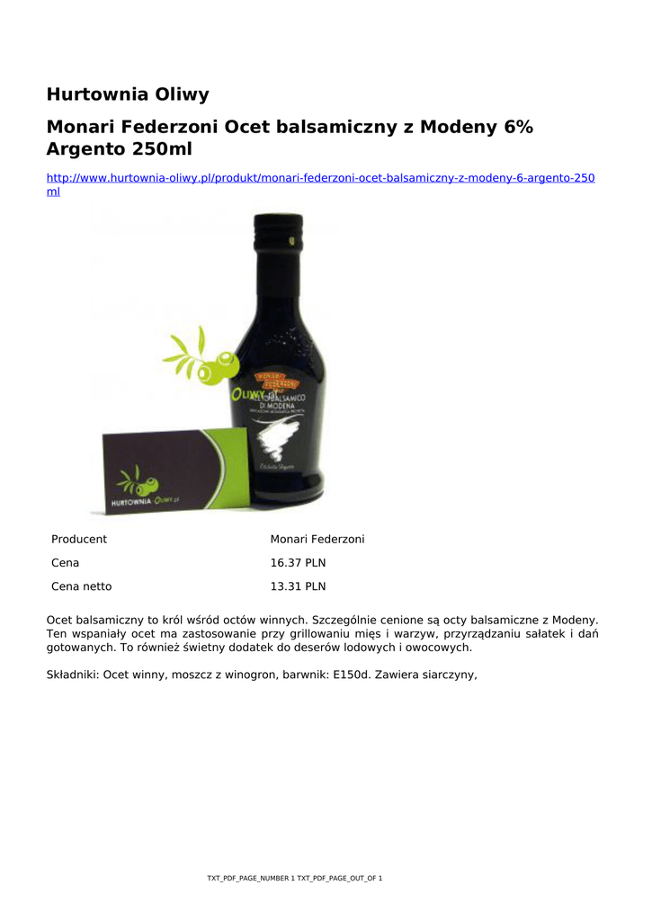Hurtownia Oliwy Monari Federzoni Ocet balsamiczny z Modeny 6% Argento 250ml http://www.hurtownia-oliwy.pl/produkt/monari-federzoni-ocet-balsamiczny-z-modeny-6-argento-250 ml Producent Monari Federzoni Cena 16.37 PLN Cena netto 13.31 PLN Ocet balsamiczny to król wśród octów winnych. Szczególnie cenione są octy balsamiczne z Modeny. Ten wspaniały ocet ma zastosowanie przy grillowaniu mięs i warzyw, przyrządzaniu sałatek i dań gotowanych. To również świetny dodatek do deserów lodowych i owocowych. Składniki: Ocet winny, moszcz z winogron, barwnik: E150d. Zawiera siarczyny, TXT_PDF_PAGE_NUMBER 1 TXT_PDF_PAGE_OUT_OF 1