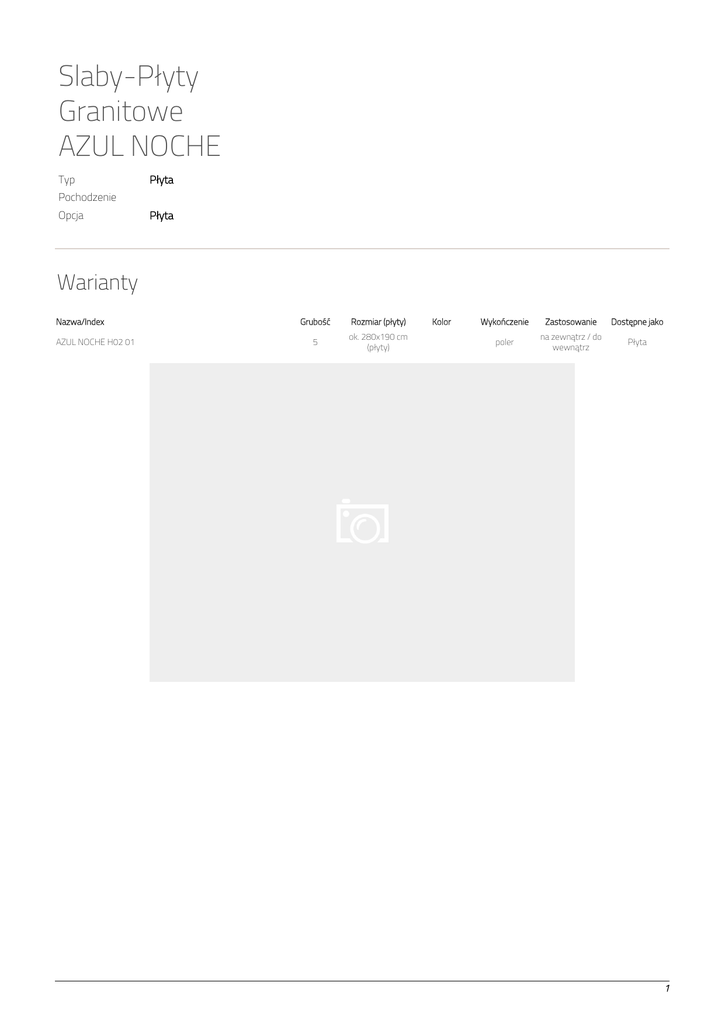 Slaby-Płyty Granitowe AZUL NOCHE Typ Płyta Pochodzenie Opcja Płyta Warianty Nazwa/Index AZUL NOCHE H02 01 Grubość Rozmiar (płyty) 5 ok. 280x190 cm (płyty) Kolor Wykończenie Zastosowanie Dostępne jako poler na zewnątrz / do wewnątrz Płyta 1