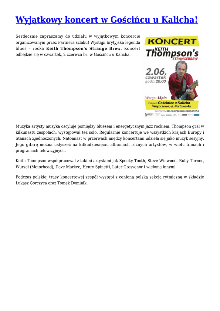 Wyjątkowy koncert w Gościńcu u Kalicha! Serdecznie zapraszamy do udziału w wyjątkowym koncercie organizowanym przez Partnera szlaku! Wystąpi brytyjska legenda blues – rocka Keith Thompson’s Strange Brew. Koncert odbędzie się w czwartek, 2 czerwca br. w Gościńcu u Kalicha. Muzyka artysty muzyka oscyluje pomiędzy bluesem i energetycznym jazz rockiem. Thompson grał w kilkunastu zespołach, występował też solo. Regularnie koncertuje we wszystkich krajach Europy i Stanach Zjednoczonych. Natomiast w przerwach między koncertami udziela się jako muzyk sesyjny. Jego gitarę można usłyszeć na kilkudziesięciu albumach różnych artystów, w wielu filmach i programach telewizyjnych. Keith Thompson współpracował z takimi artystami jak Spooky Tooth, Steve Winwood, Ruby Turner, Wurzel (Motorhead), Dave Markee, Henry Spinetti, Luter Grosvenor i wieloma innymi. Podczas polskiej trasy koncertowej zespół wystąpi z cenioną polską sekcją rytmiczną w składzie Łukasz Gorczyca oraz Tomek Dominik.